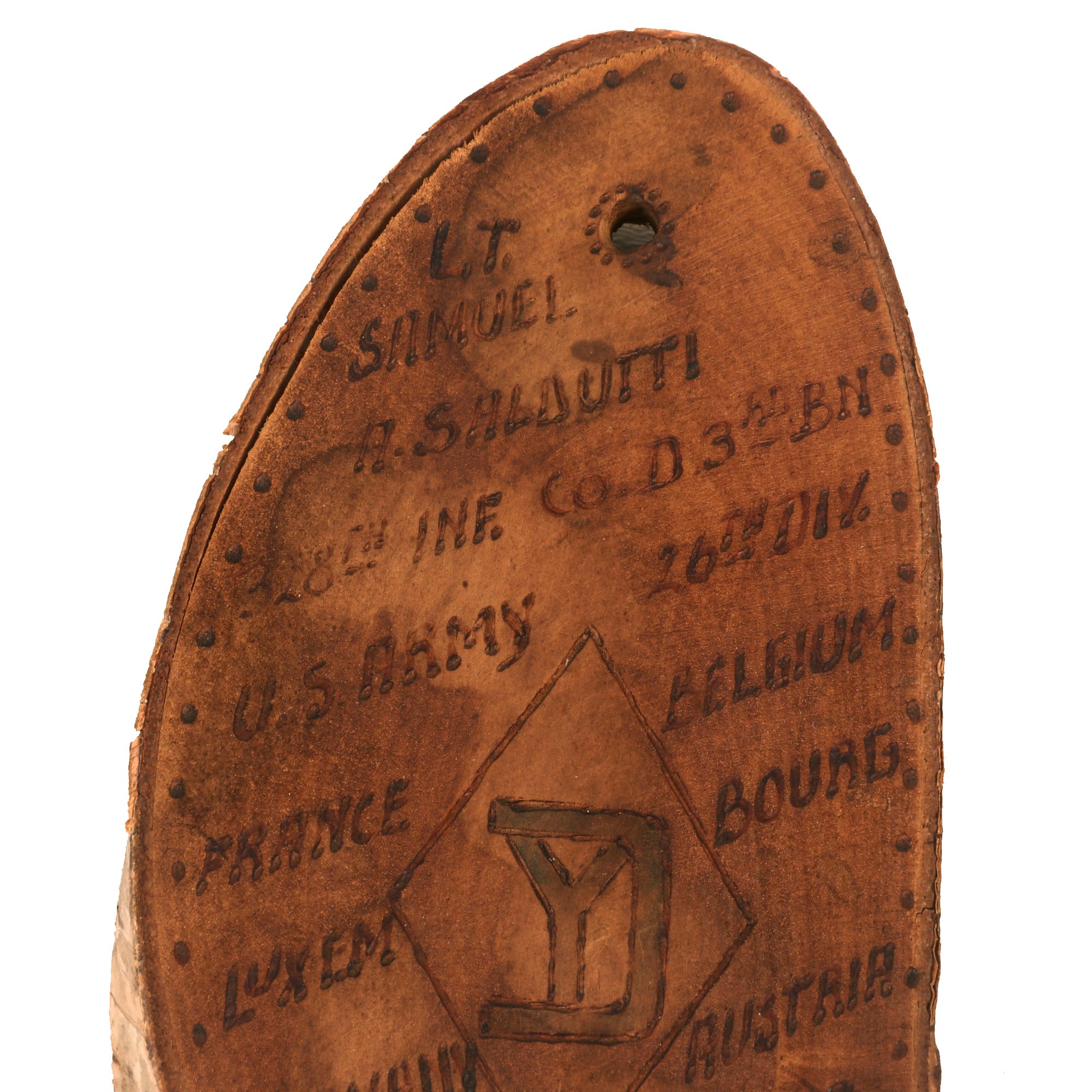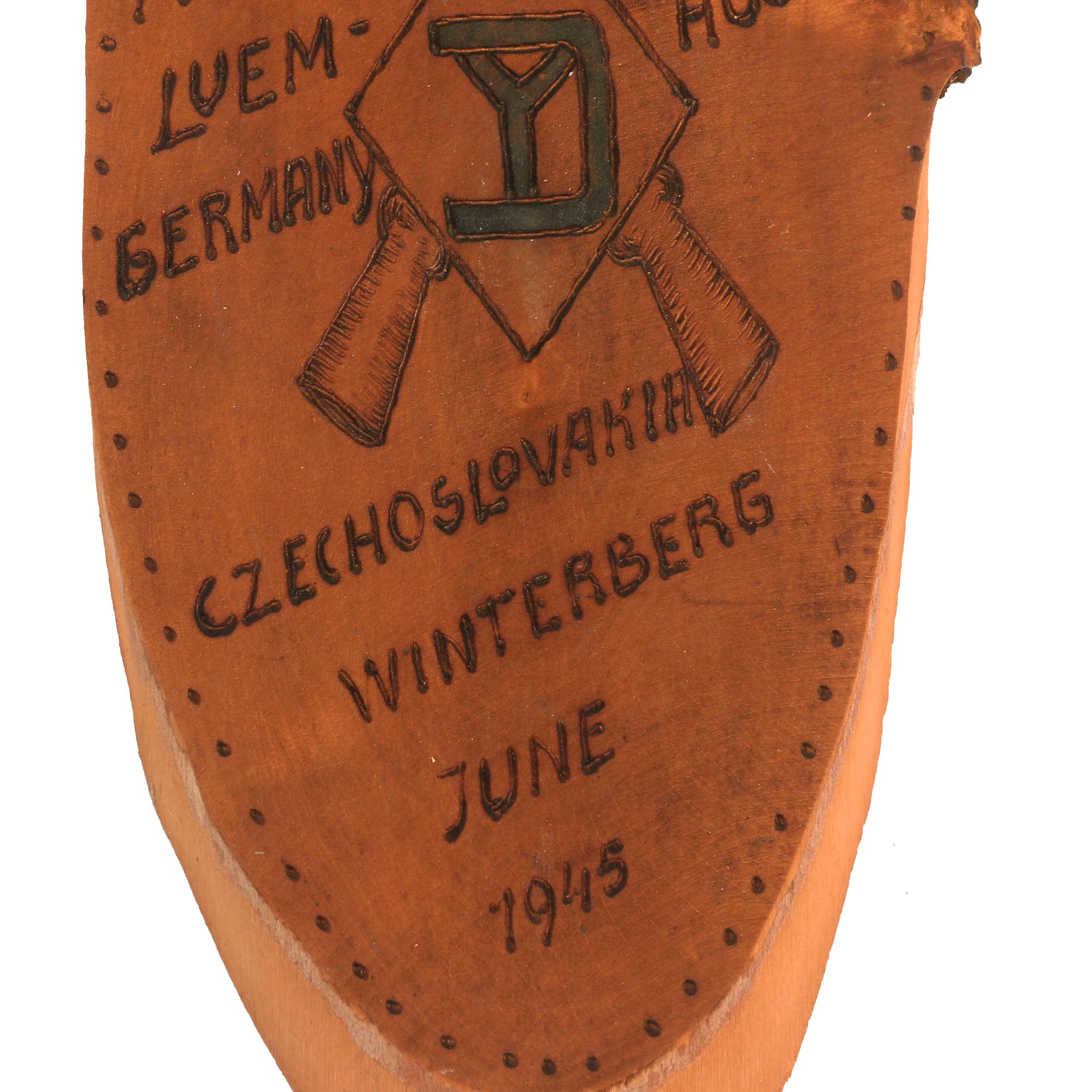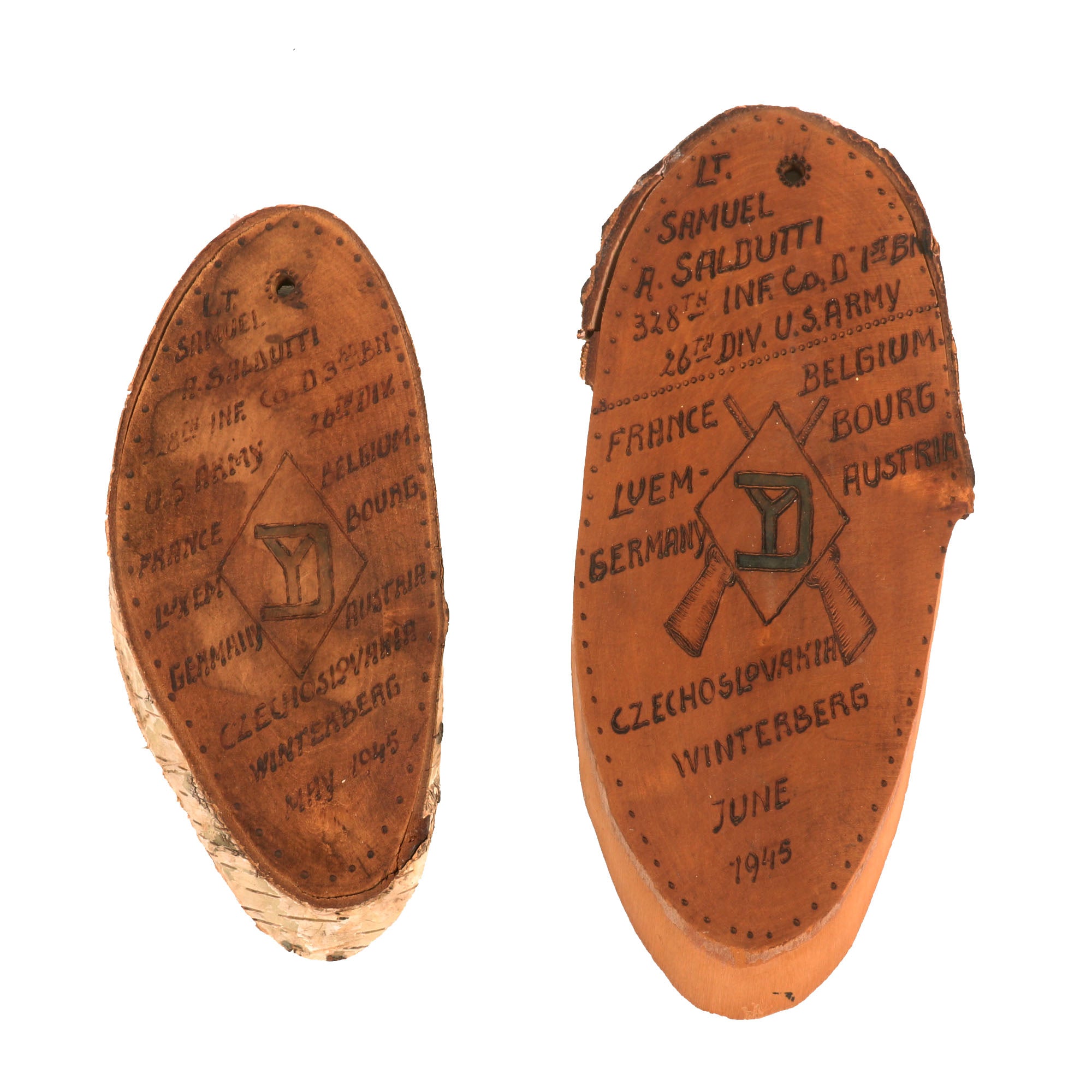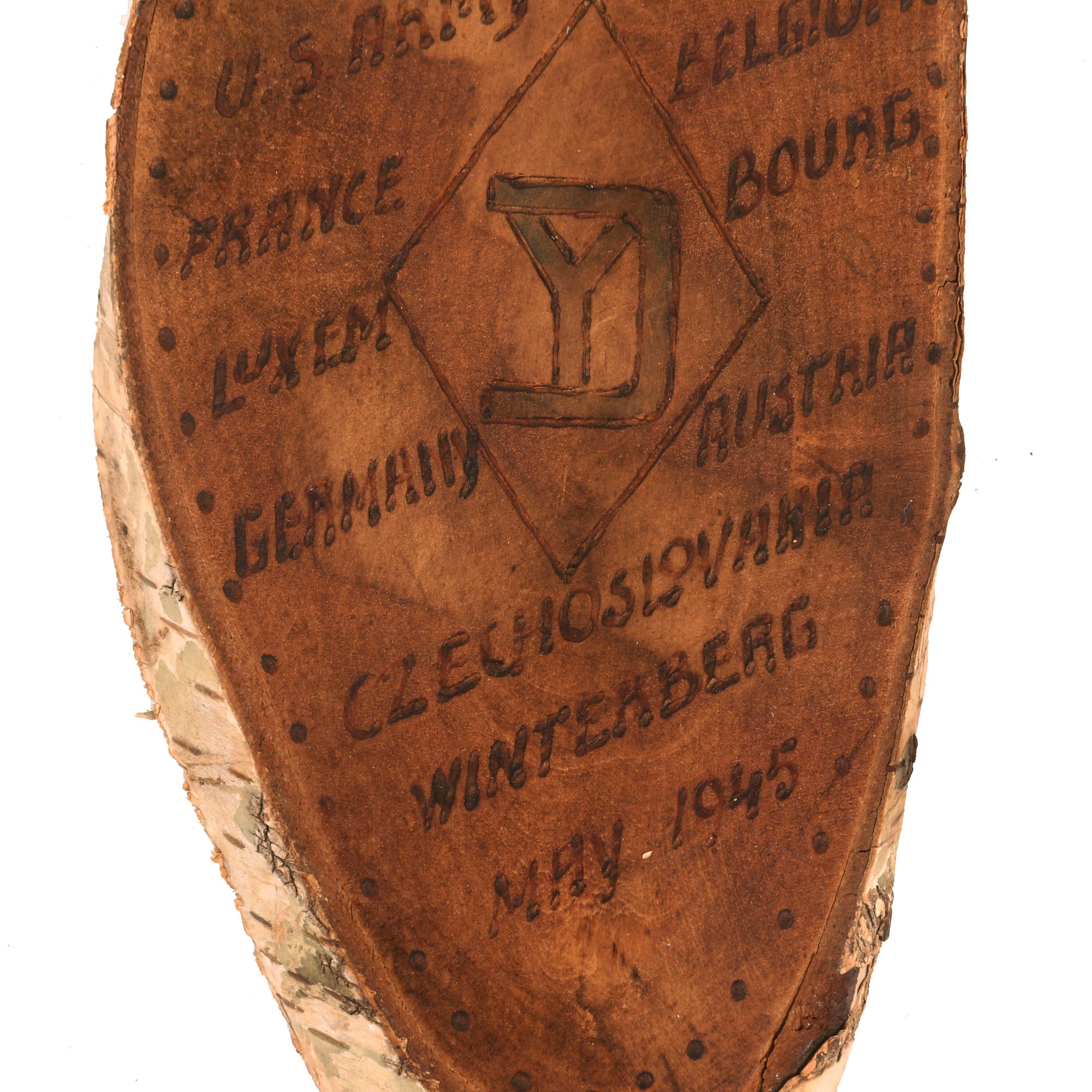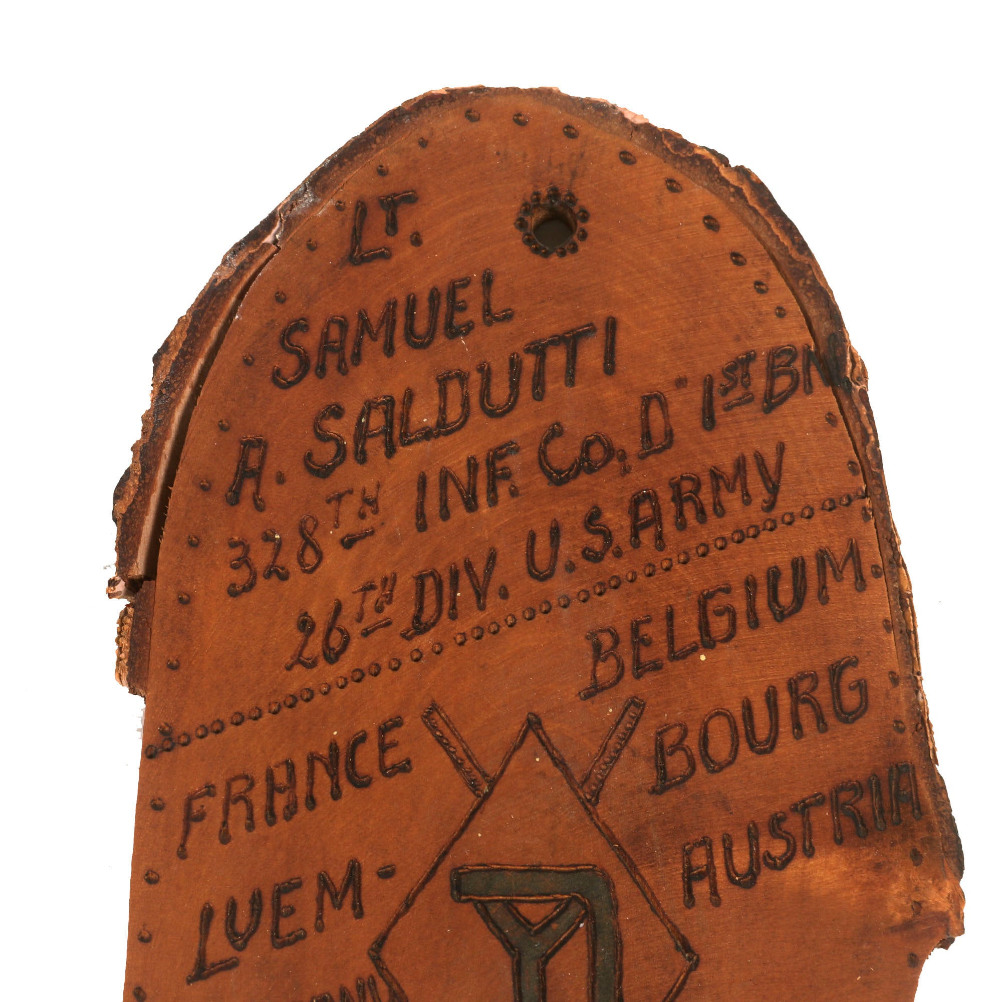 - Wood-burnt piece of a tree, likely a Birch tree, measuring 8 x 3½”, which is named to Saldutti and lists his unit and locations traveled, dated MAY 1945.