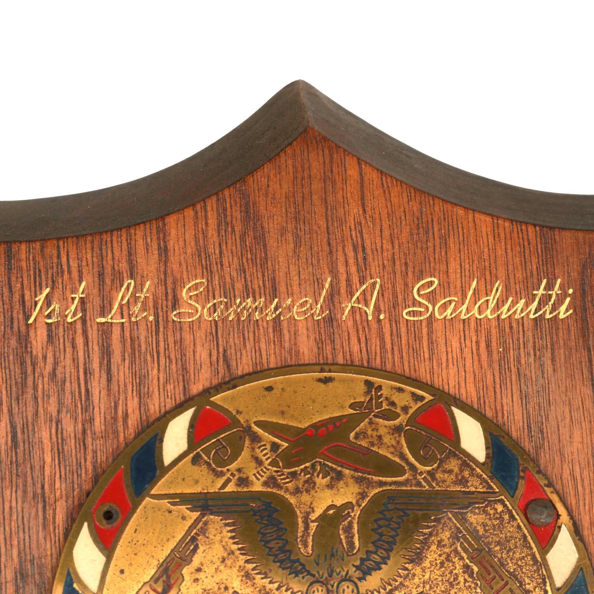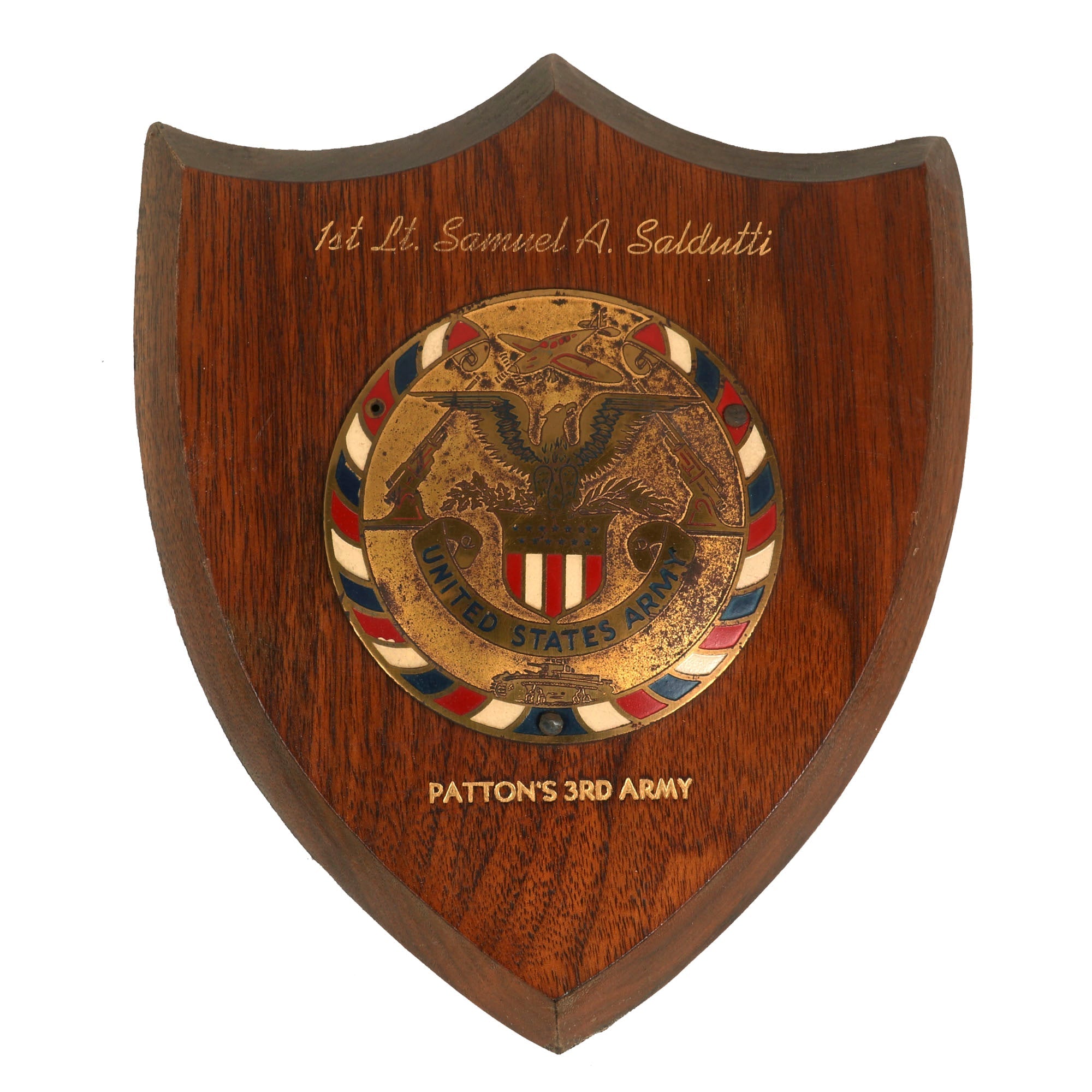 - A small plaque measuring 7¾ x 6½” reading 1ST LT. SAMUEL A. SALDUTTI PATTON’S 3RD ARMY with a plate in the middle.