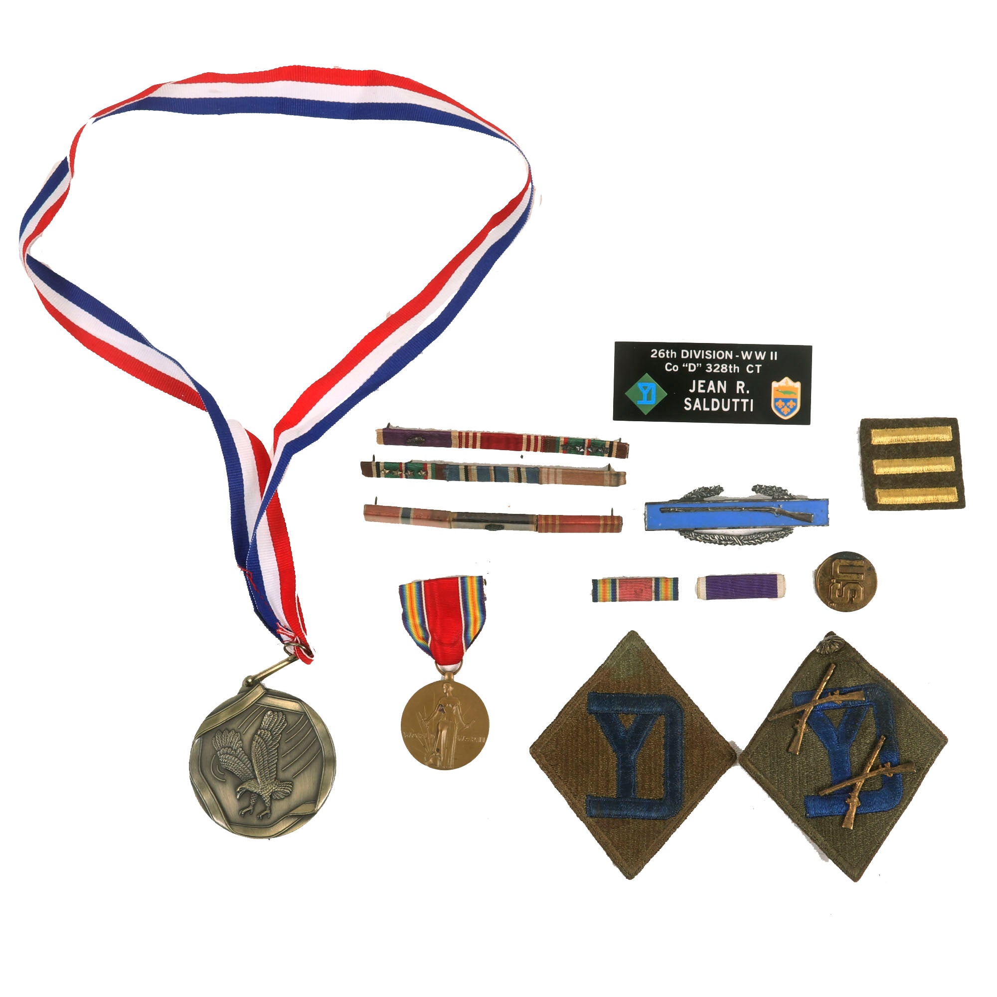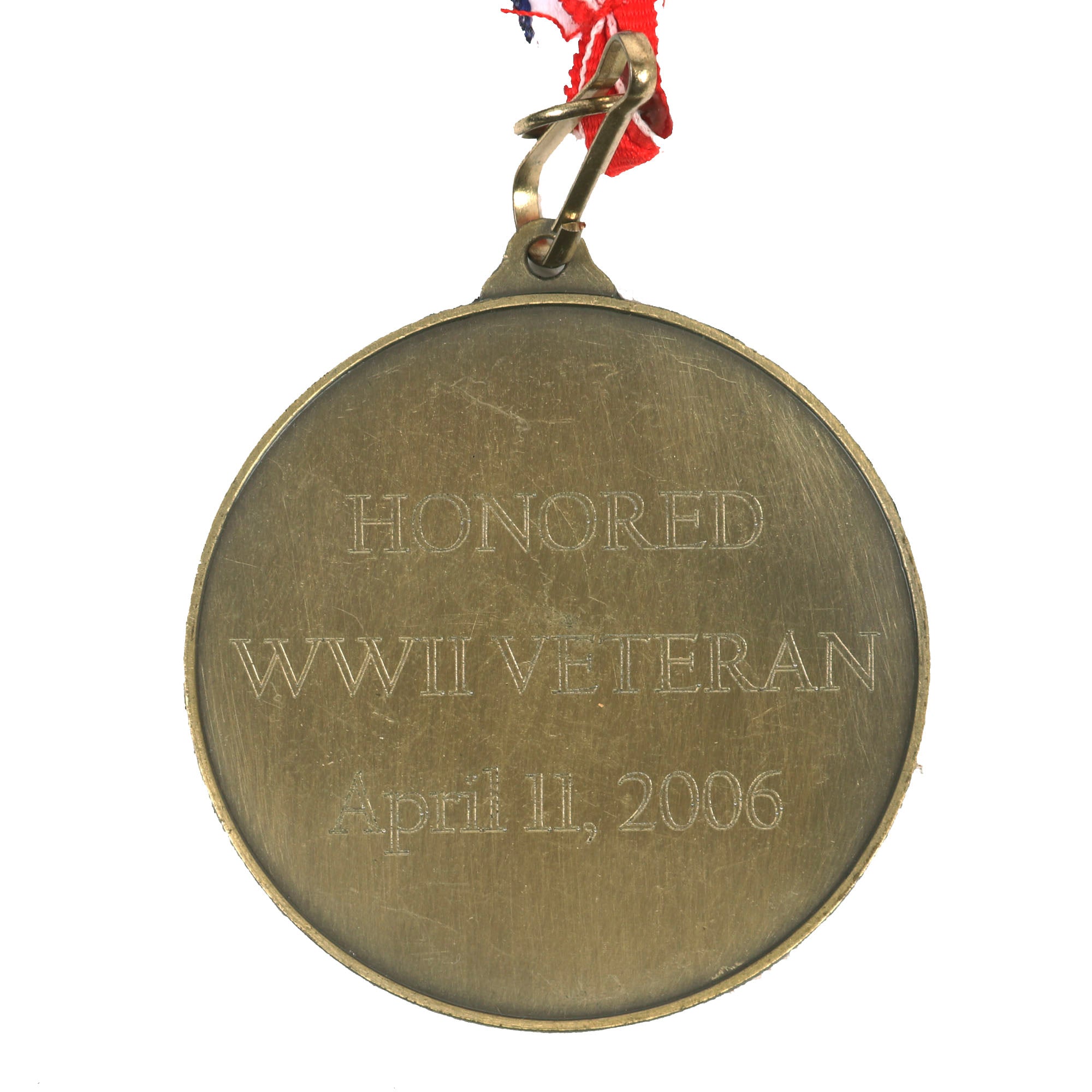 - A Neck medal reading HONORED WWII VETERAN APRIL 11, 2006 awarded to Saldutti, likely at a Veteran’s event.