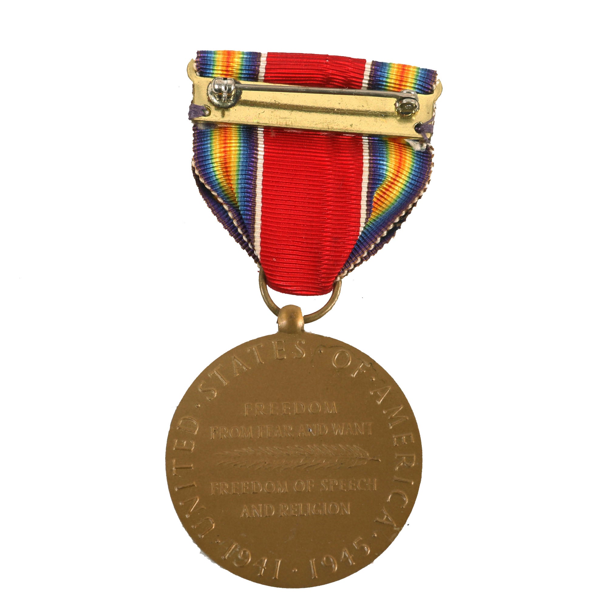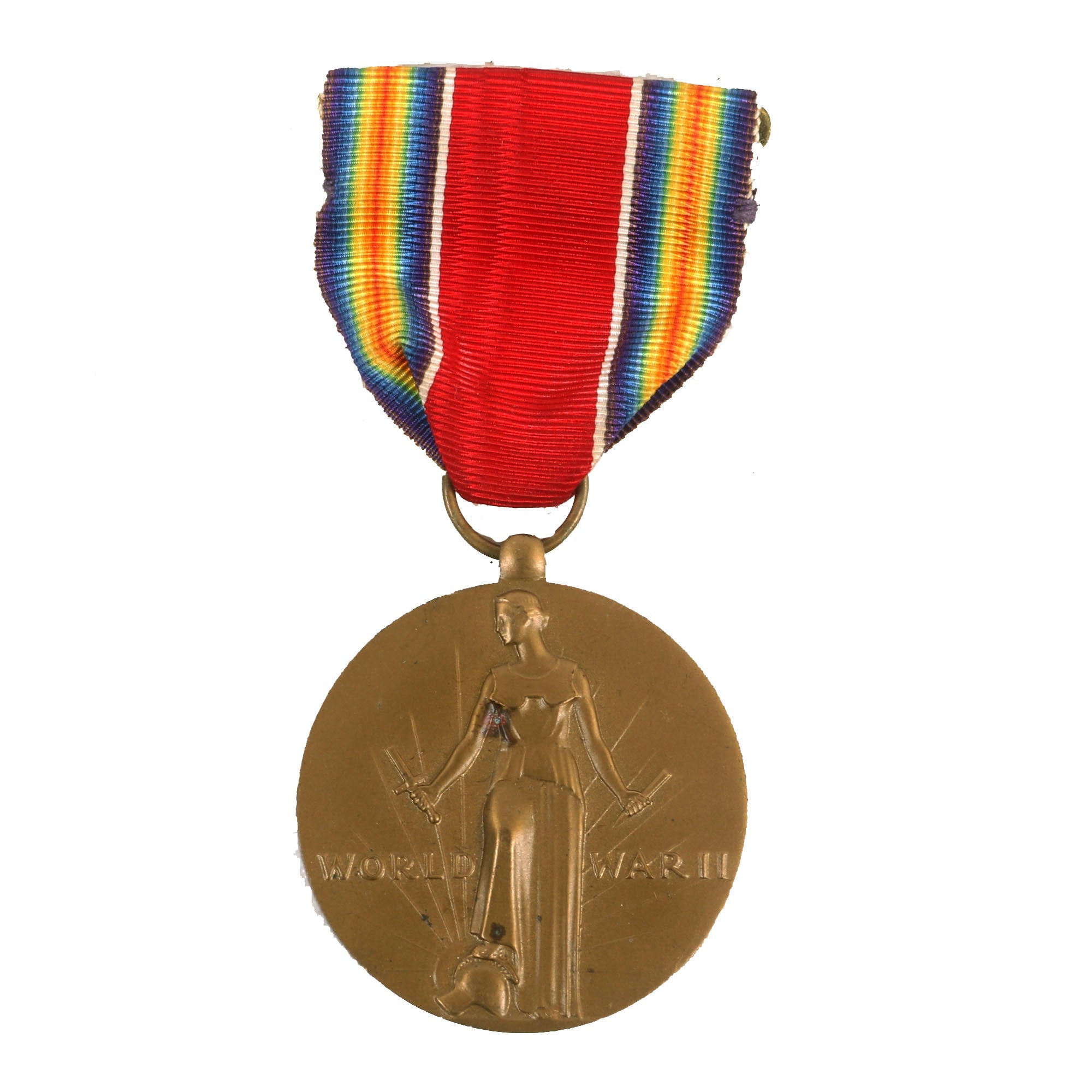 - Saldutti’s insignia including a spare CIB badge, a US enlisted disc, his three overseas stripes, and 10 ribbons including 9 on rows of 3, including the Purple Heart (3), Bronze Star, Good Conduct Medal (3), European African Middle Eastern Campaign Medal with 4 stars (2), and the American Campaign medal. There is also Saldutti’s WWII Victory Medal with the ribbon.