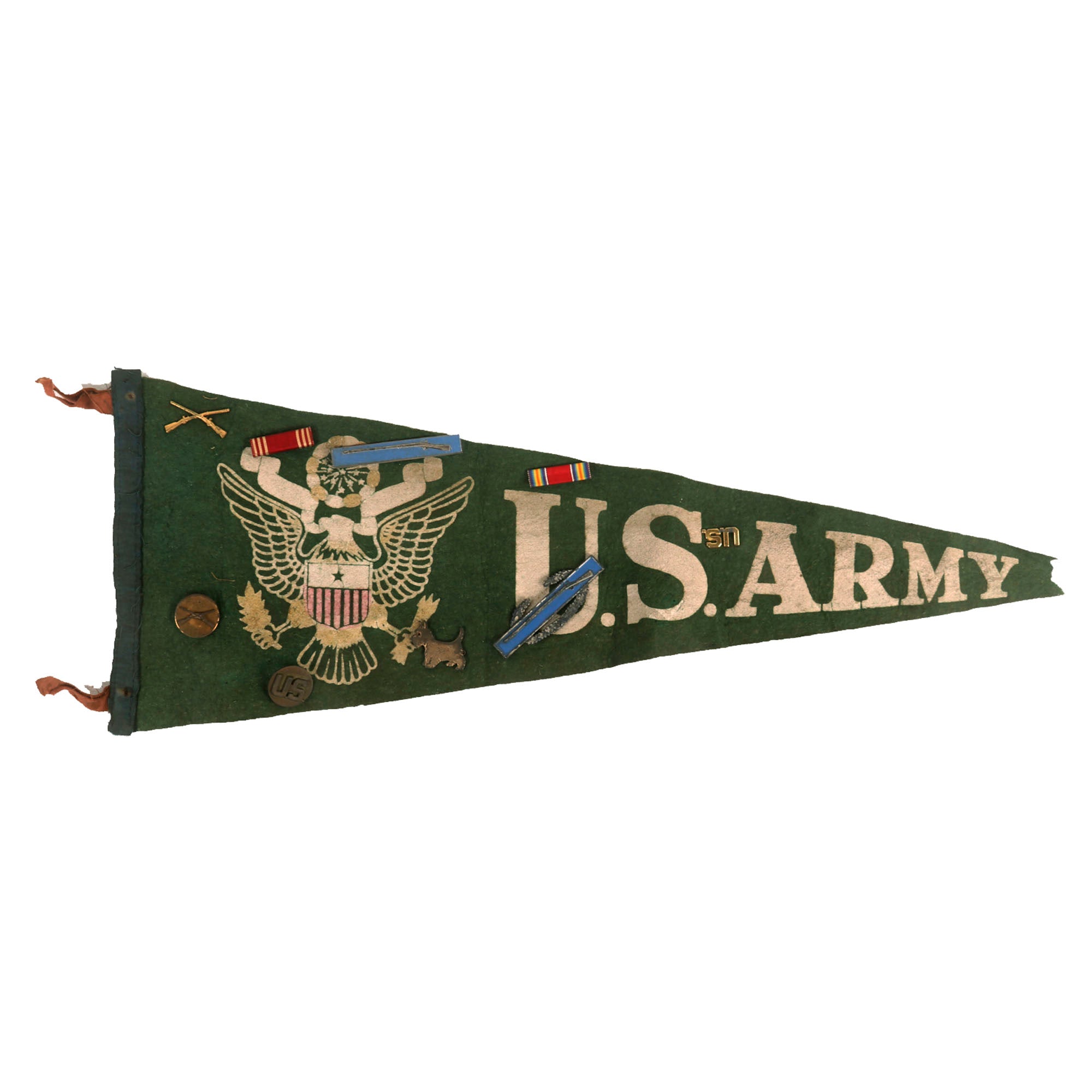 - A Gorgeous US Army Pennant measuring 23 x 8½” which is affixed with some of Saldutti’s insignia including two Combat Infantry Badges, his Enlisted US and Infantry collar discs, his officers’ US & infantry collar insignia, a US WWII Victory ribbon, an Army Good Conduct ribbon, and a small pin of a dog which is engraved “go”.