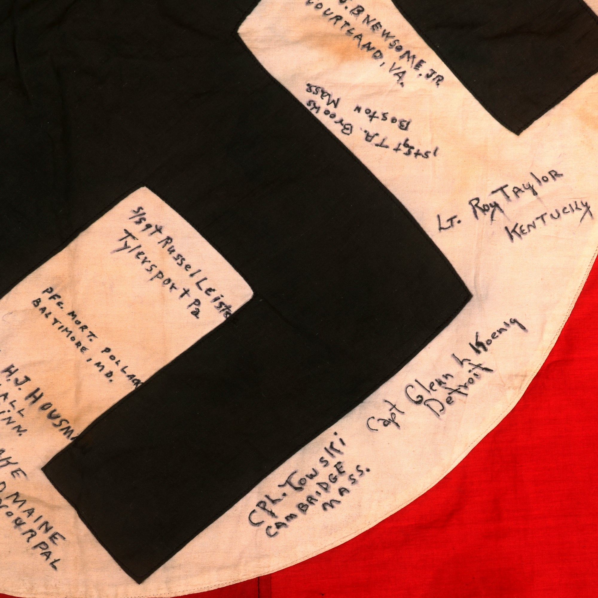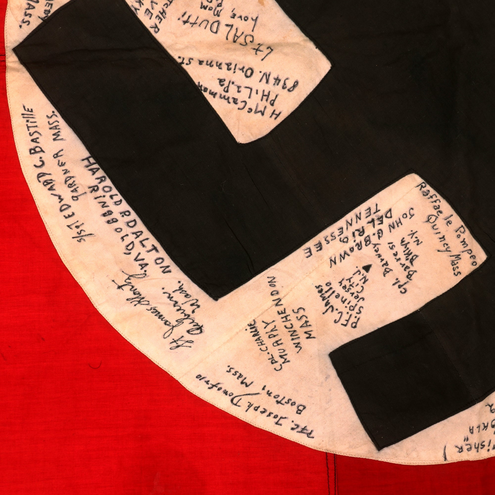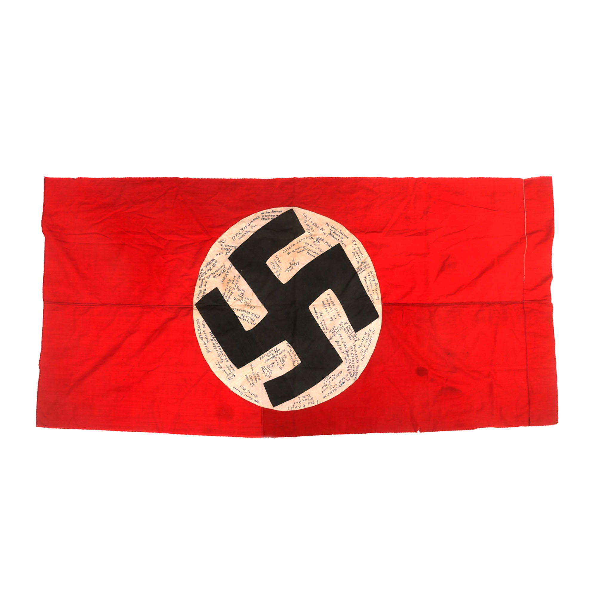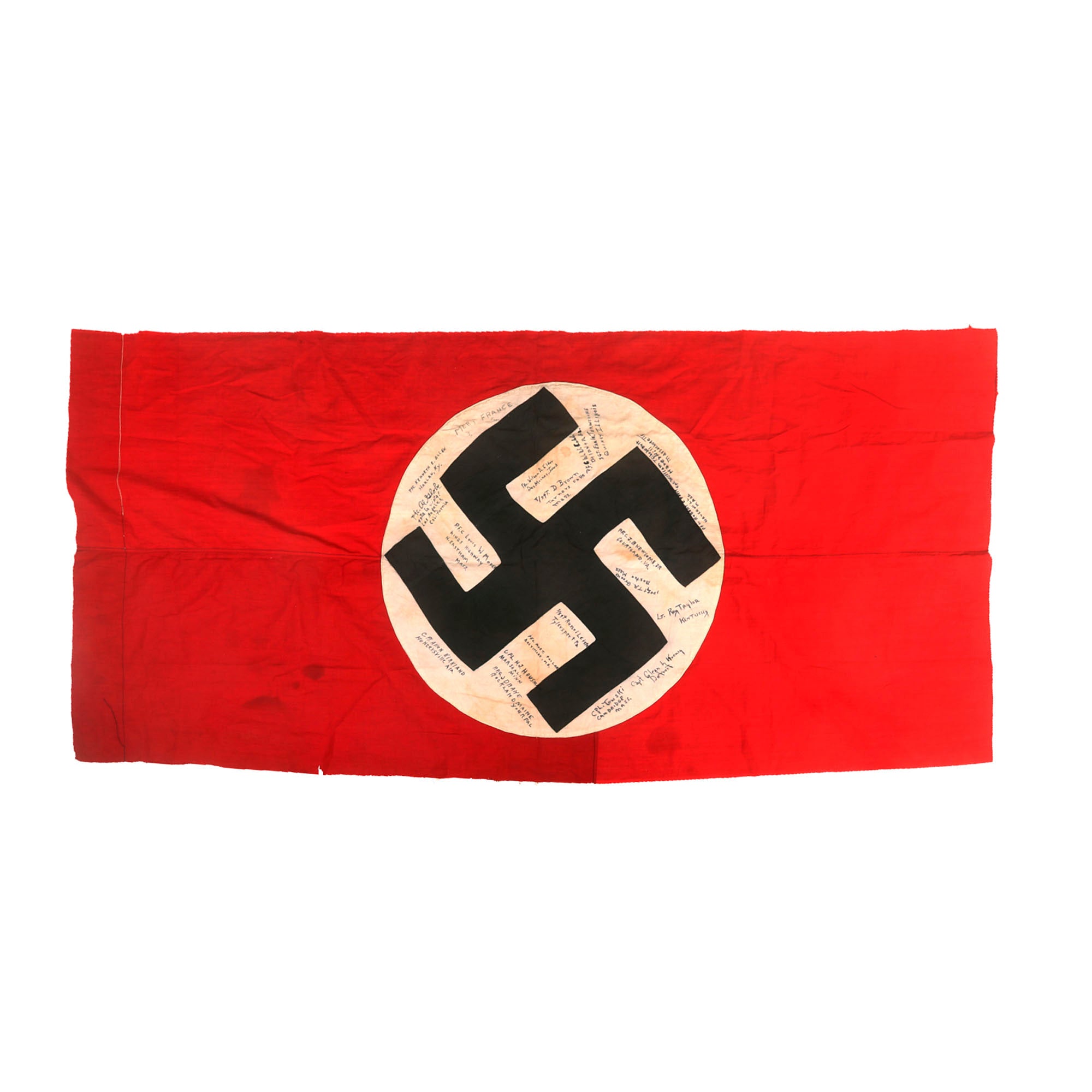 - A Gorgeous German NSDAP banner, 29 x 64”, signed on both sides by 56 members of Saldutti’s company including Saldutti himself. This is an extremely scarce piece in its own right, but to come with the Lieutenant’s uniform grouping is just extravagant.