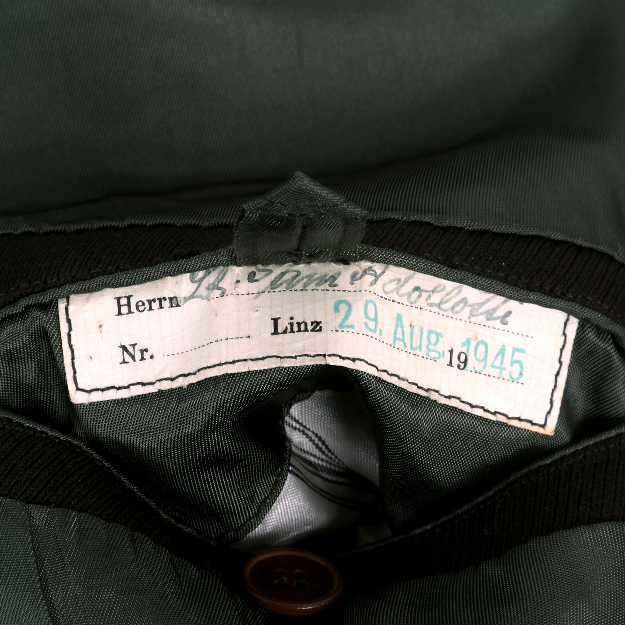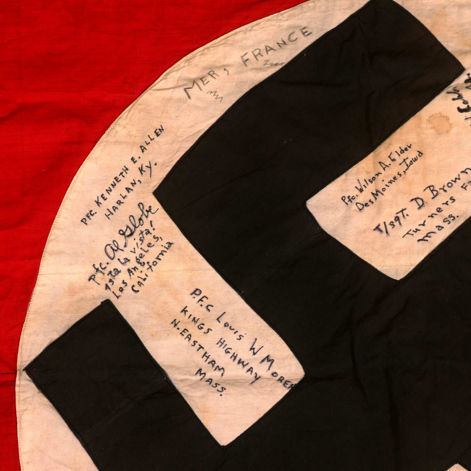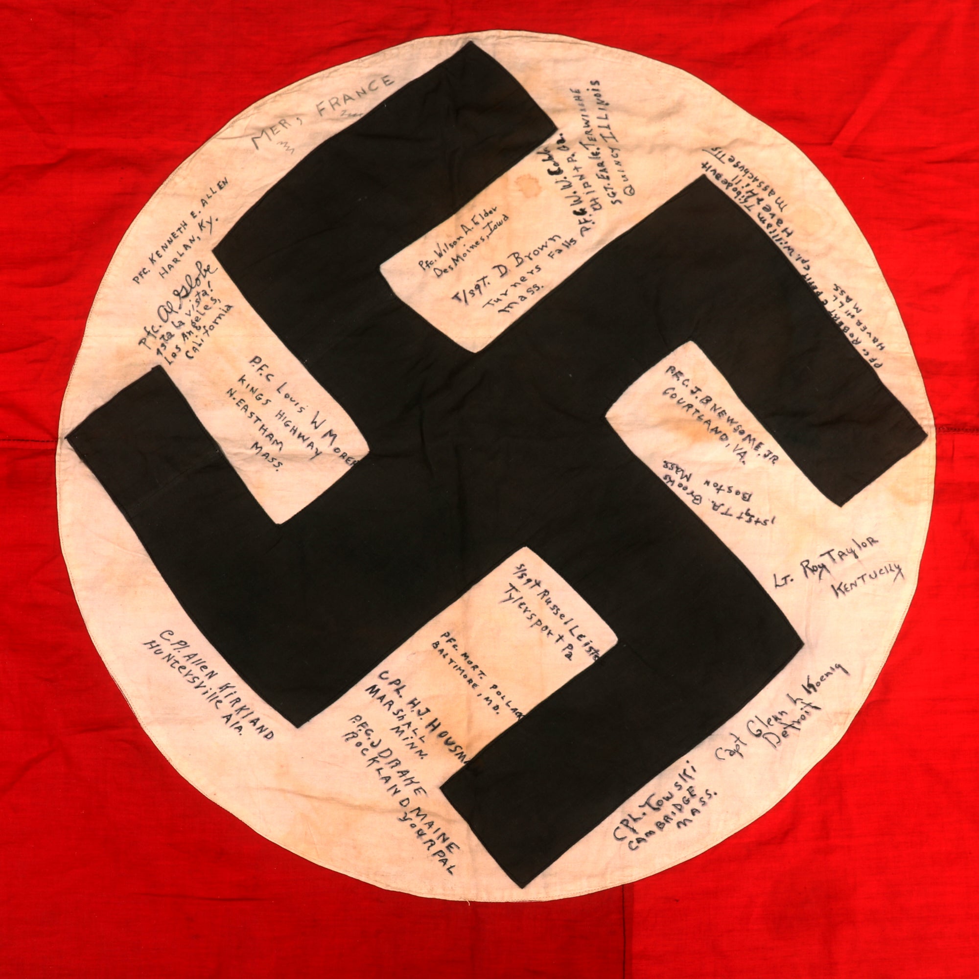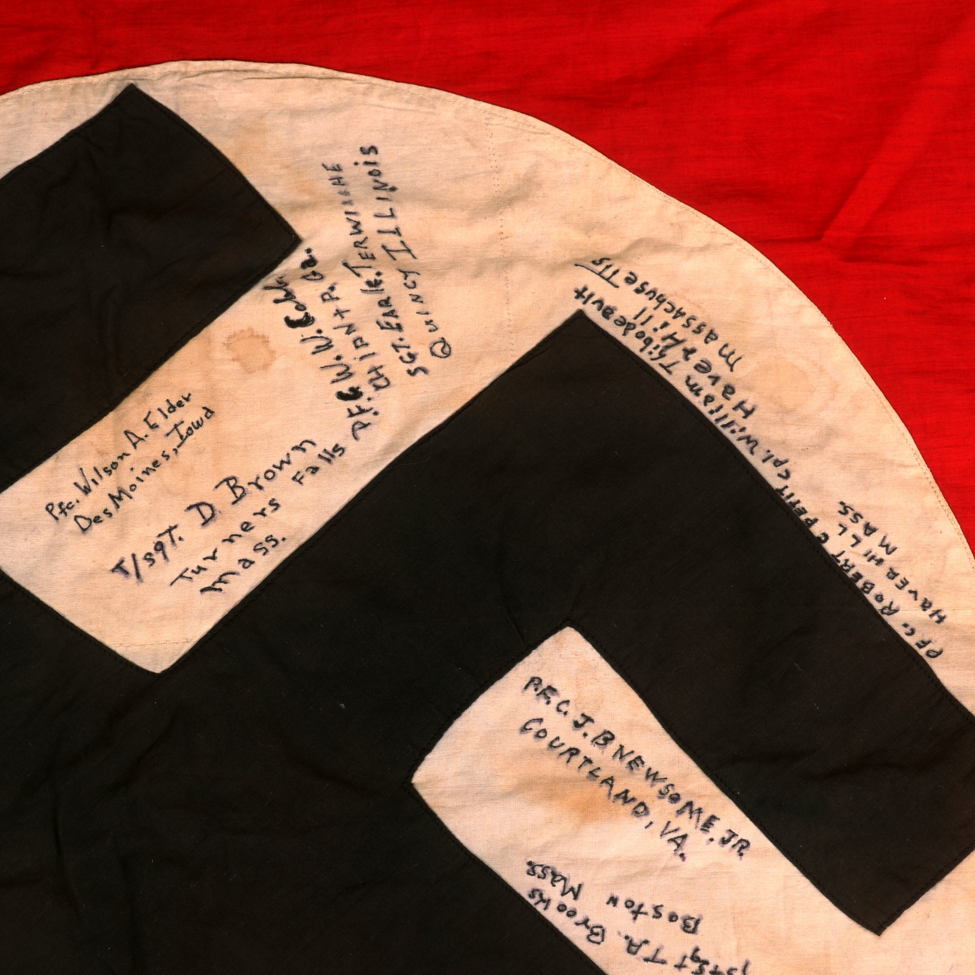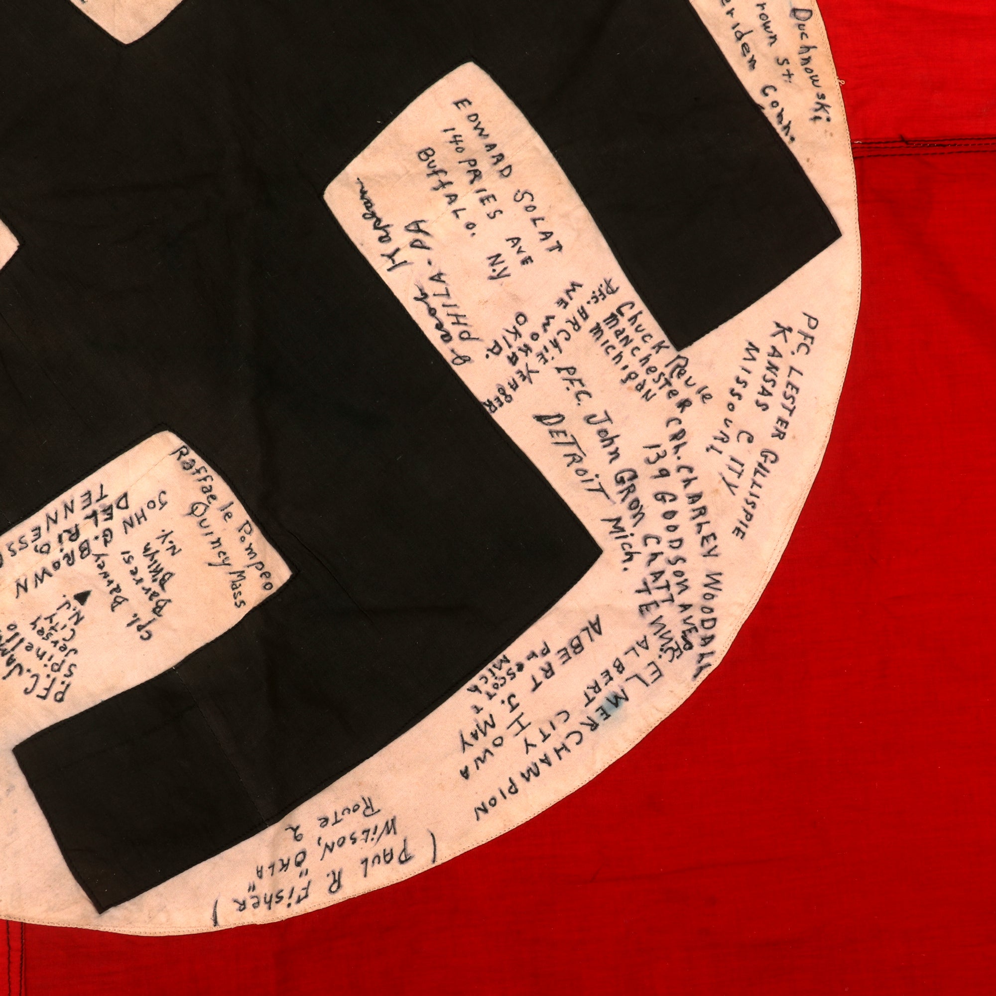 - A Gorgeous German NSDAP banner, 29 x 64”, signed on both sides by 56 members of Saldutti’s company including Saldutti himself. This is an extremely scarce piece in its own right, but to come with the Lieutenant’s uniform grouping is just extravagant.