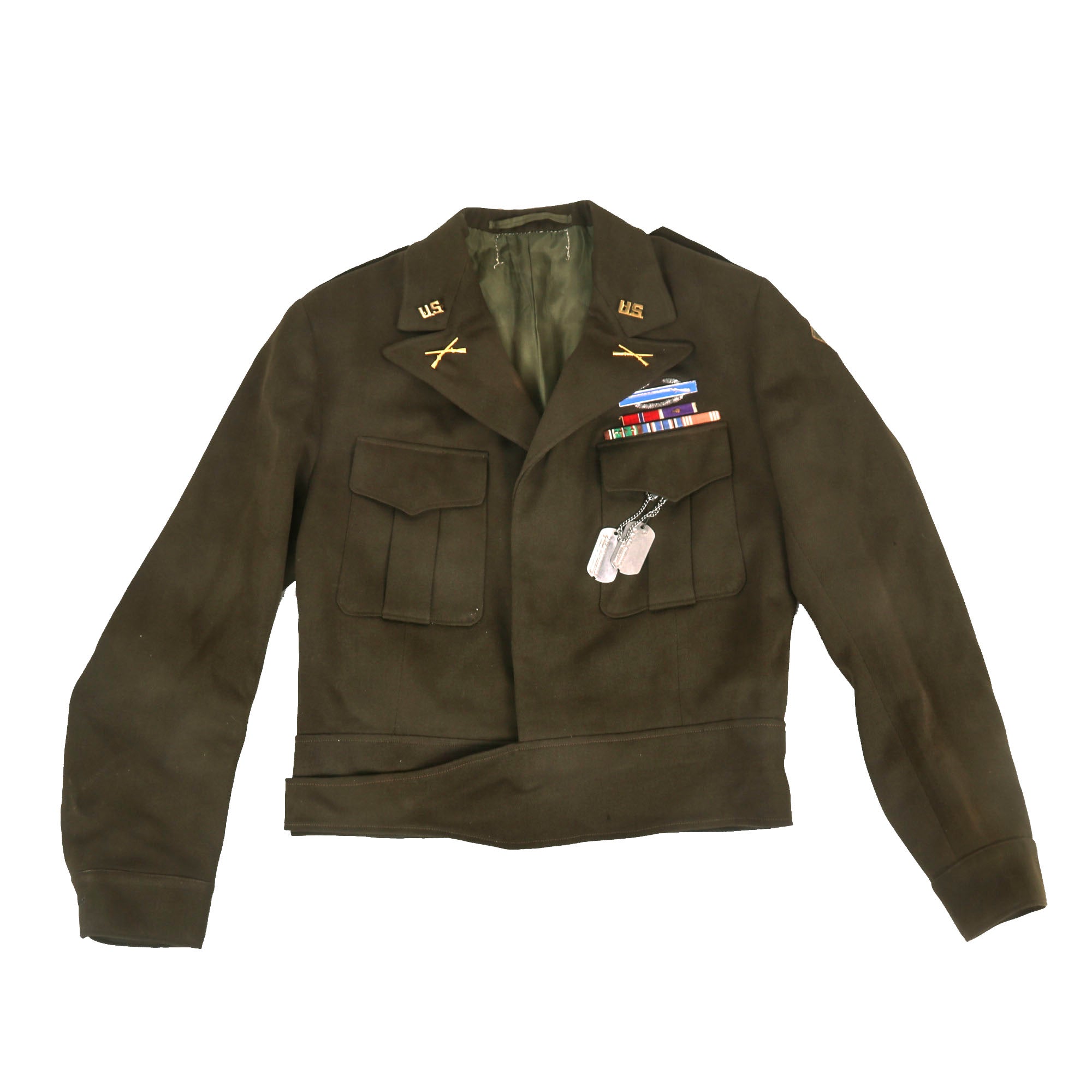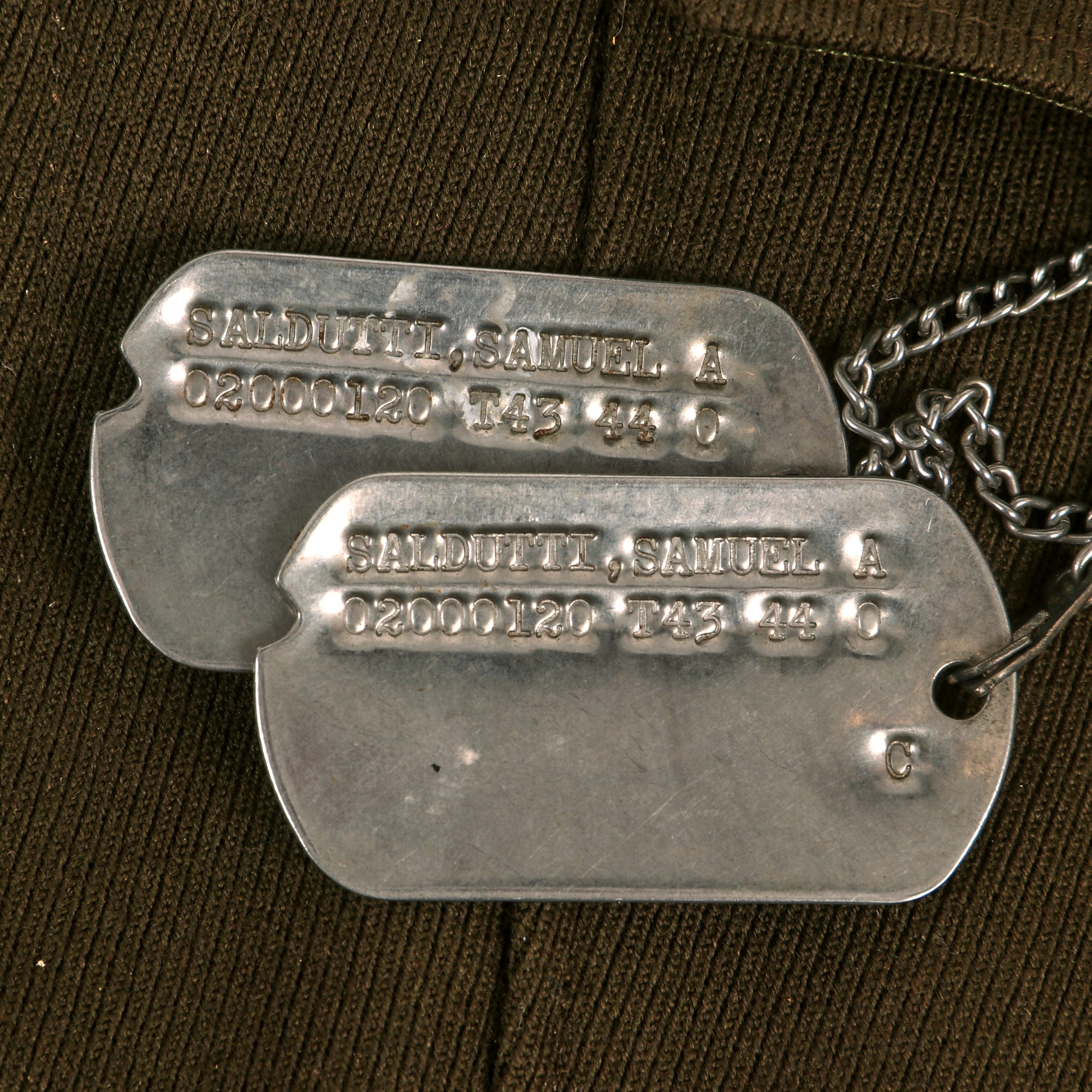 - Saldutti’s Ike Jacket uniform which has a 26th Infantry Division patch on the left shoulder, U.S. & Infantry Officer’s collar insignia, his Combat Infantry Badge, and a 5 ribbon bar above the left breast pocket including the Bronze Star, Purple Heart with OLC, European African Middle Eastern Campaign Medal with 4 campaign stars, the American Campaign Medal, and the Army Good Conduct Medal. Saldutti’s Dog Tags on a chain are hanging out of the left breast pocket. There is a nametag in the pocket which appears to read SAM A. … so we are confident it was Saldutti’s uniform.