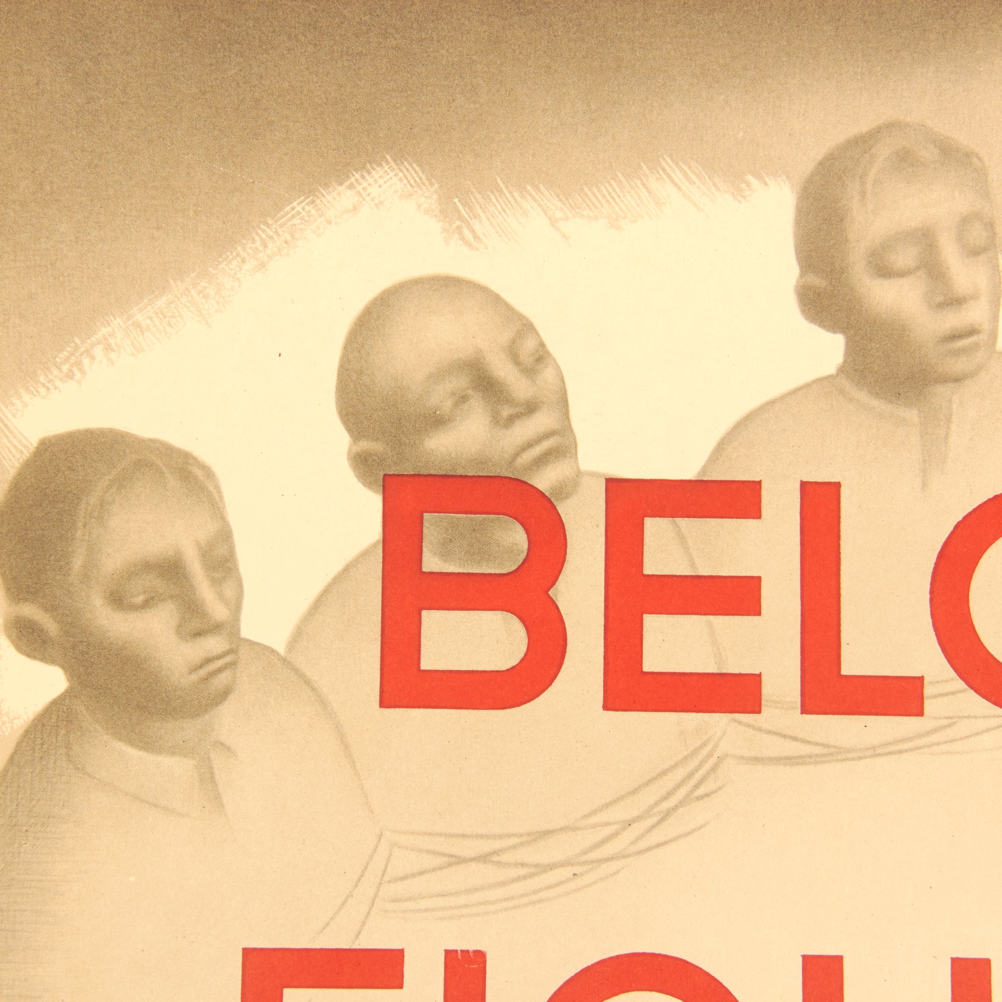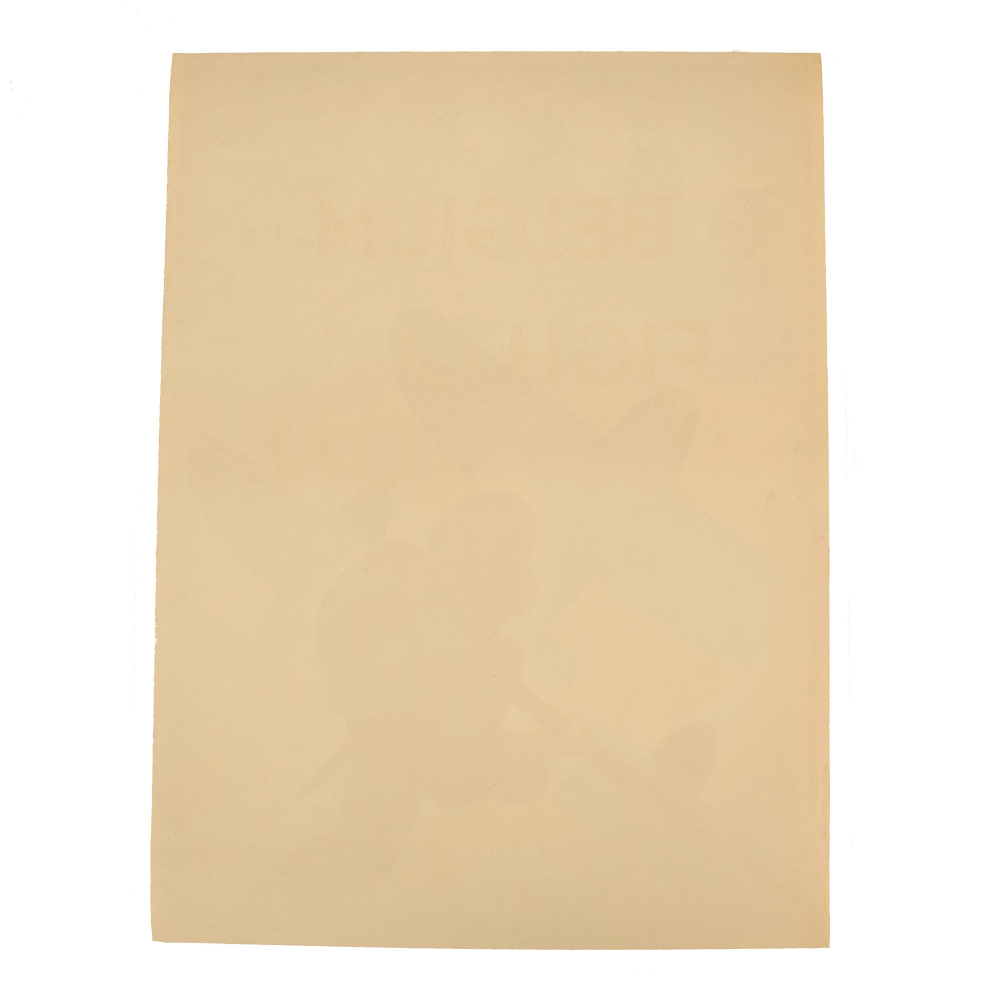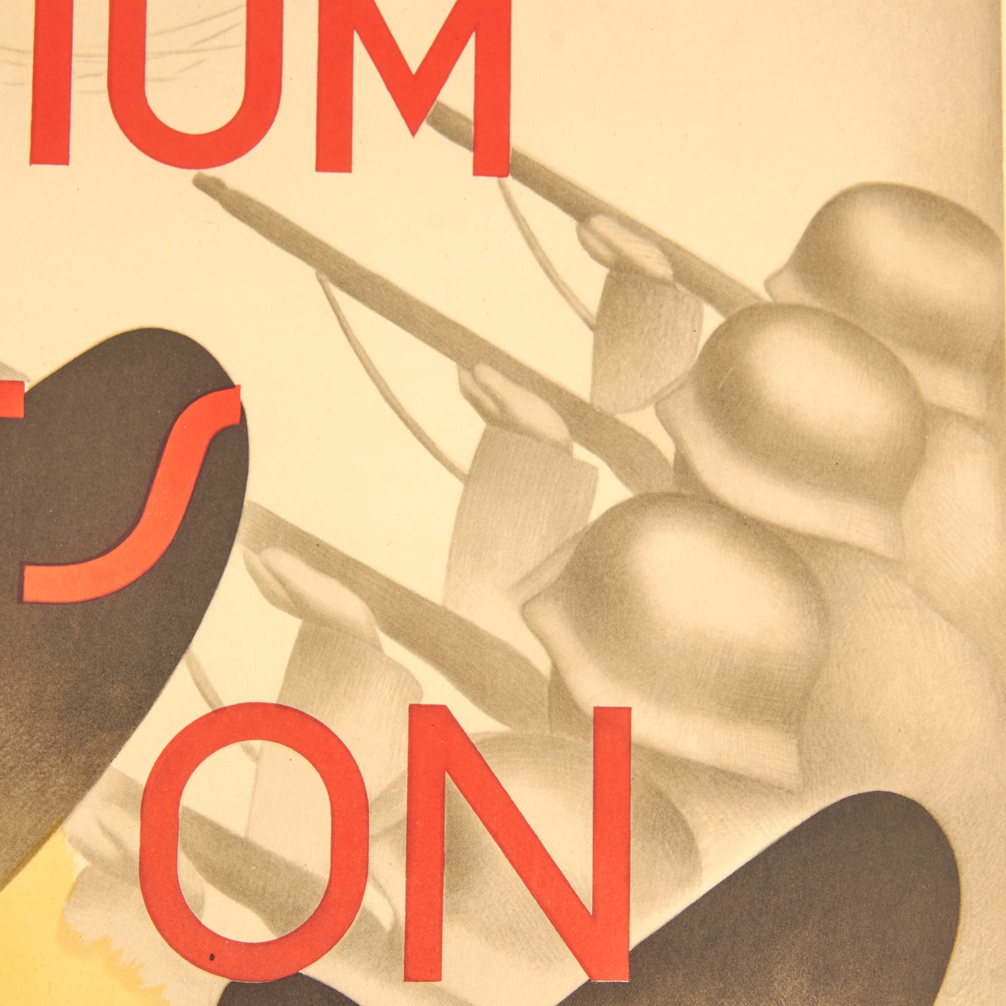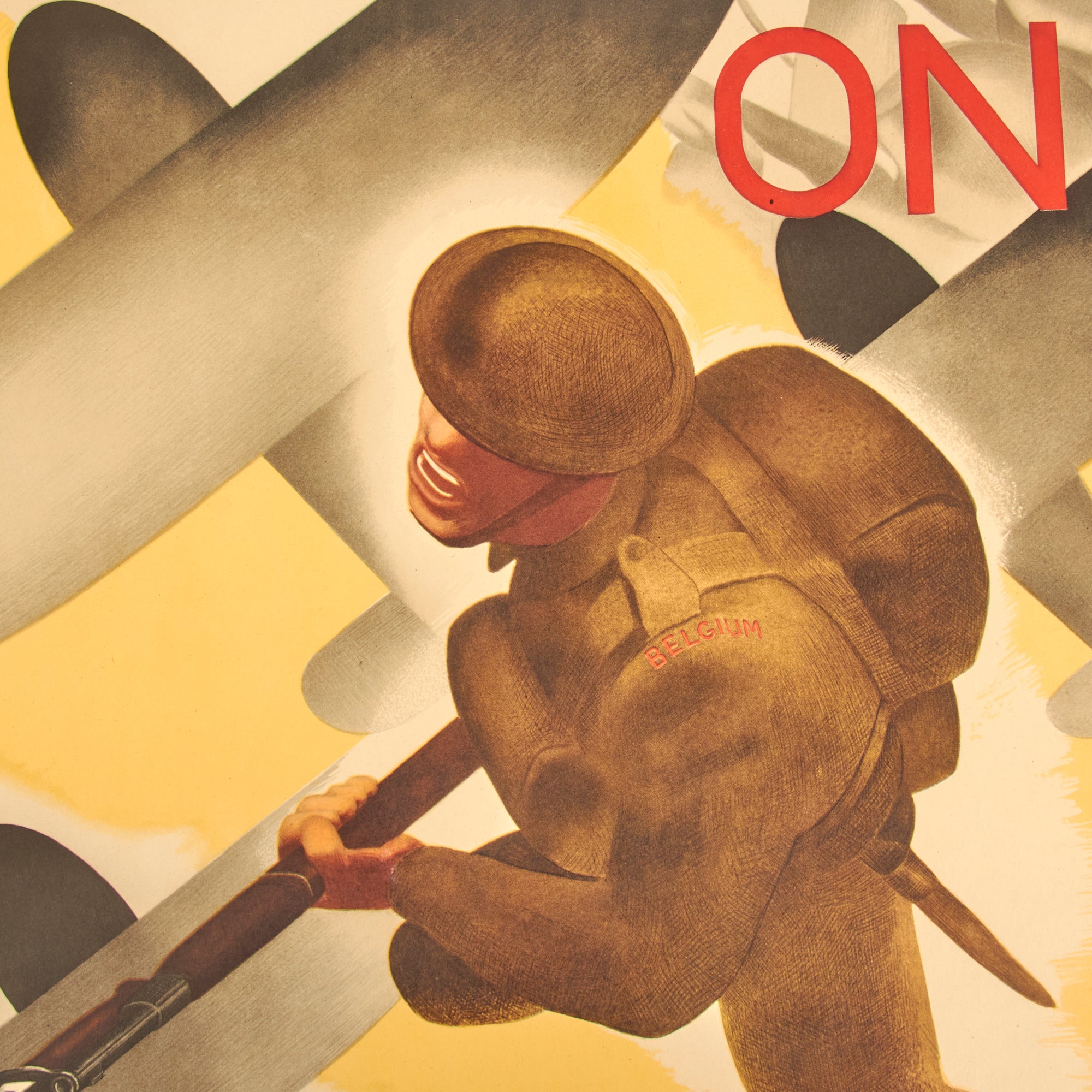 The main goal of this poster was presumably to encourage American support for the Belgian resistance and “army-in-exile” cause. In the diagonal sweep of the composition, the image of bound prisoners facing a German firing squad is counteracted by the avenging Belgian soldier and the thrust of the fighter aircraft.