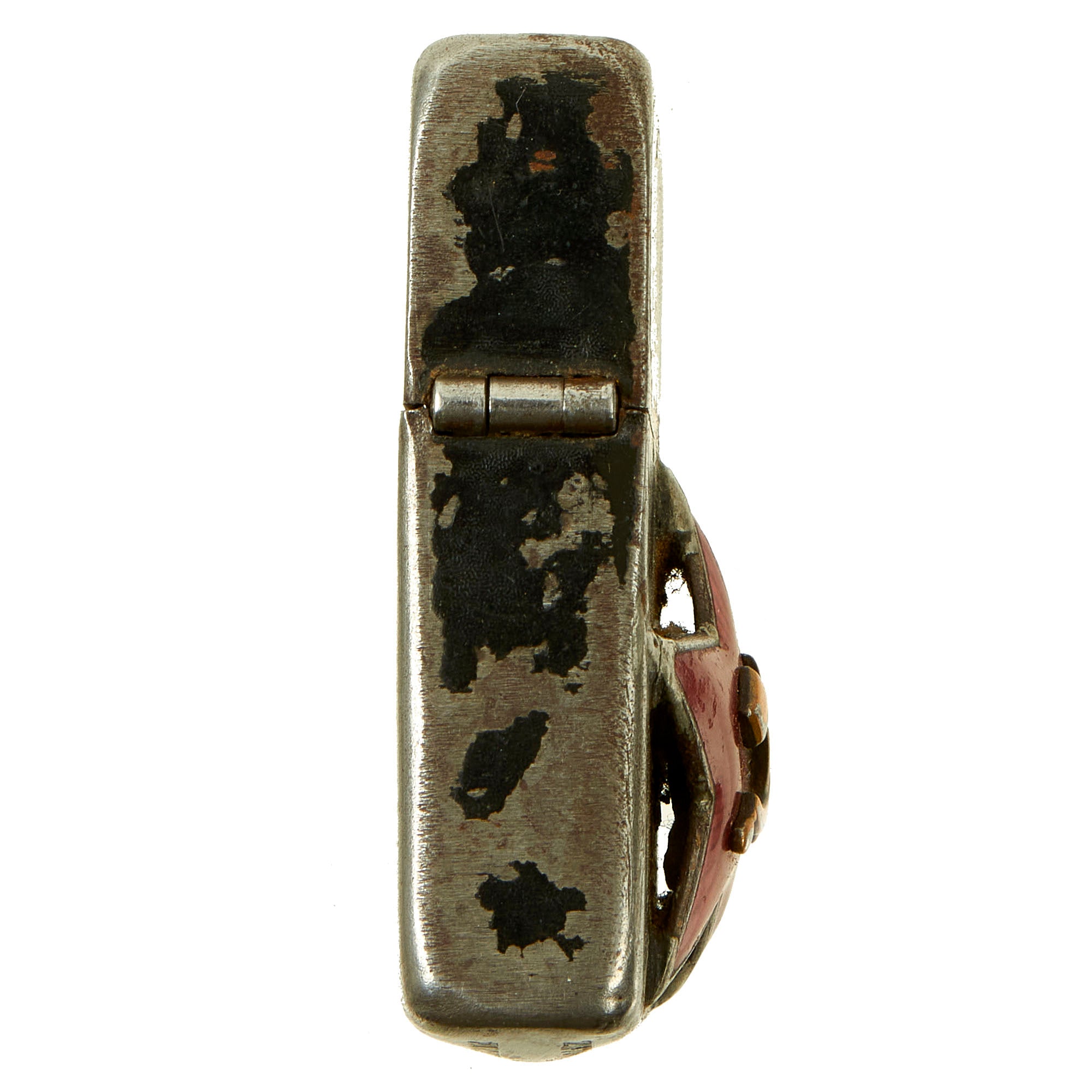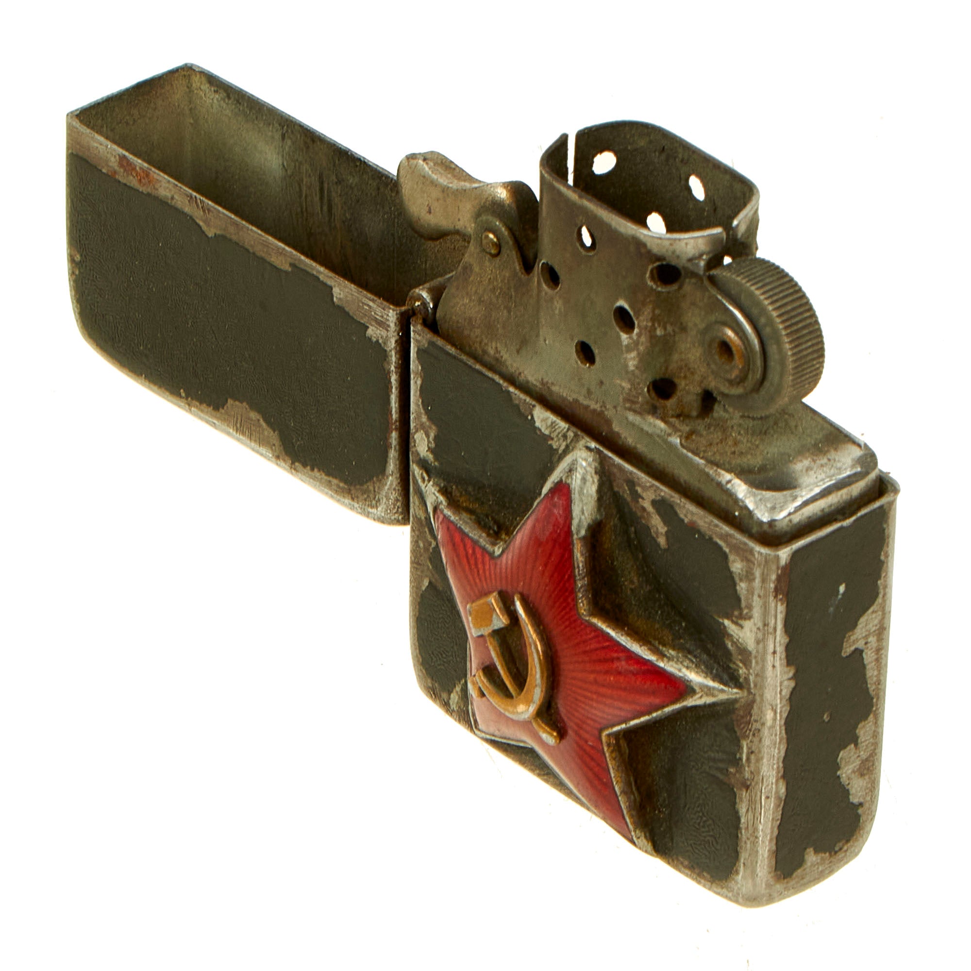 This lighter has the Patent Number 2032695 on the bottom and has much of the original black crackle paint present. Between the paint and the number, this puts date of manufacture some time between 1942-1946. A lot of zippos from this time period were stamped with 203695 which was a factory error, fortunately this one has the full number. The most interesting aspect of the lighter is the Soviet enam star soldered on the front. This was most likely done by a Soviet soldier after making a trade with an American soldier, but the story has been lost to time. The lighter still retains a wick and a functional strike wheel, we believe that once it is fueled up and has a flint put in it, it should work just fine if you would wish to do so.