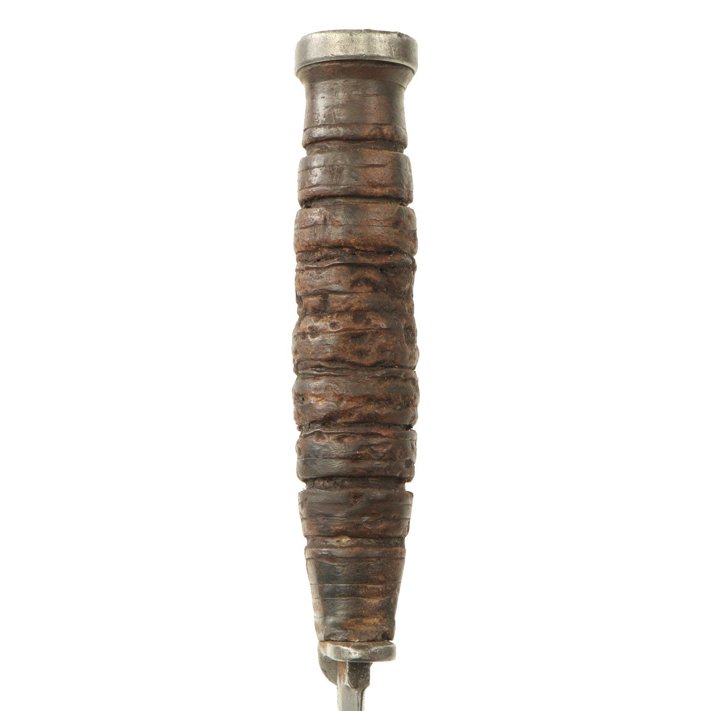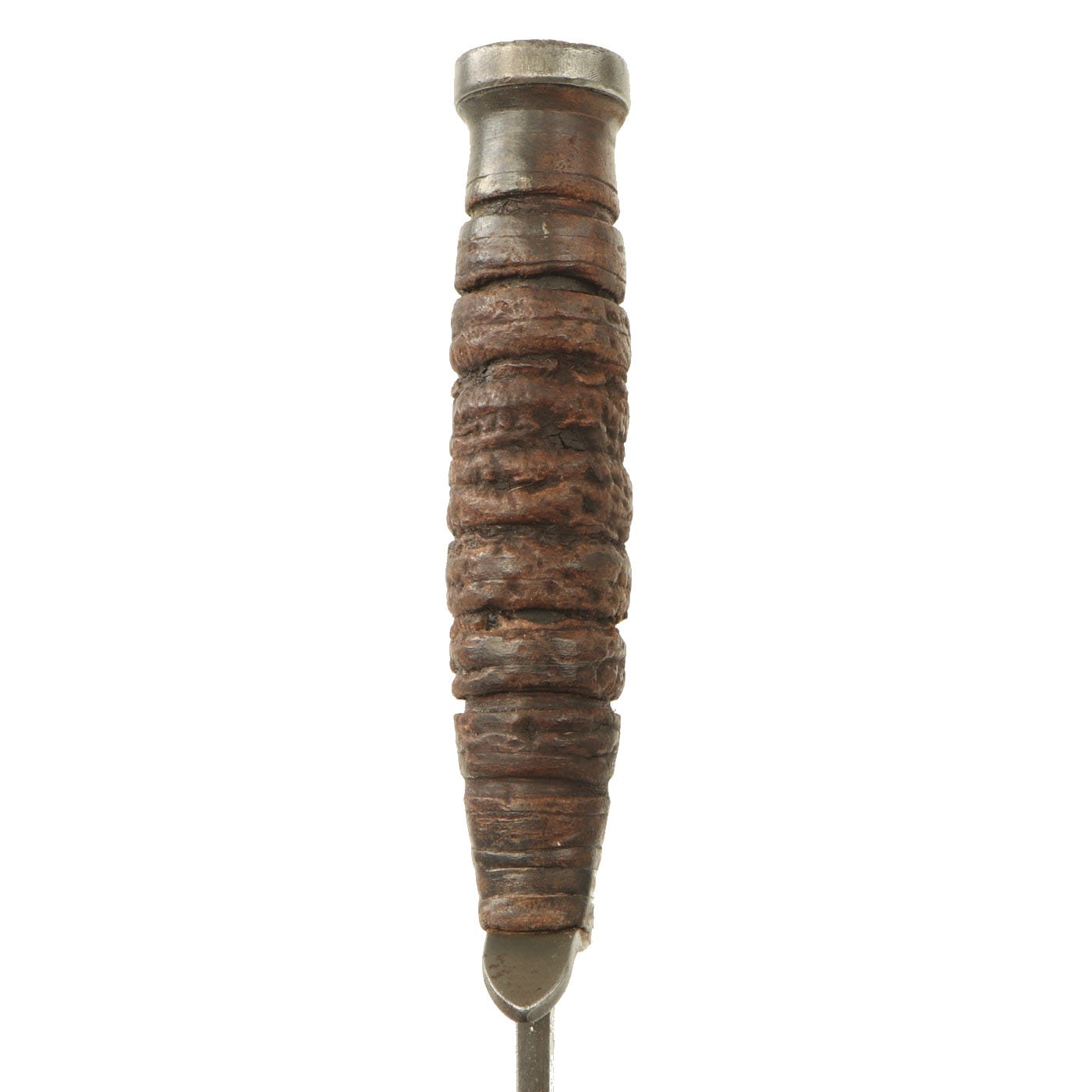 The handle and stacked leather grip do show wear and deterioration, especially around the middle of the grip. This wear pattern from extensive use is impossible to duplicate. Some small chunks of leather have worn away, giving the grip an almost wood grain look. The crossguard is still in the correct shape, straight with a forward bend at the top for the thumb, and has only a tiny bit of movement. The bottom of the pommel shows the U.S. "Flaming Bomb" ordnance proof mark and correct peened over tang.