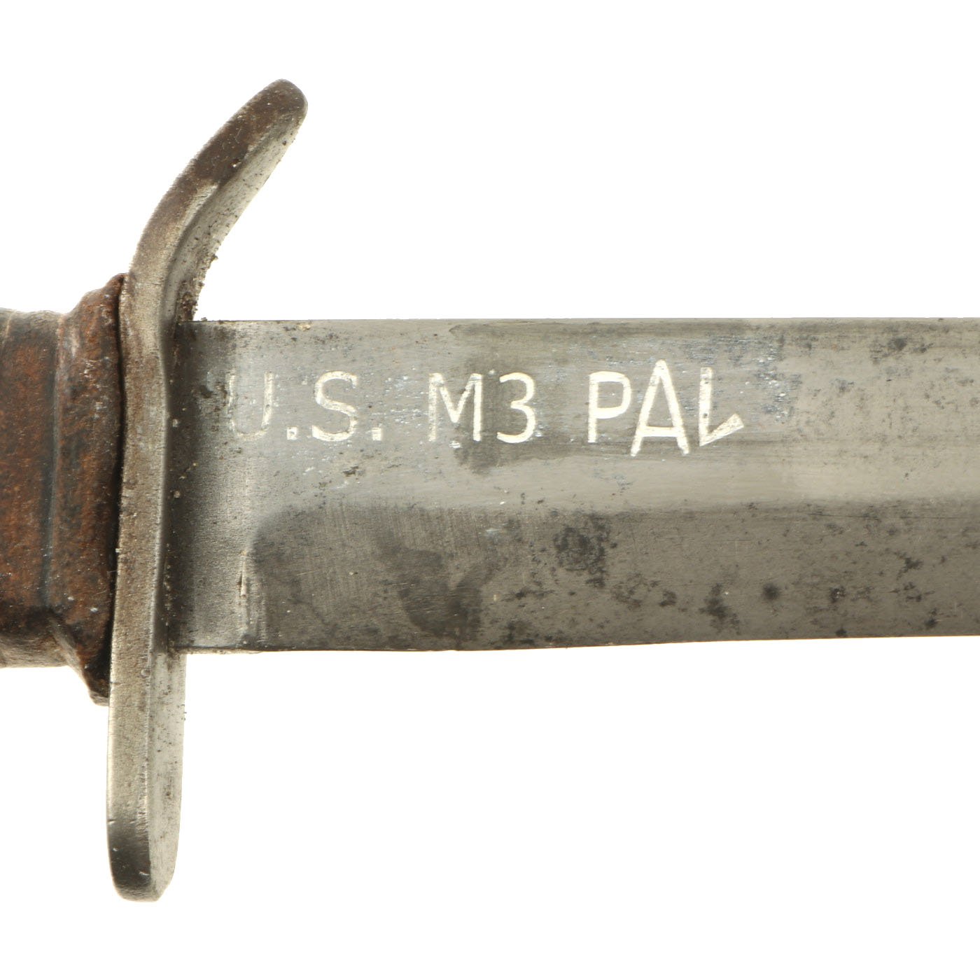 Original Item: Only One Available. This is a very nice service worn example of a WWII M3 U.S. fighting knife, made by the desirable maker, PAL Cutlery Co.. With the marking on the blade, this is the more desirable "2nd Pattern", which was replaced quickly by the 3rd pattern with markings on the crossguard. It comes complete in the correctly M8 scabbard, which was updated during the war to the M8A1 standard. These fighting knives were preferred by American infantry during World War Two for hand to hand combat.