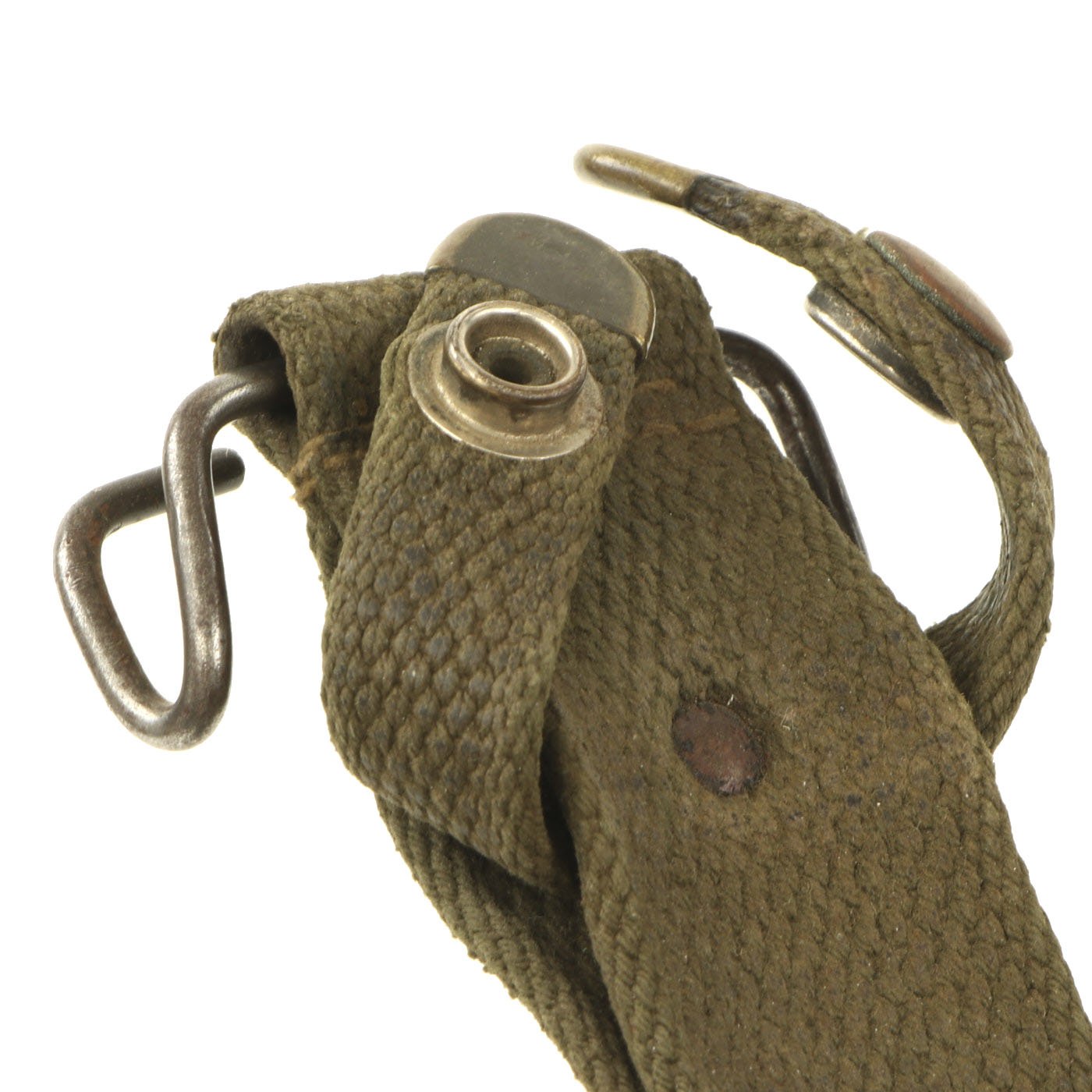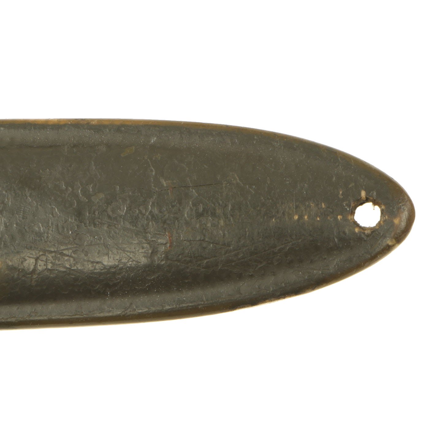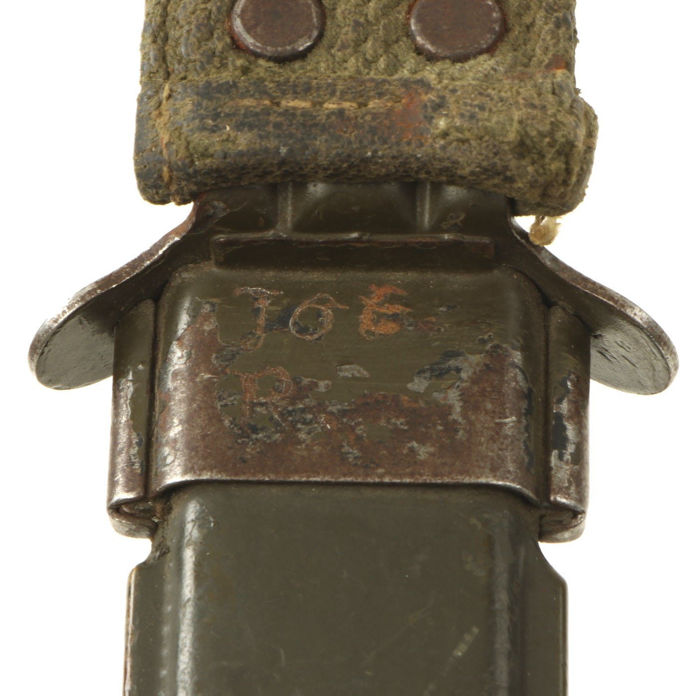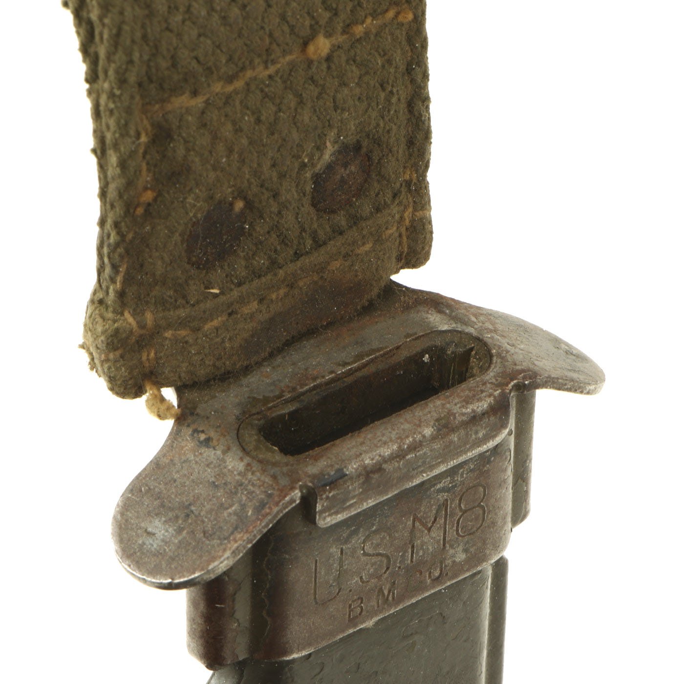 The original scabbard is marked, U.S. M8 / B.M. CO and is in very good condition, with light overall wear. The scabbard was manufactured by Beckwith Mfg Co. a division of Victory Plastics. This is the earlier pattern of the scabbard, without the retaining loop, though it was later updated to have one. These feature a thermoplastic impregnated cotton fabric body, metal throat, and canvas frog and securing strap. The scabbard is still fully functional, with a functional retaining strap, but does show wear and use. The canvas is somewhat dirty and discolored, and the finish on the metal fittings is mostly worn away. The body has been repainted darker green, possibly several times, and now has a worn finish.