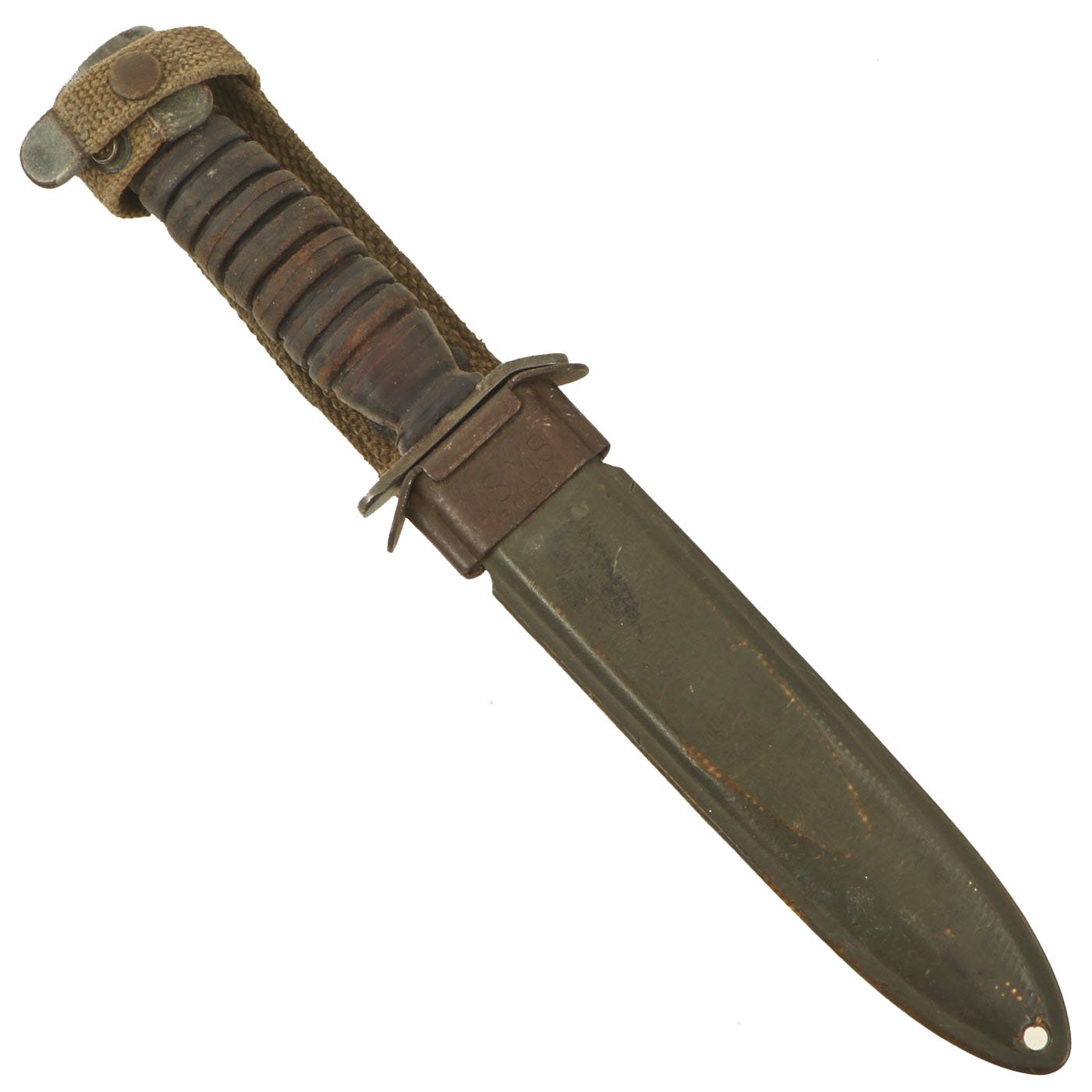 A very nice service used example of an early issue blade marked M3 knife from a desirable maker, complete with the correct scabbard. Ready to add to your WWII edged weapon collection!