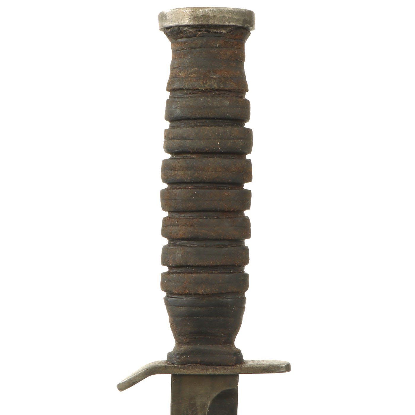 This knife is very early production, indicated by the maker information being stamped and dated directly on the blade: U.S. M3 - UTICA. The 6 3/4 inch spear point blade is in good condition, but does show some wear and sharpening. The tip has a bit missing, and it has been sharpened after arsenal. Most of the original finish is missing, however it does show the factory grind marks in many areas. It is currently somewhat sharp.