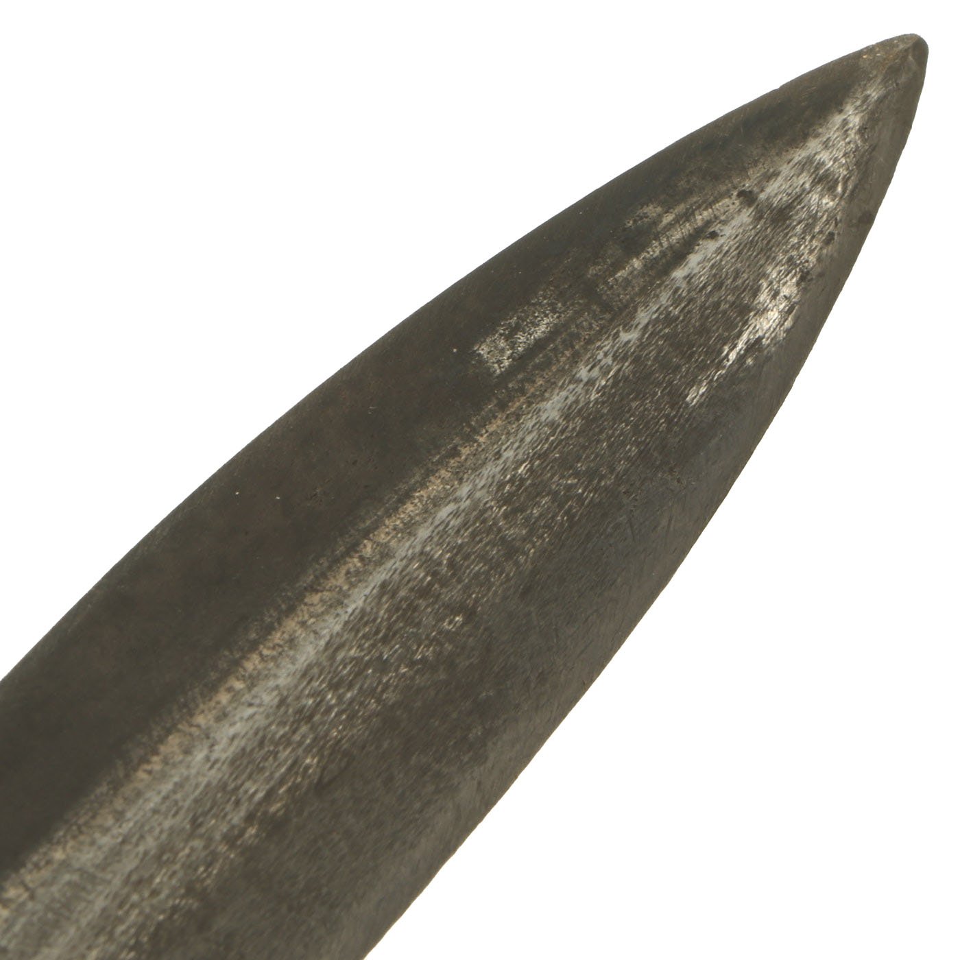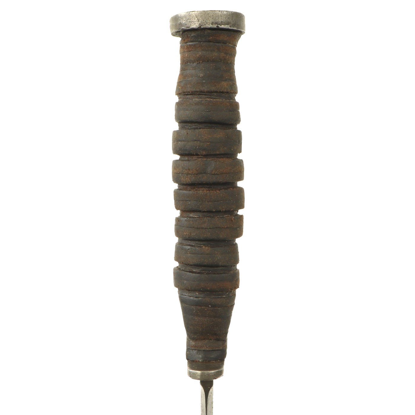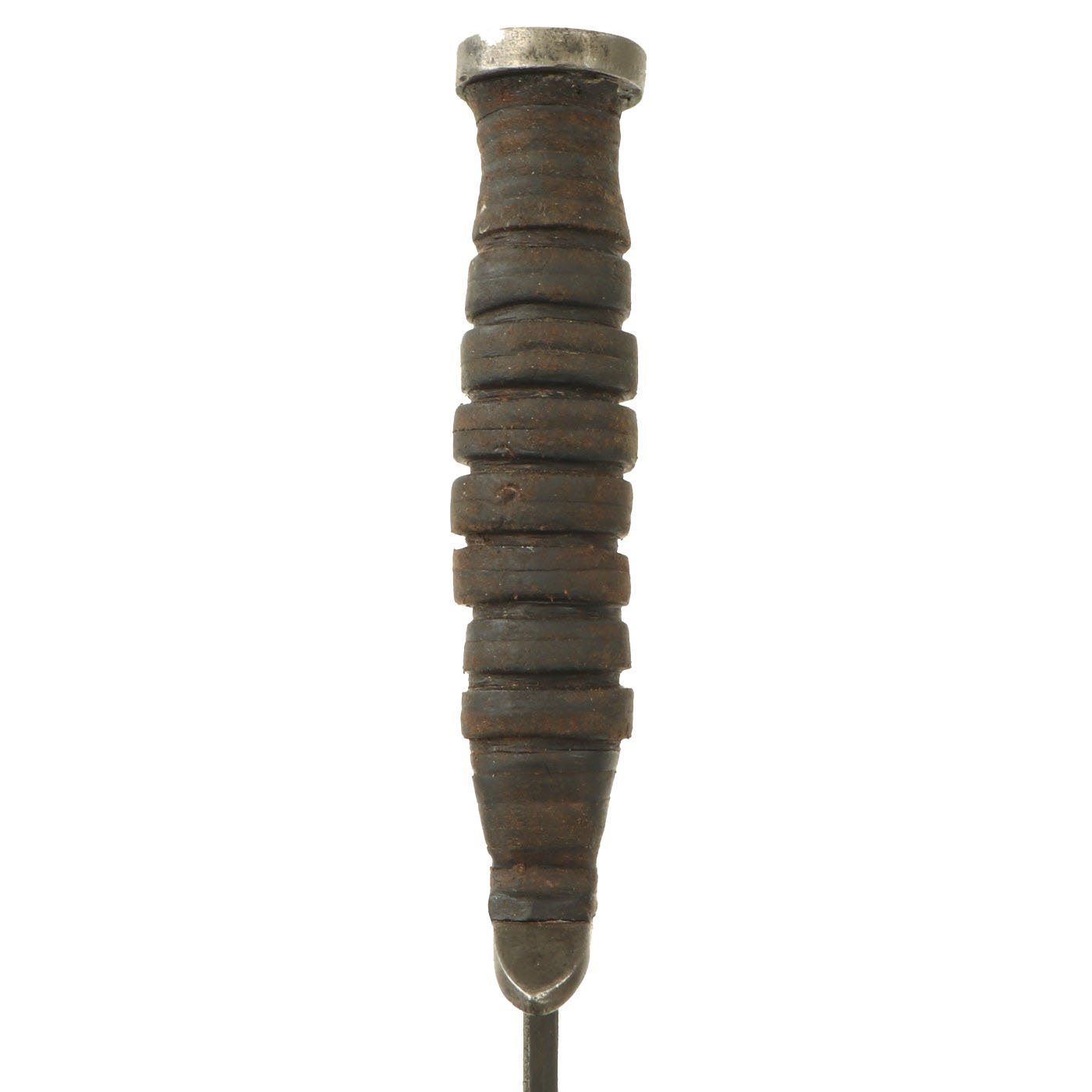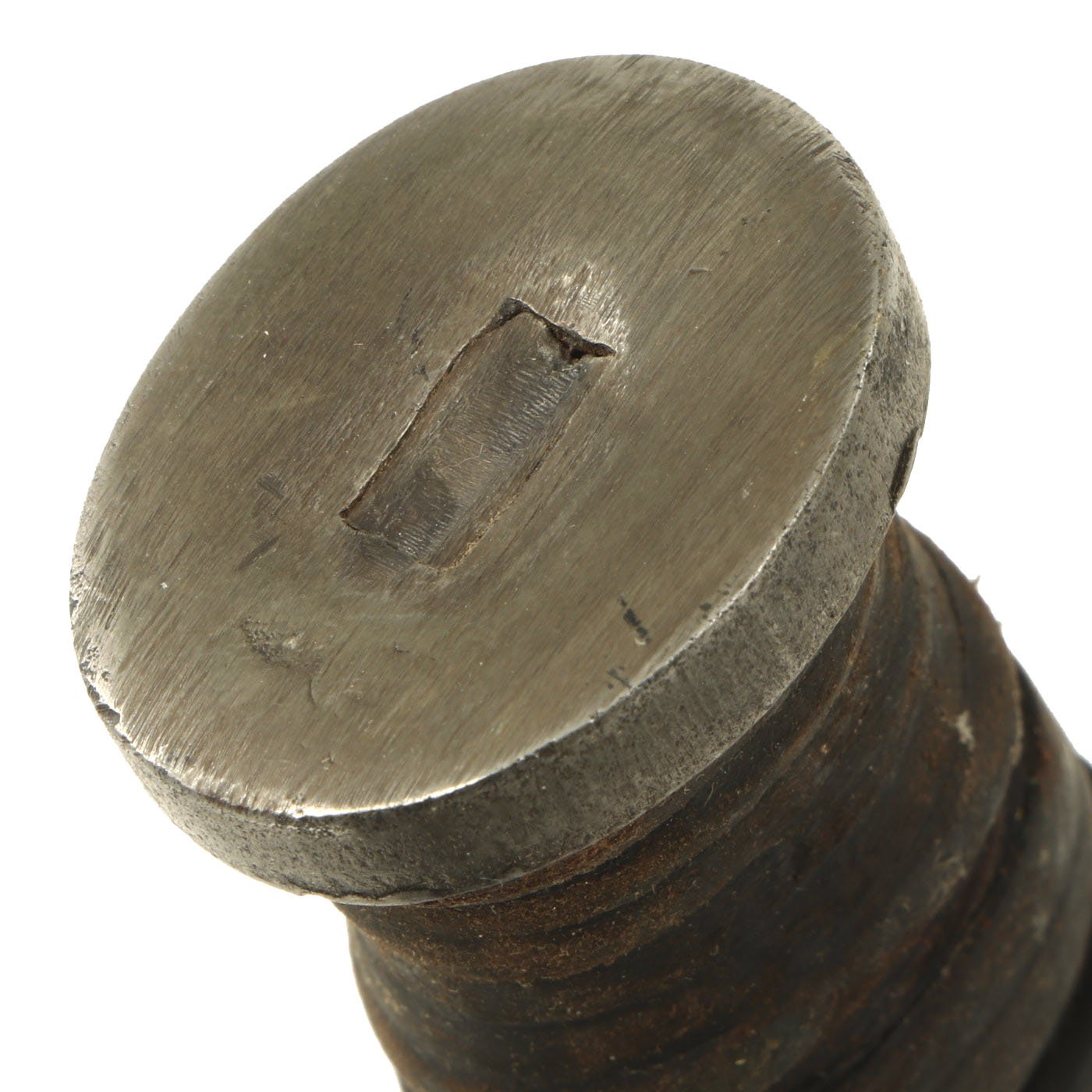The handle and stacked leather grip do show wear and deterioration, and are now somewhat loose on the tang. This is definitely a knife that saw use, which caused the channel inside the leather washers to wide, so they can move back and forth a bit. The crossguard is still in the correct shape, straight with a forward bend at the top for the thumb. The pommel on this example looks to have been ground down slightly for some reason, possibly to remove corrosion, which has removed part of the peened tang. However it still bears the correct "Flaming Bomb" proof faintly, so this is definitely a WWII original.