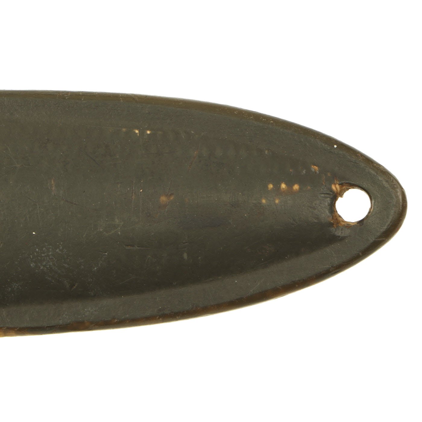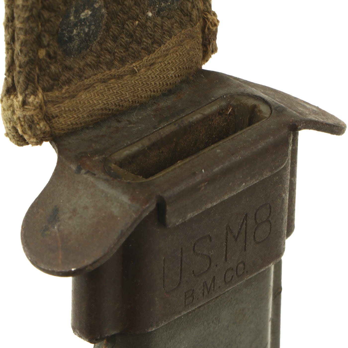 The original scabbard is marked, U.S. M8 / B.M. CO and is in very good condition, with moderate overall wear. The scabbard was manufactured by Beckwith Mfg Co. a division of Victory Plastics. This is the earlier pattern of the scabbard, made without the retaining loop, though it was later updated to have one. These feature a thermoplastic impregnated cotton fabric body, metal throat, and canvas frog and securing strap. The scabbard is still fully functional, with a functional retaining strap, but does show wear and use. The canvas is somewhat dirty and discolored, and the finish on the ;fittings is mostly worn away. The body has been repainted darker green, and now has a worn finish.
