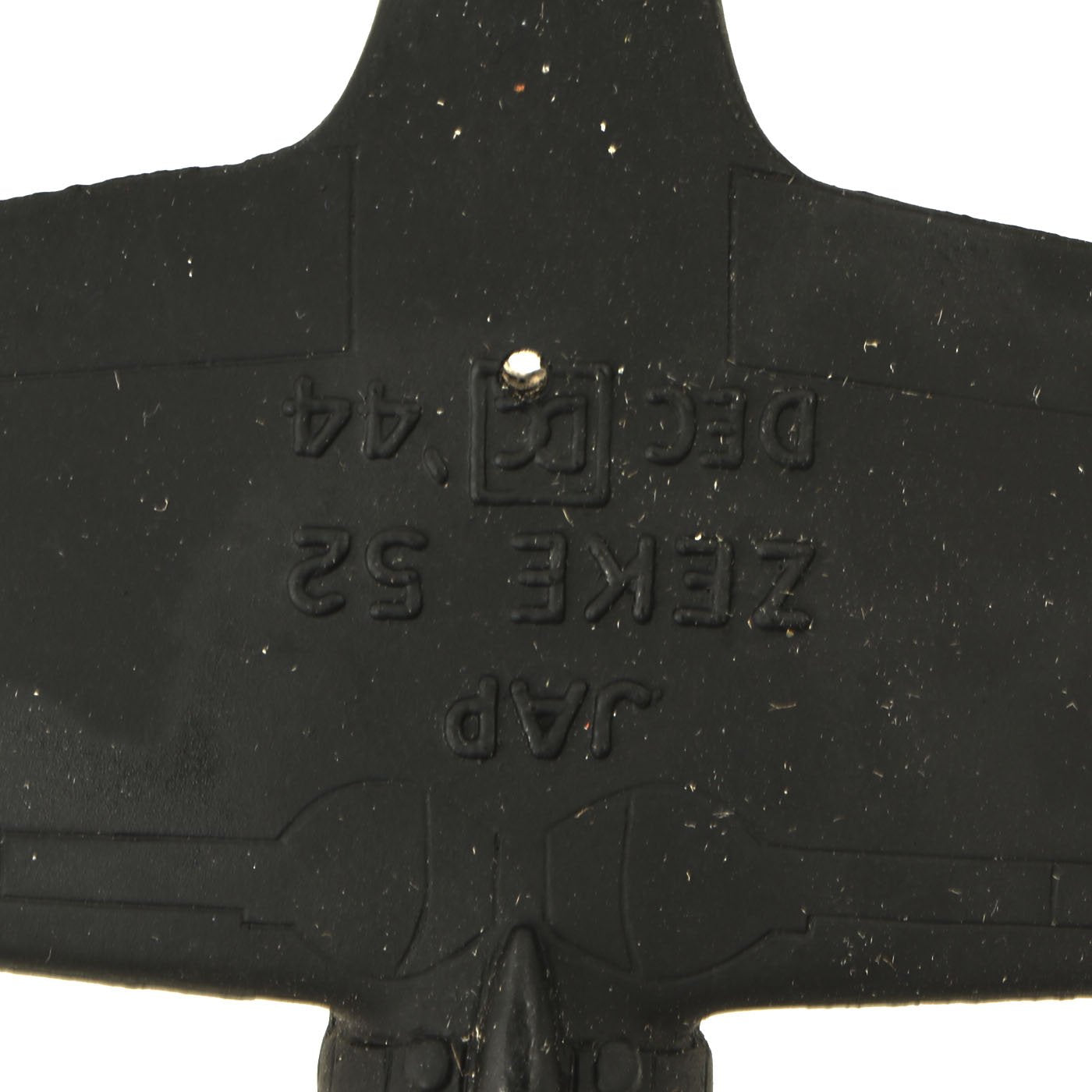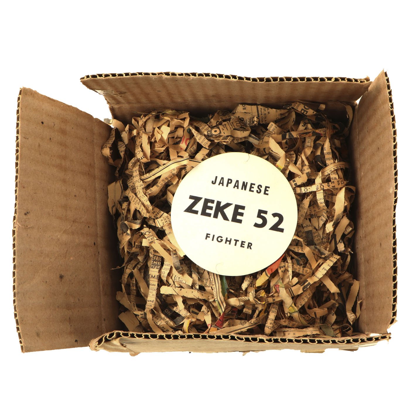 The included original box measures 7 1/4" x 6 7/8" x 2", and is stuffed with shredded newspaper. It still retains the original label on the side, indicating that it is an AIRCRAFT RECOGNITION MODEL for a ZEKE 52 JAPANESE FIGHTER. It also indicates that it was manufactured by DESIGN CENTER, INC. NEW YORK 19, N. Y.. There is even an original circular cardboard label intended for attachment to the model.