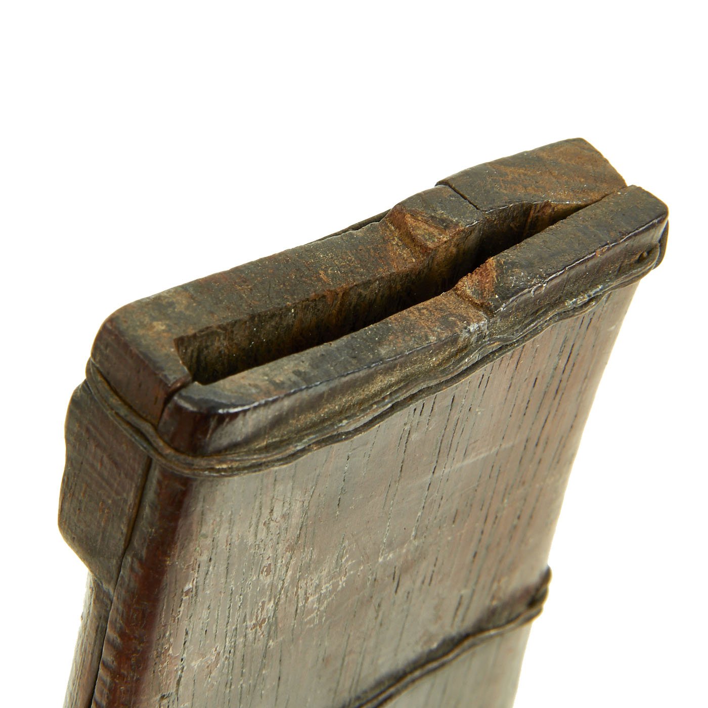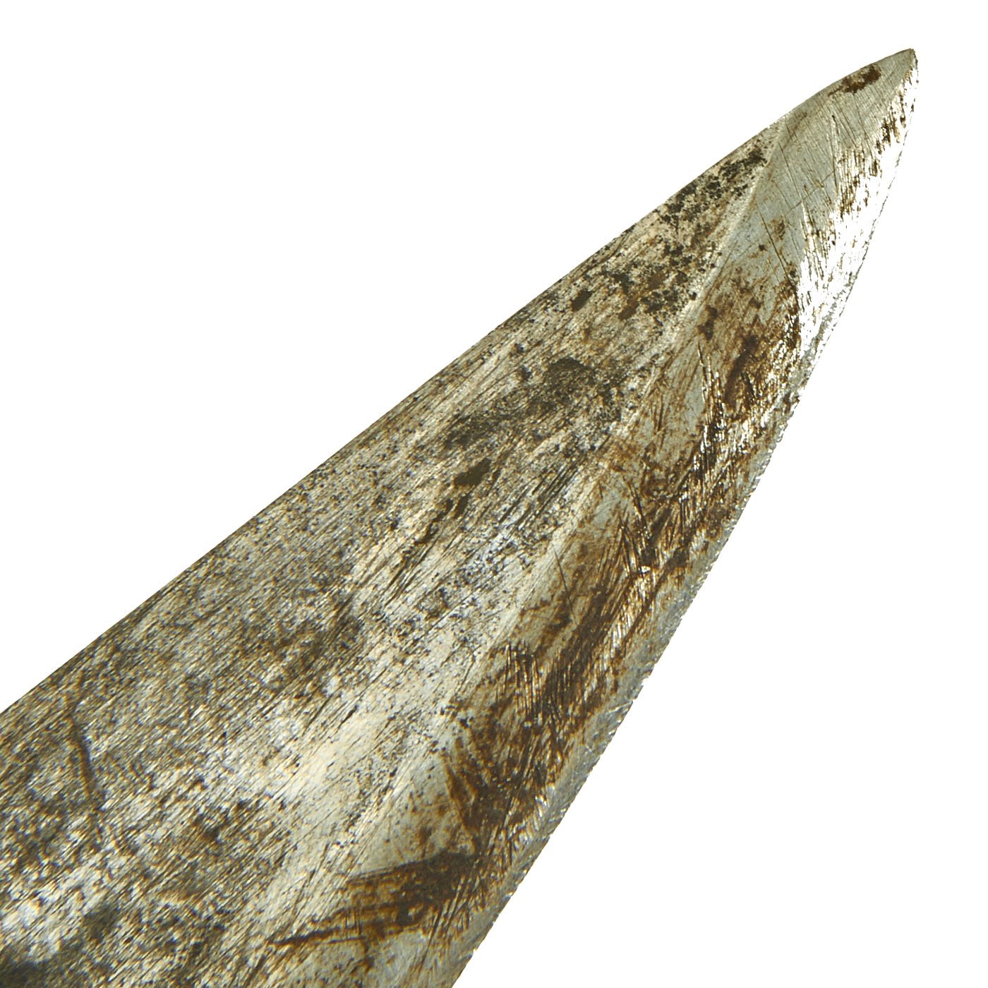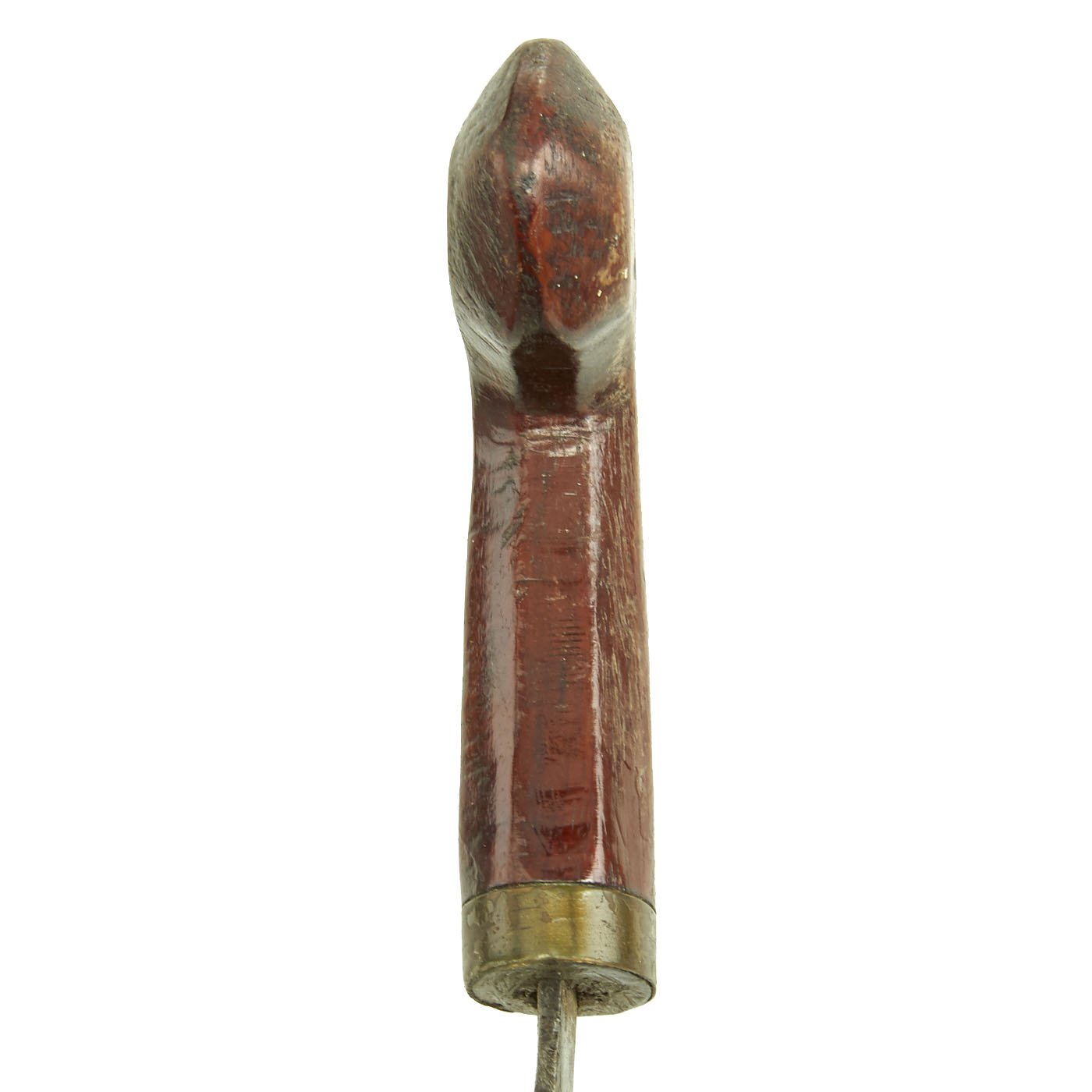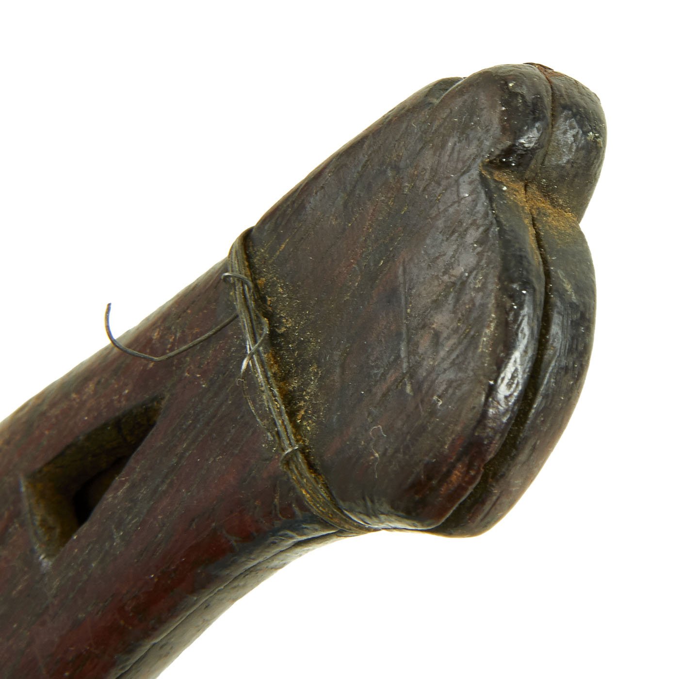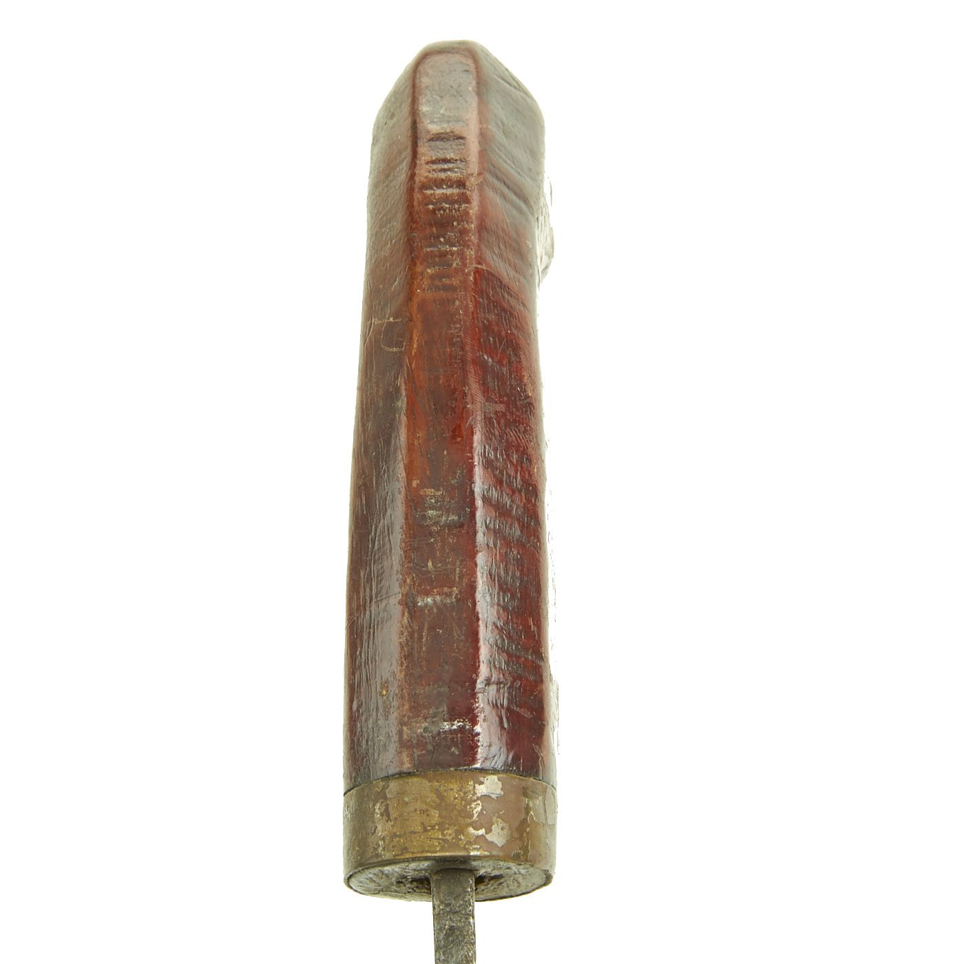 It comes contained in the original wood scabbard nicely bound with metal wire in 4 places. Originally it had wire in 6 places, but two wiring bindings are now missing. There are nice carvings around the throat and on the drag. It shows some wear but does not seem to be missing any wood. There is a bolster for attachment of a waist or shoulder strap, but there is only a short piece of rope in it.