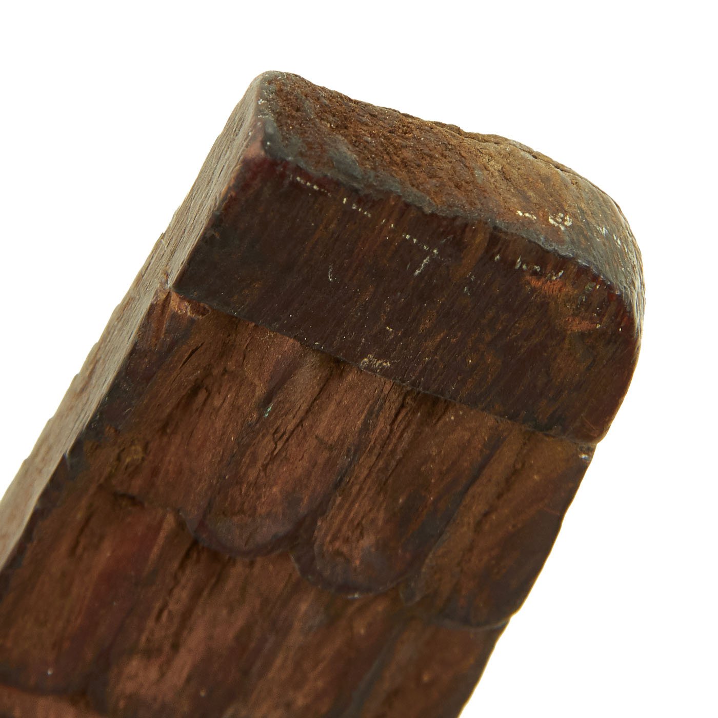 It comes contained in the original wood scabbard nicely bound with braided plant fibers in 4 places. It shows some wear but does not seem to be missing any wood. It has twine wrapped around it to attach to clothing or possibly around the waist, but it seems to short for that.