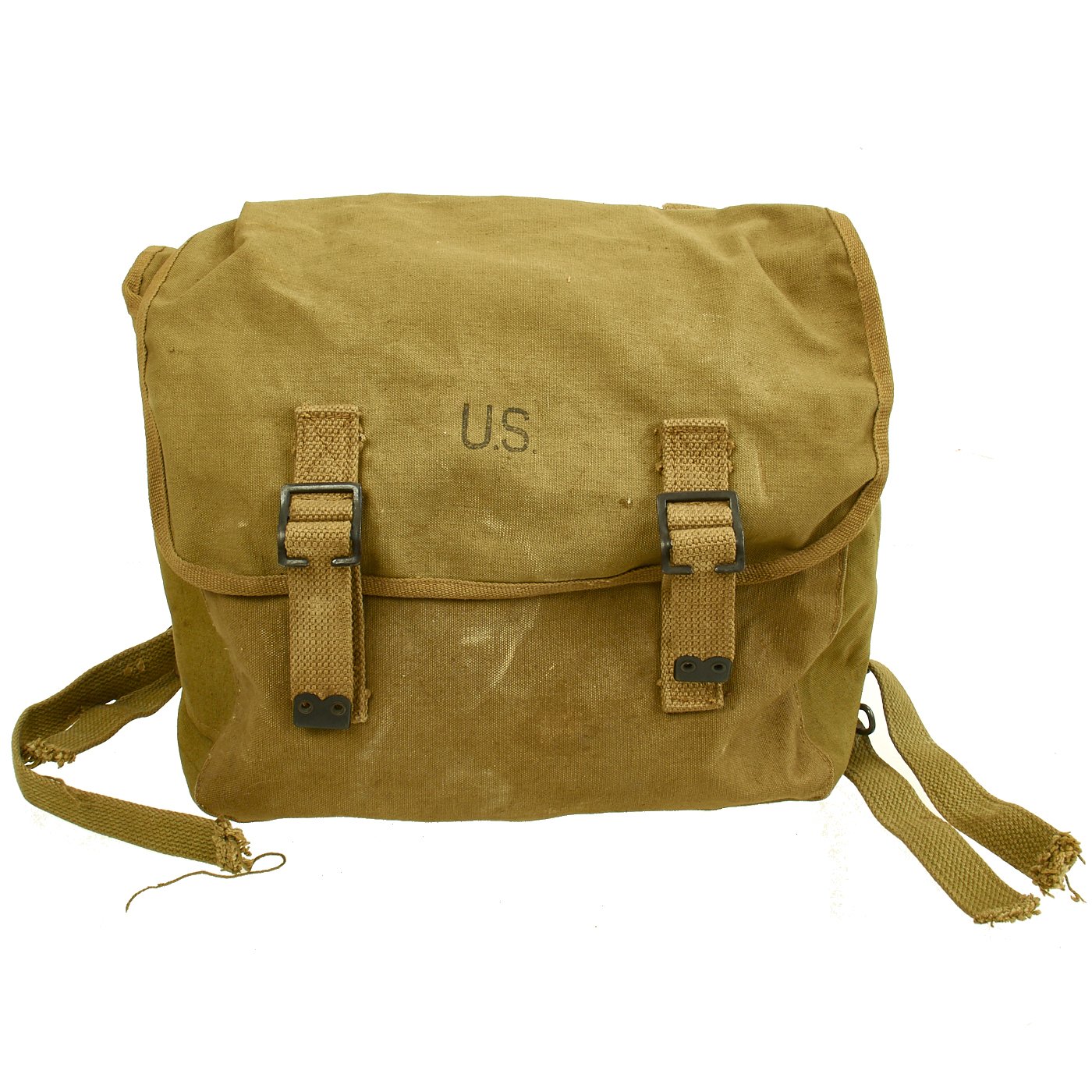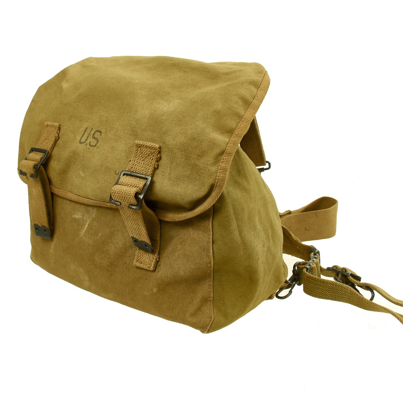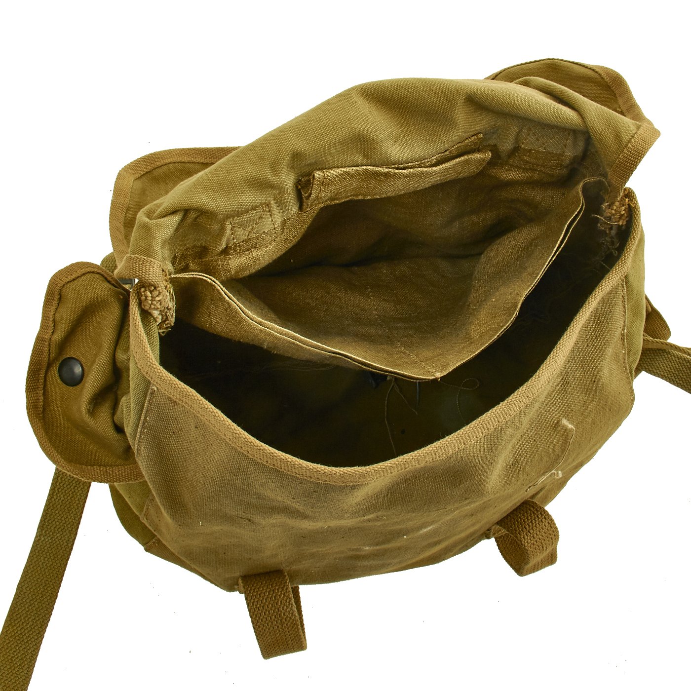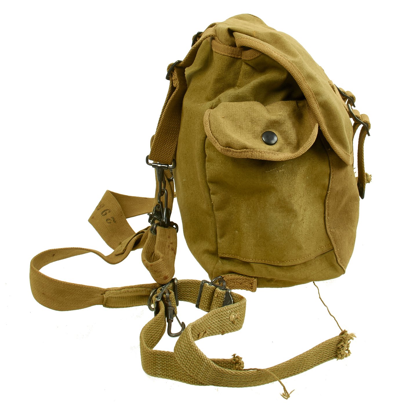Original Item: Only One Available. This is an very good example of an original U.S. Army musette bag, manufactured in Great Britain during WWII. The bag is of OD Green #3 canvas canvas construction, with slightly lighter tan trim. It is U.S. marked on the top flap. This unique piece of equipment can be worn as a knapsack or shoulder bag, and this example seems to have been set up as the former, as it has combat suspenders attached to it, though the rigging seems to be somewhat improvised, and possibly attached upside down at present.