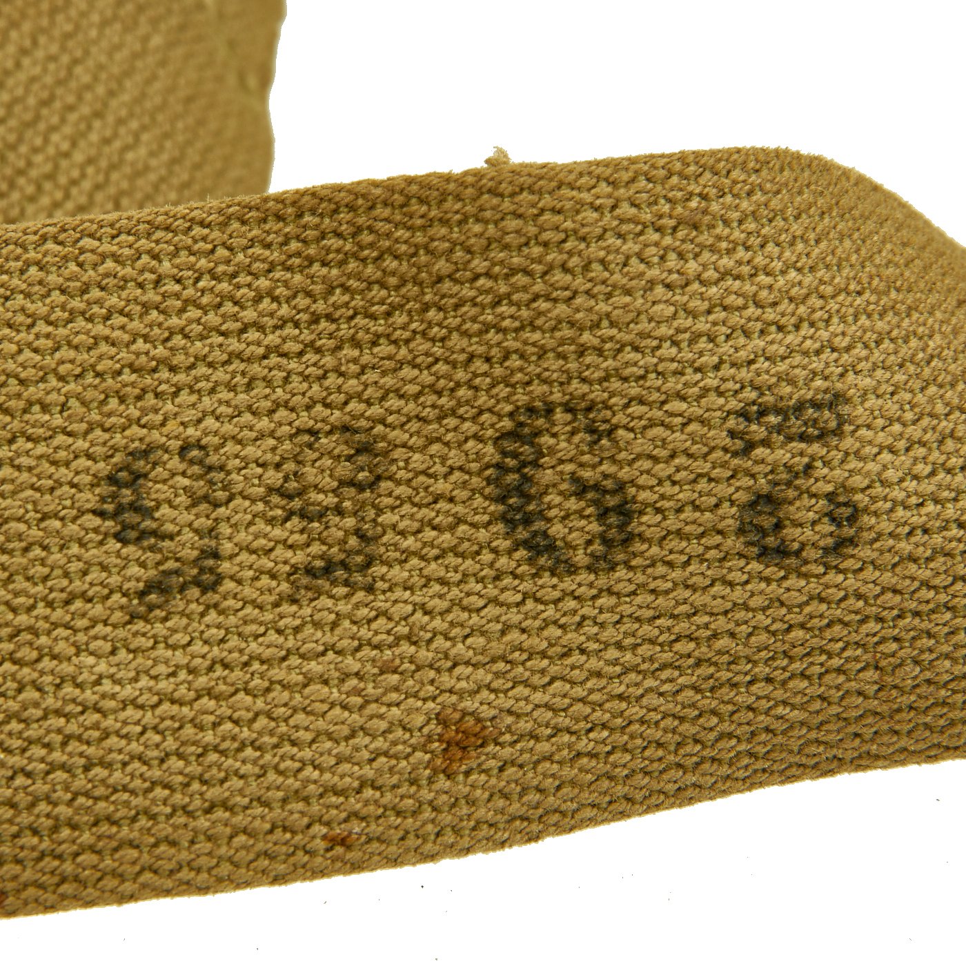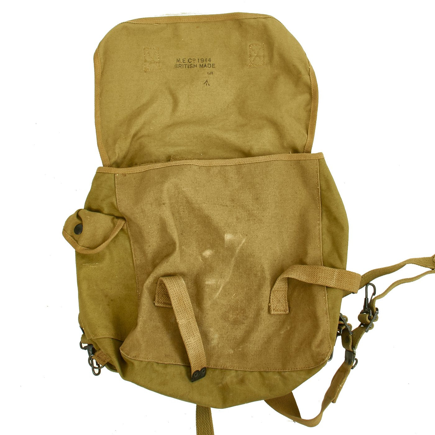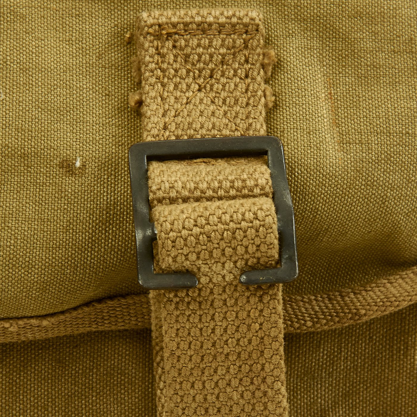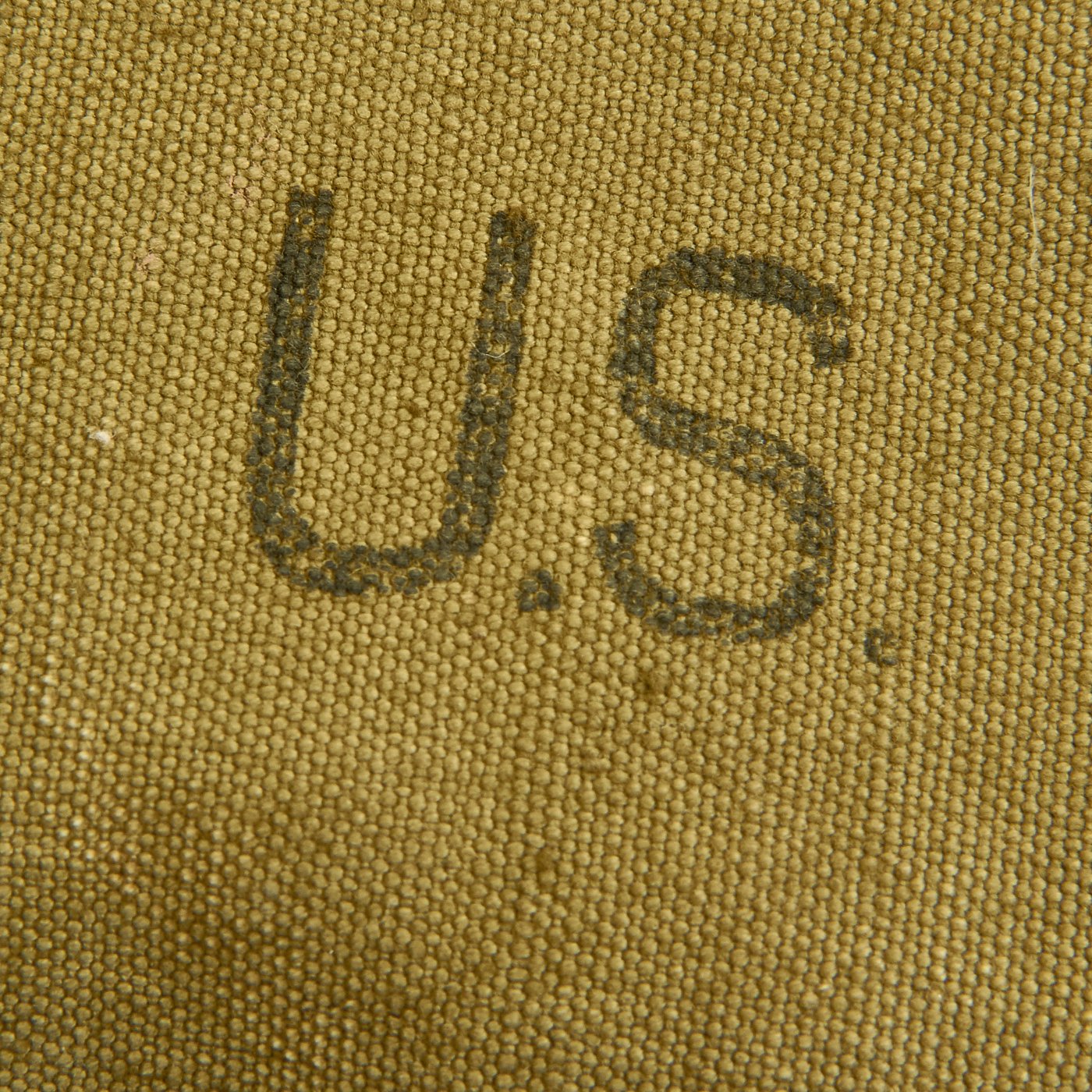 Original Item: Only One Available. This is an very good example of an original U.S. Army musette bag, manufactured in Great Britain during WWII. The bag is of OD Green #3 canvas canvas construction, with slightly lighter tan trim. It is U.S. marked on the top flap. This unique piece of equipment can be worn as a knapsack or shoulder bag, and this example seems to have been set up as the former, as it has combat suspenders attached to it, though the rigging seems to be somewhat improvised, and possibly attached upside down at present.