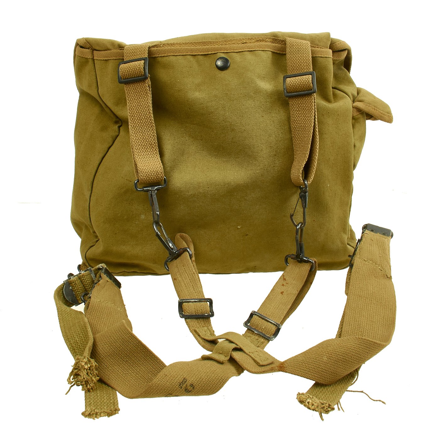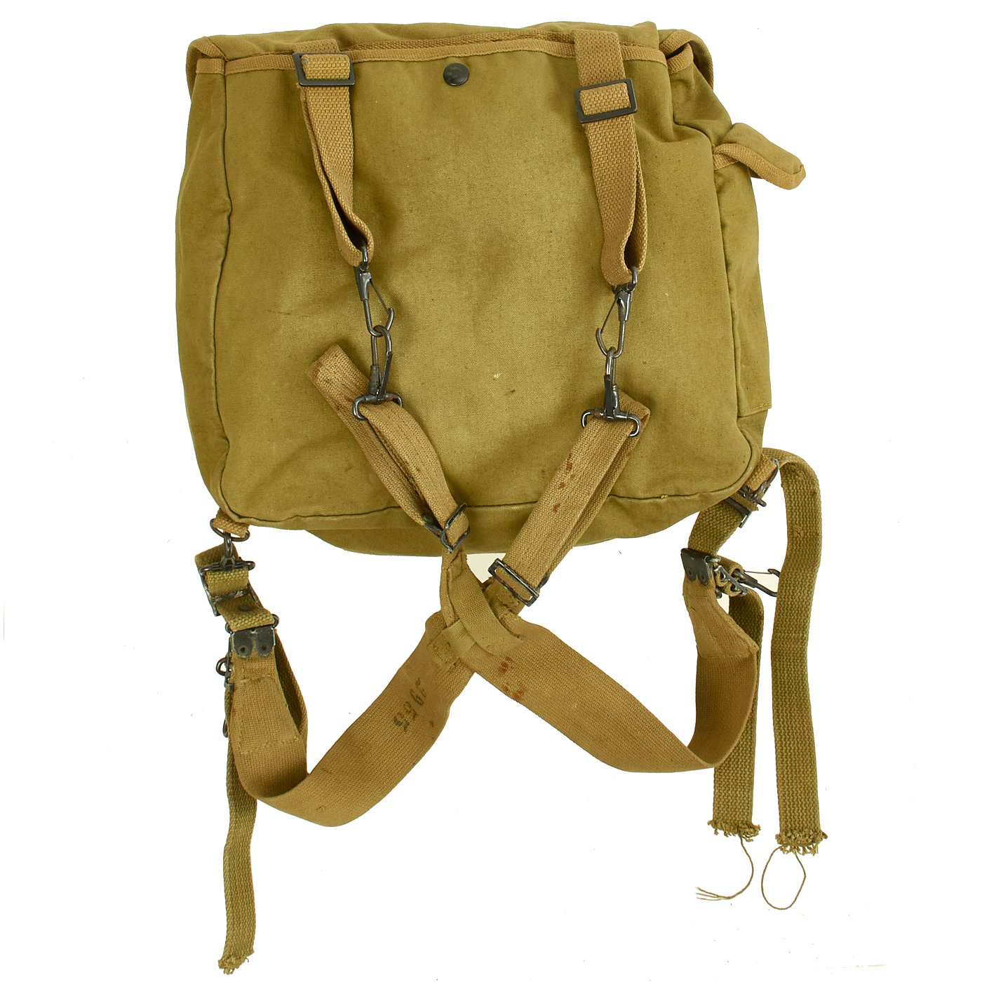 The bag is in great shape, showing only light wear, with all of the snaps and buckles working, with just a bit of oxidation on the fittings. The suspenders are a bit more worn, with some fraying and added rivets, so this was definitely a personalized setup.