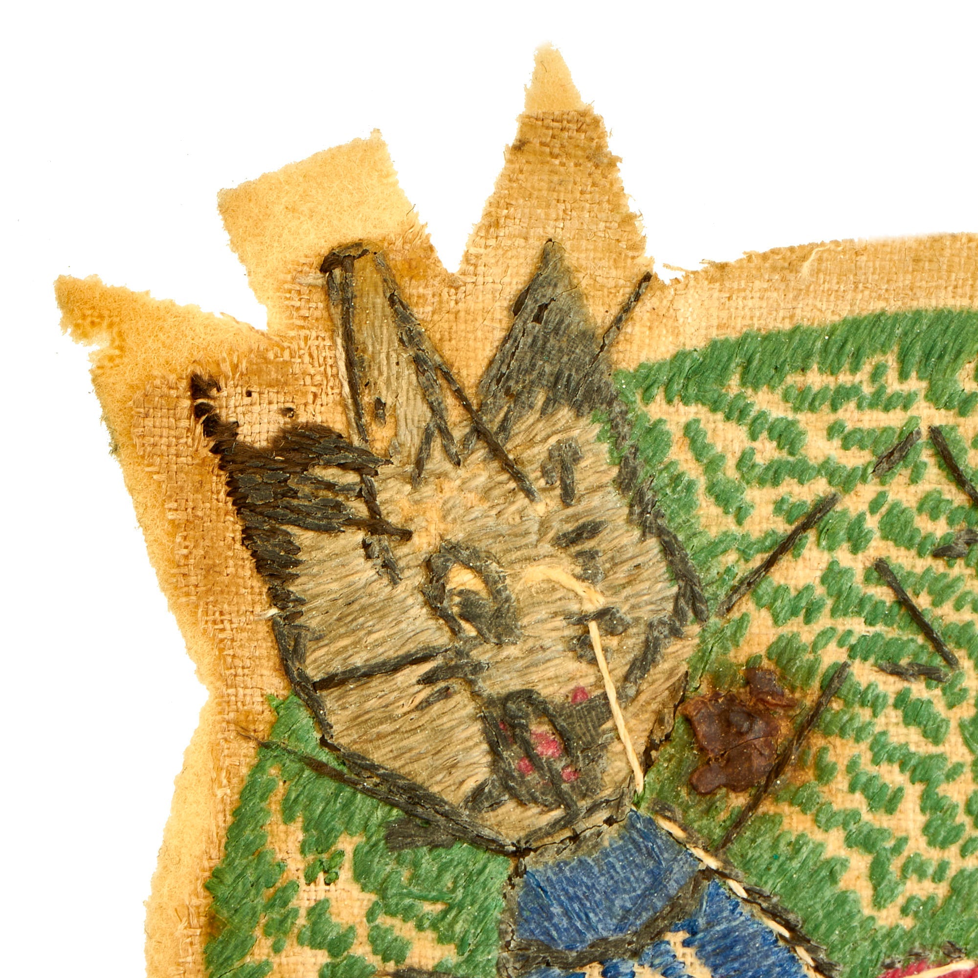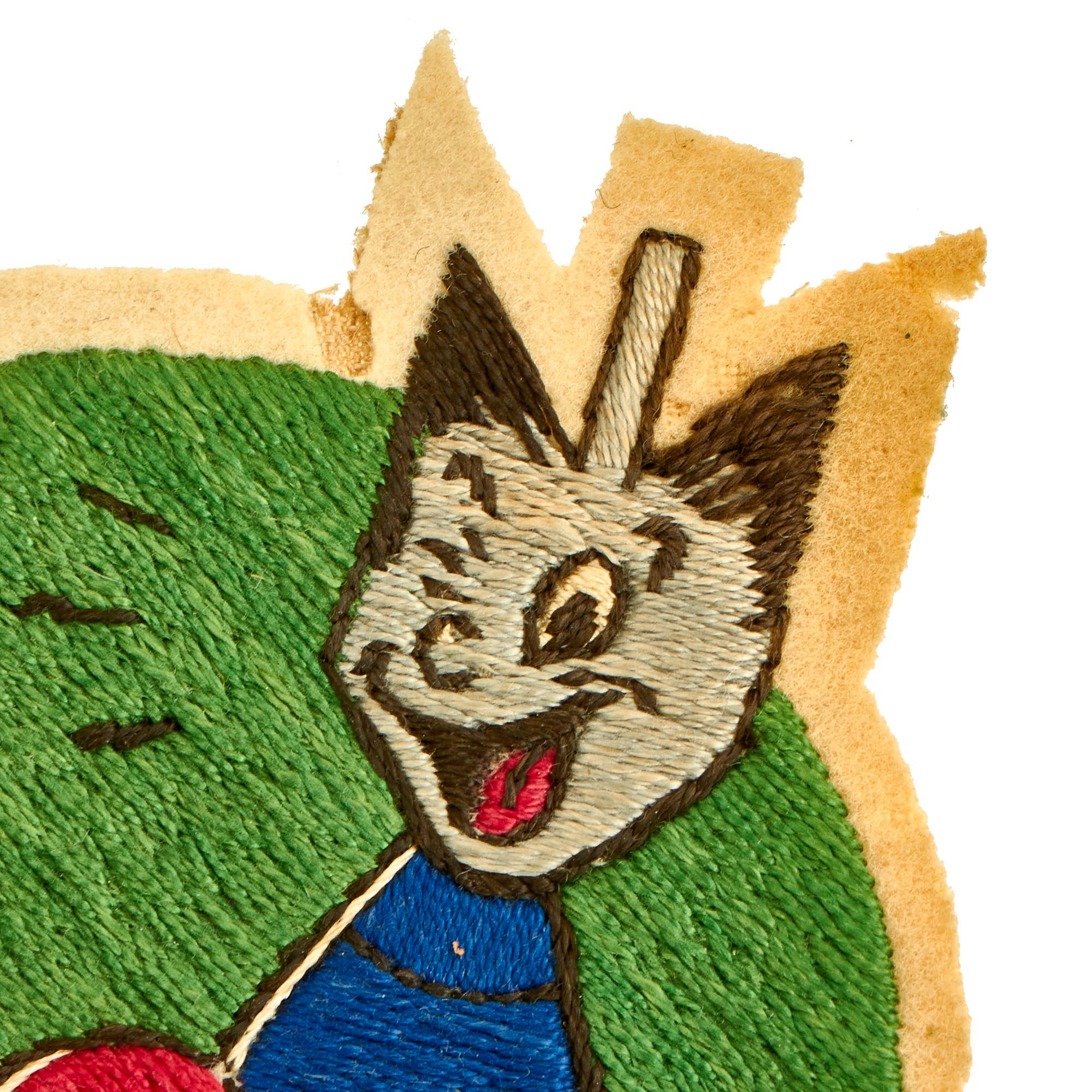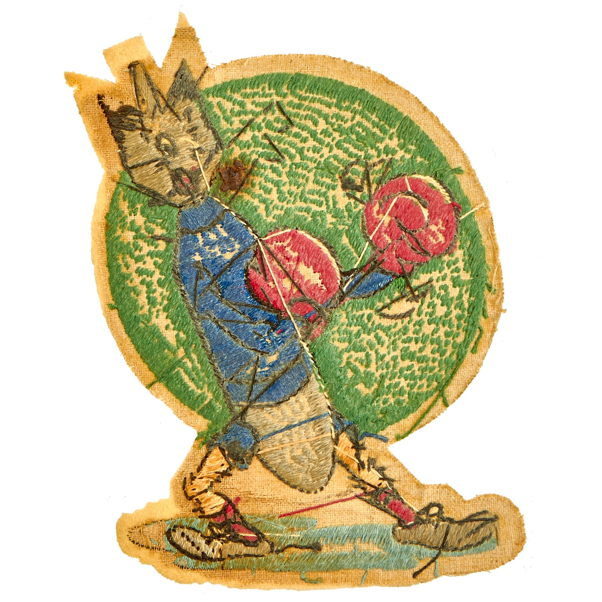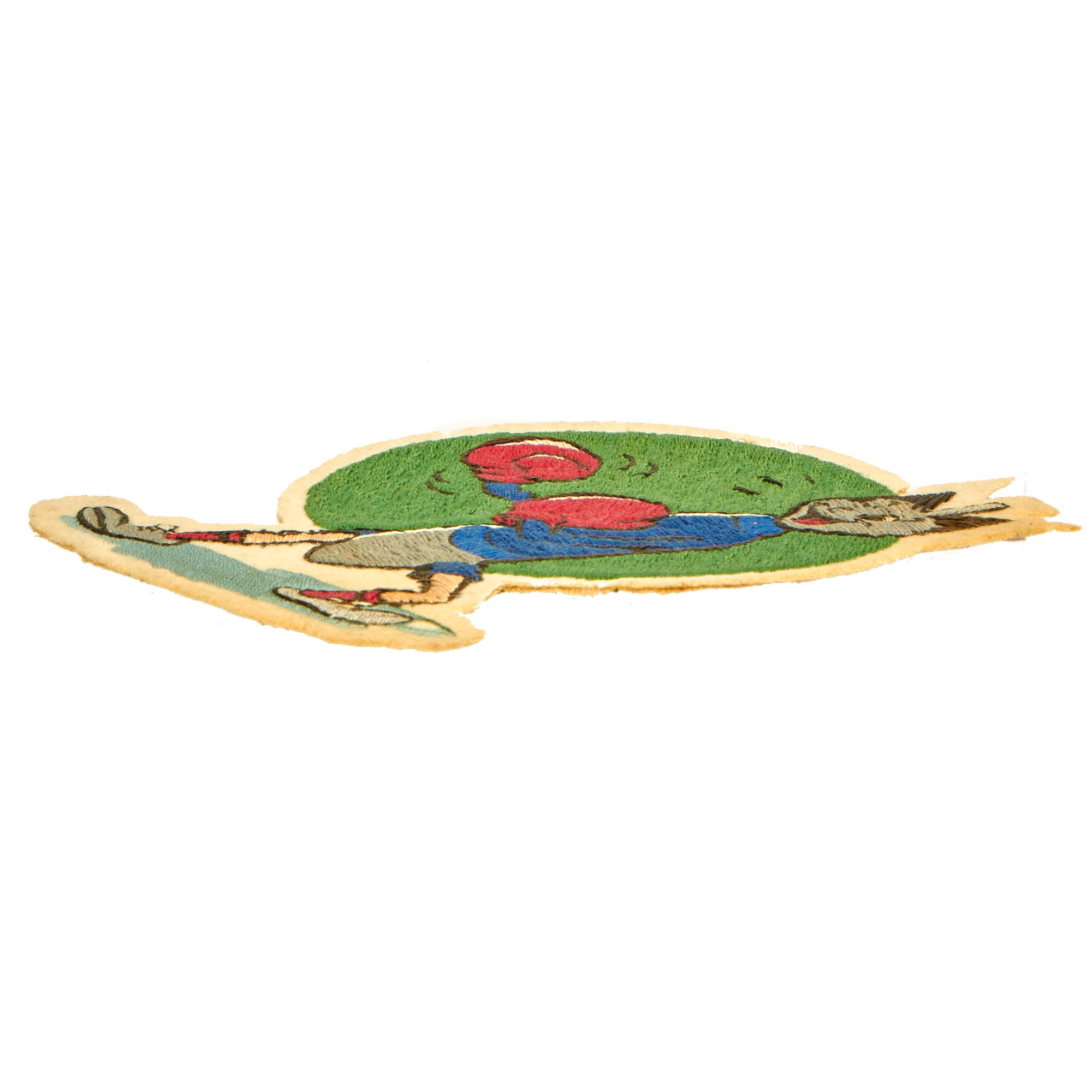 The patch measures approximately 6 ½” x 4 ⅛” and features a “boxing bomb” in a cocky leaned back stance with a winking smile. The embroidered portions are in wonderful condition with all material and colors retained very well. The only “real” issues with the patch is the beige felt exposed on the outer edges which does have some minor moth nips present. Aside from the nips, this is a spectacular example.
