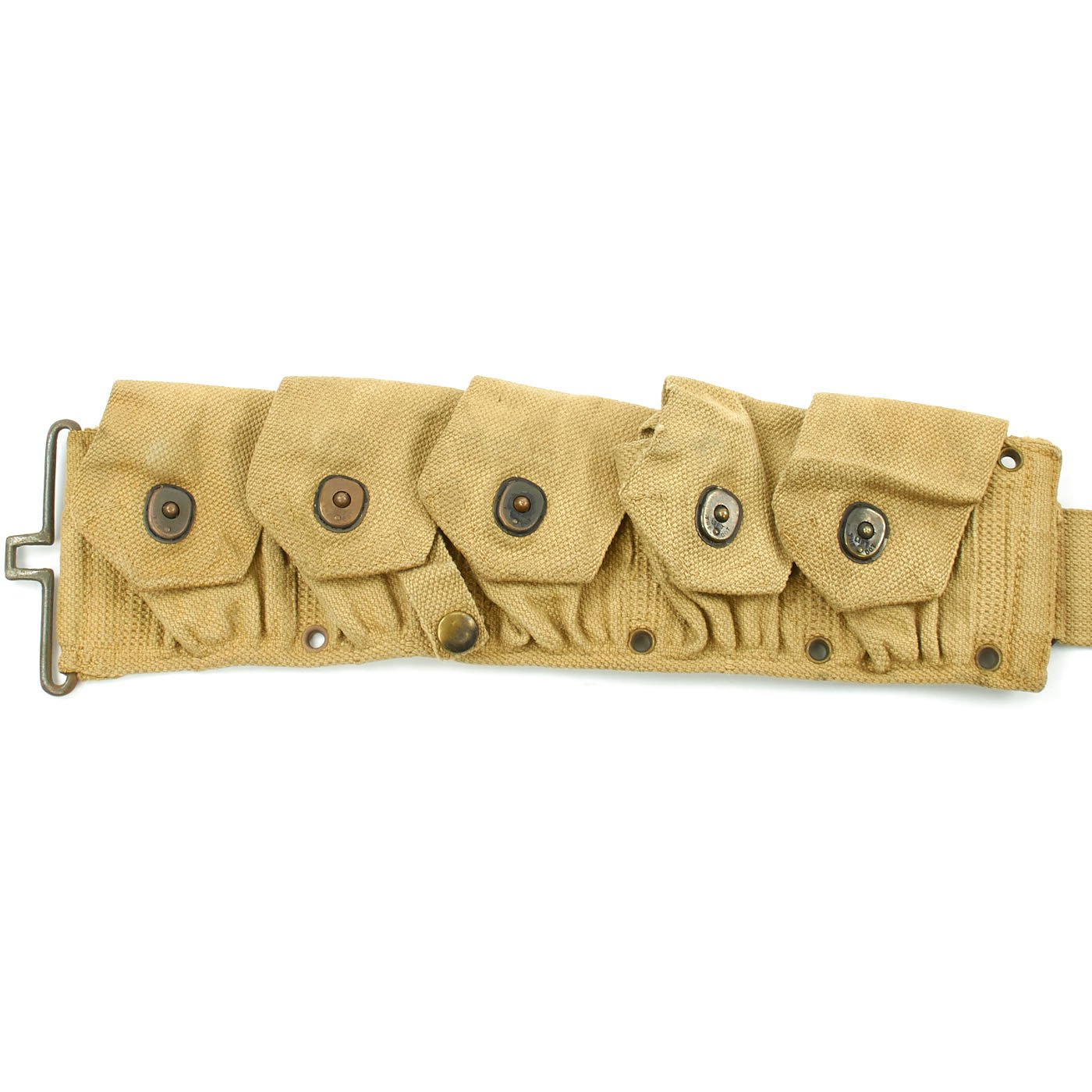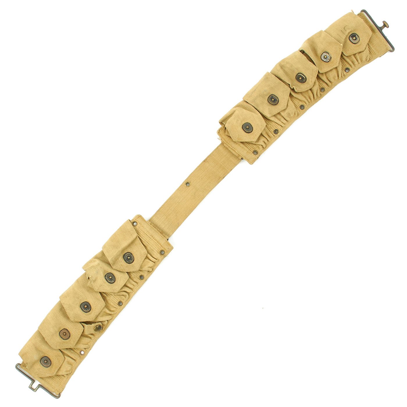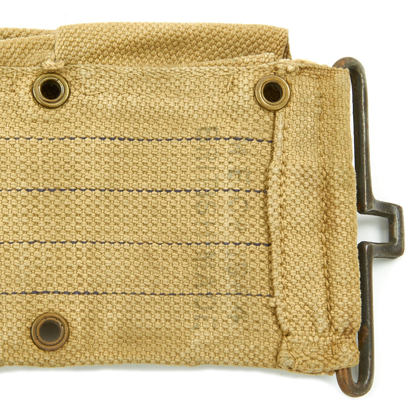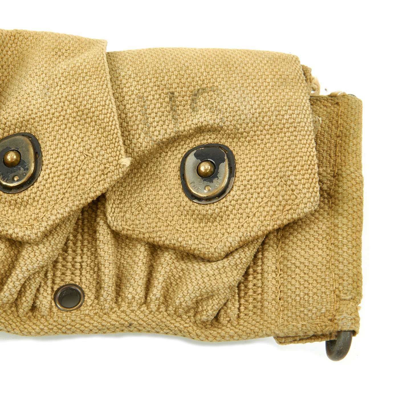 Original Item: Only One Available. This is a very nice Original US Army issue OD Green / Khaki canvas 10-Pocket ammunition belt for use with both Springfield and Garand Rifles. It does have some wear, and fading, so the US ink stamp is faint. When OD Green #3 wears, it ends up looking khaki, so we cannot tell if this was originally khaki or not.