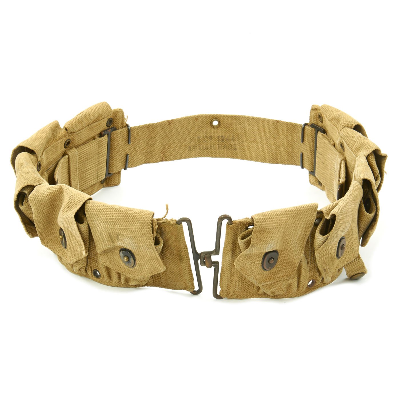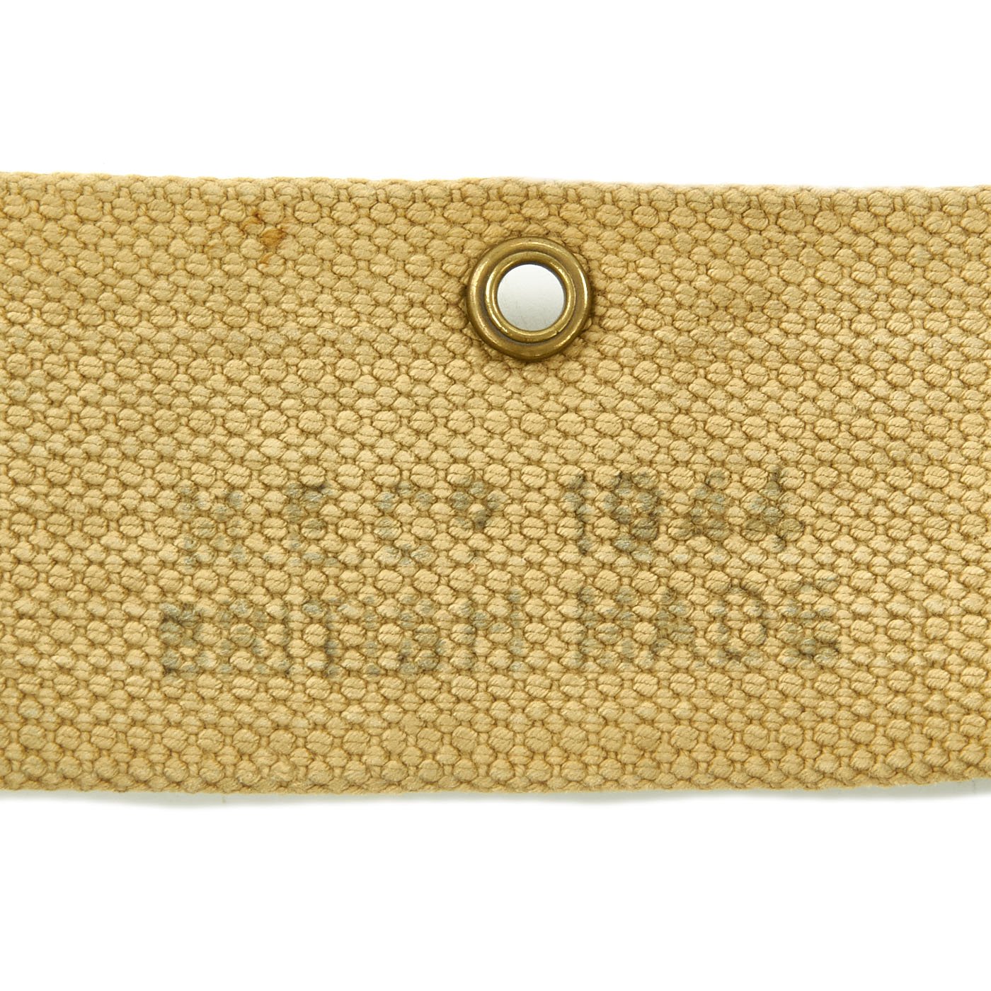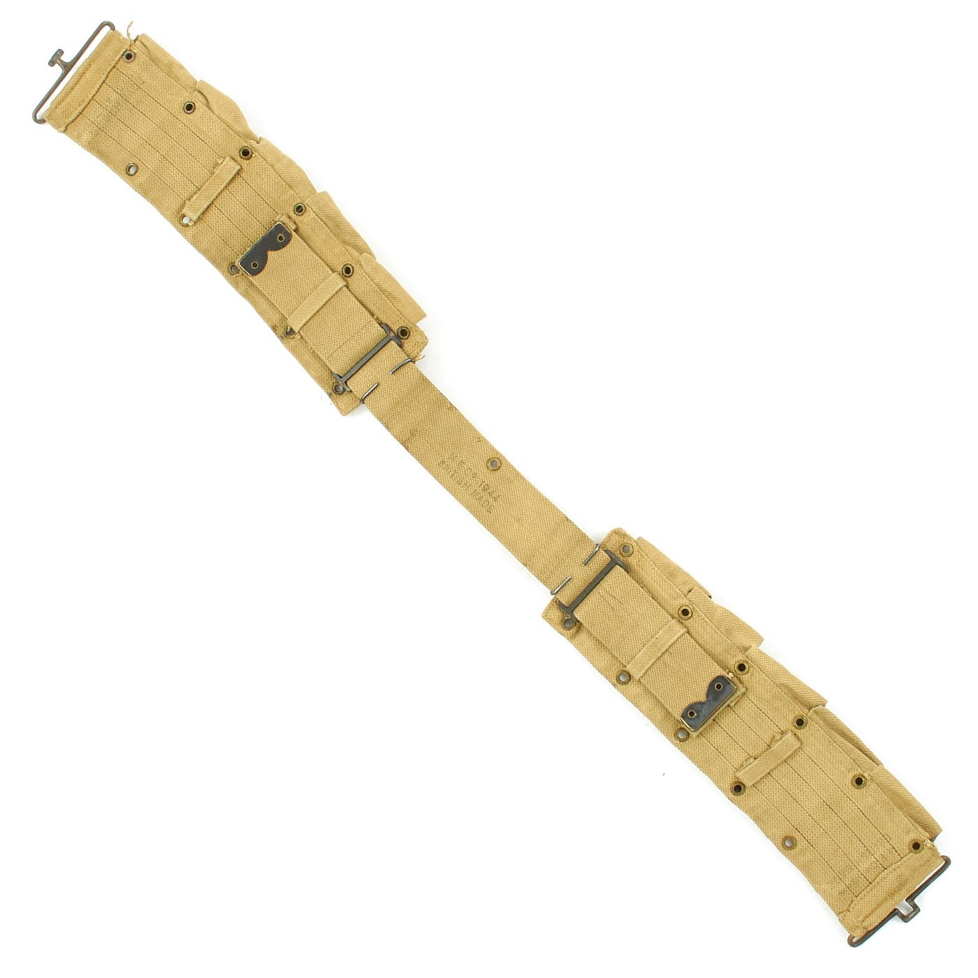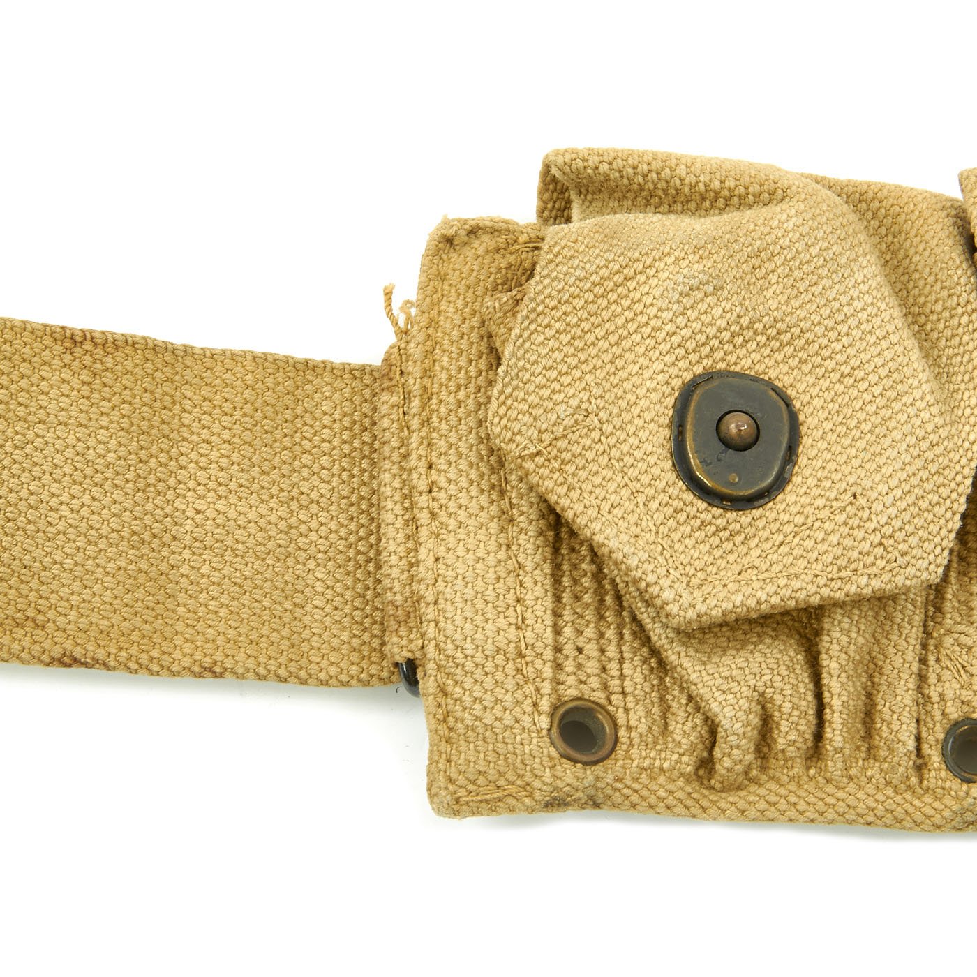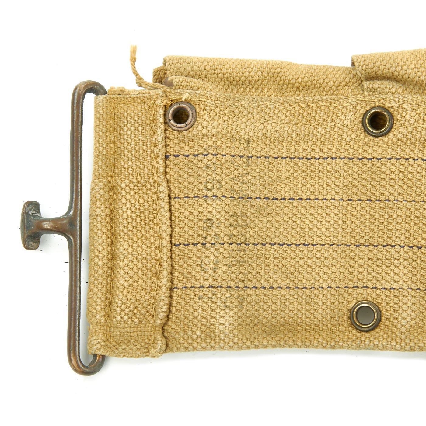 Original Item: Only One Available. This is a very nice Original US Army issue OD Green / Khaki canvas 10-Pocket ammunition belt for use with both Springfield and Garand Rifles. It does have some wear, and fading, so the US ink stamp is faint. When OD Green #3 wears, it ends up looking khaki, so we cannot tell if this was originally khaki or not.