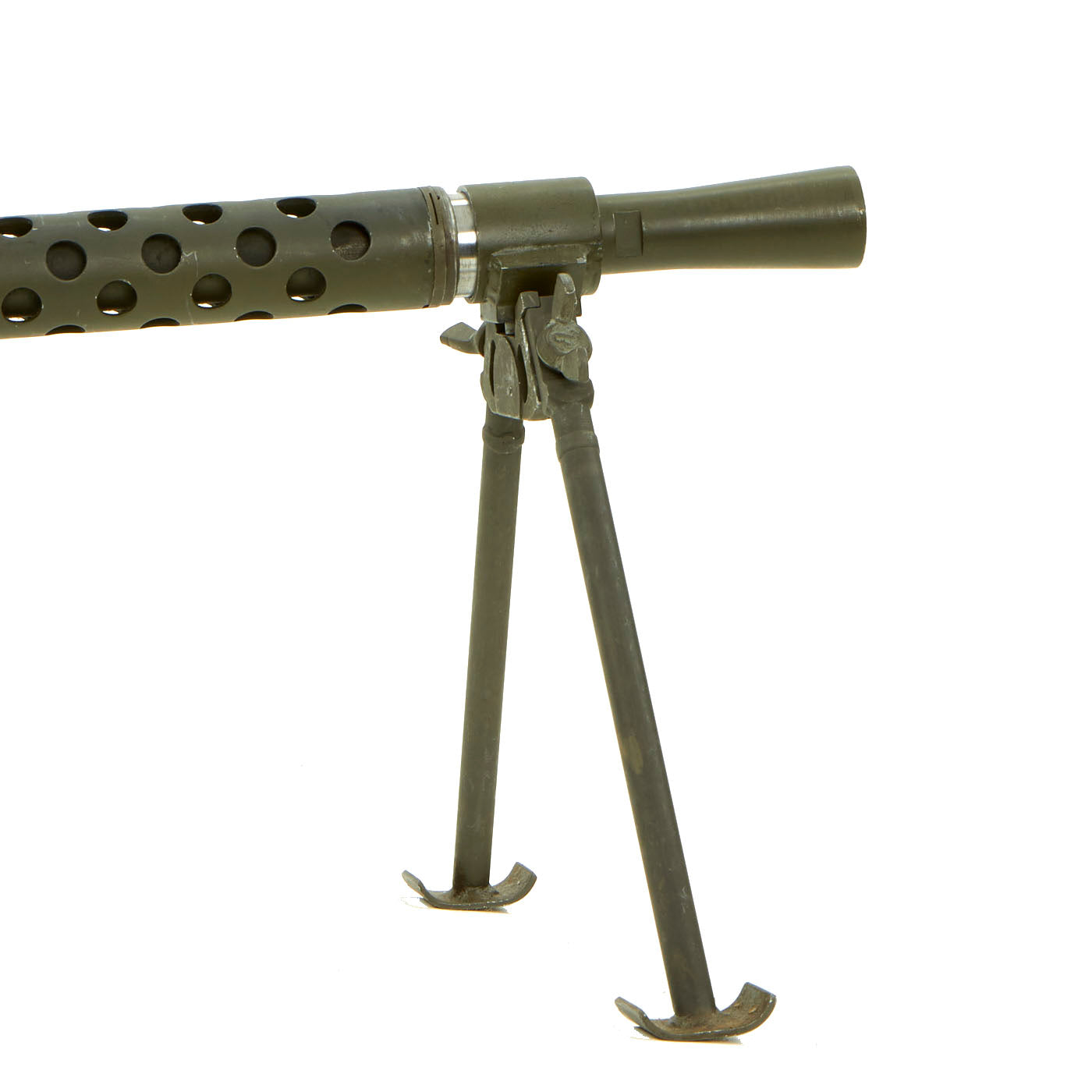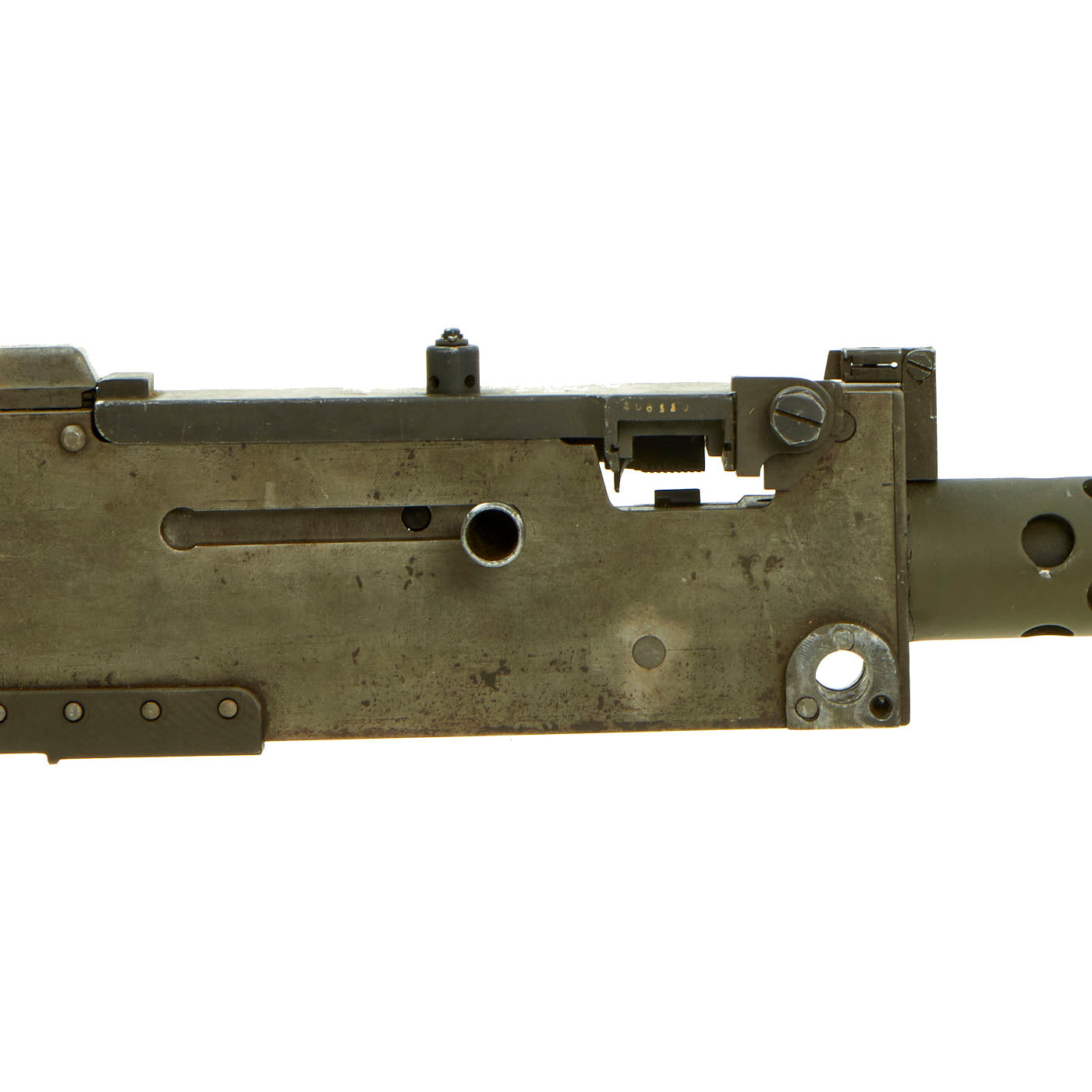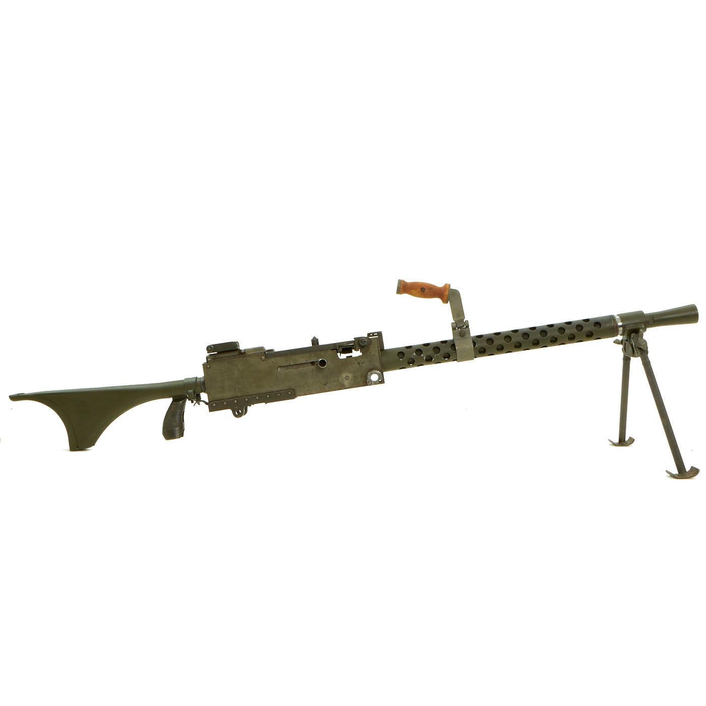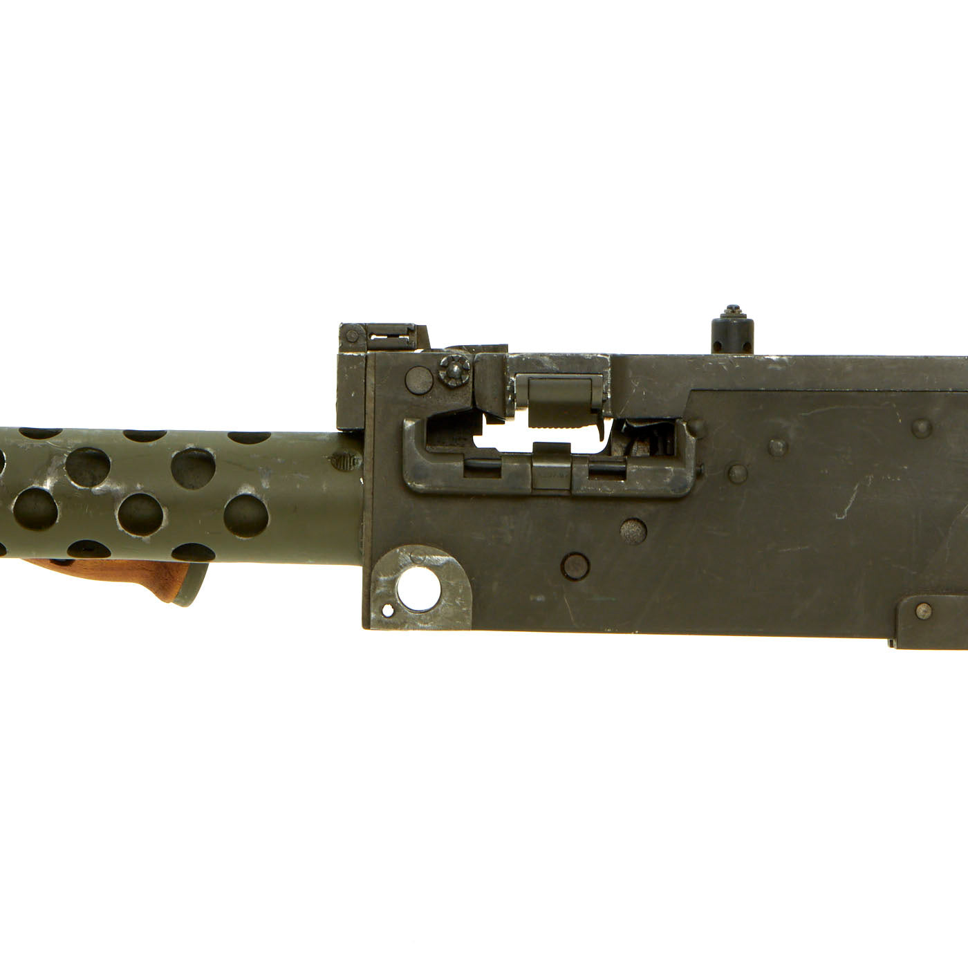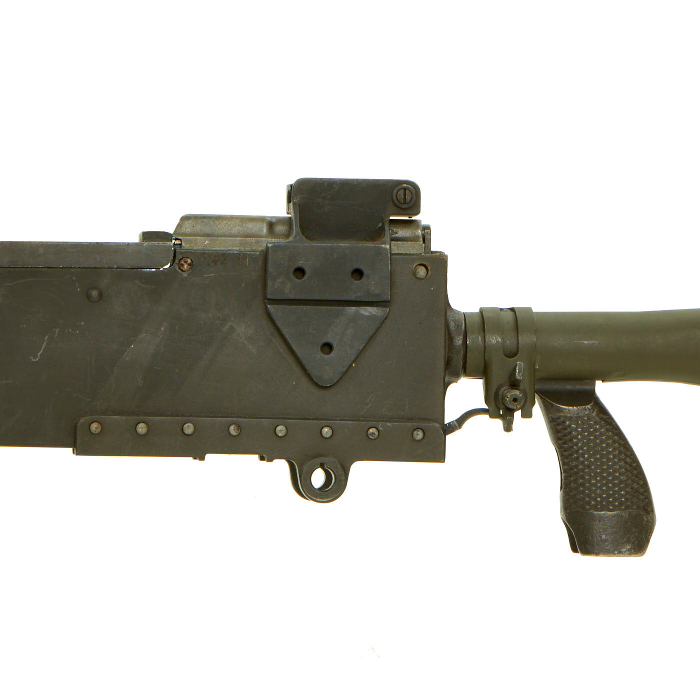 IMA is proud to offer a totally non-firing BATF approved display machine gun built from WWII type parts and constructed with precision detail. The top cover opens and most of the original markings remain, this is easily the best and perhaps only non-firing display 1919A6 on the market today. The right side plate is BATF approved non-functional inert reproduction manufactured in the USA with replicated wartime markings. The bipod is the correct WWII type that mounts to the barrel bushing, not the post war Israeli type. Comes complete with a very attractive carry handle, flash hider, and removable butt stock as well.