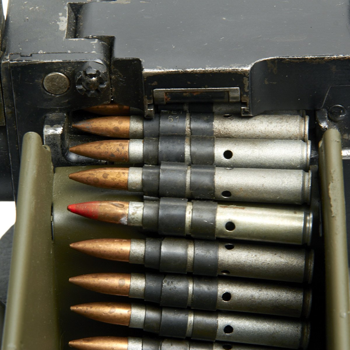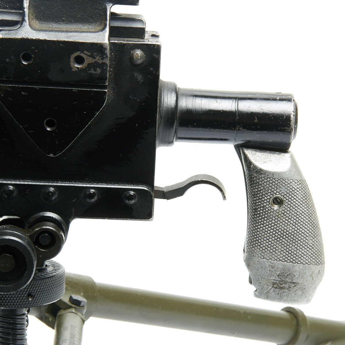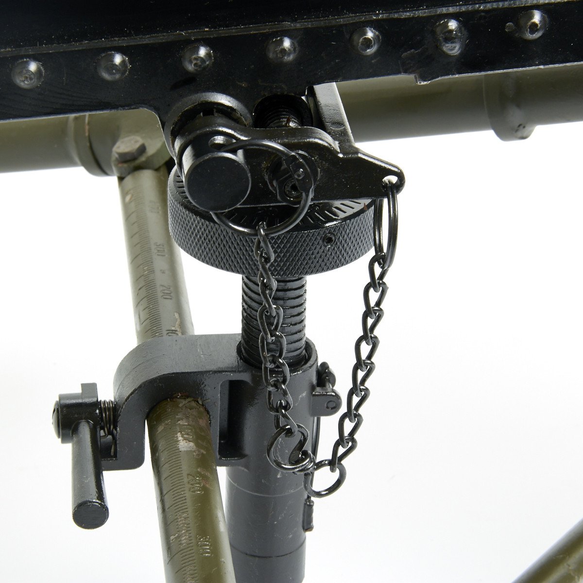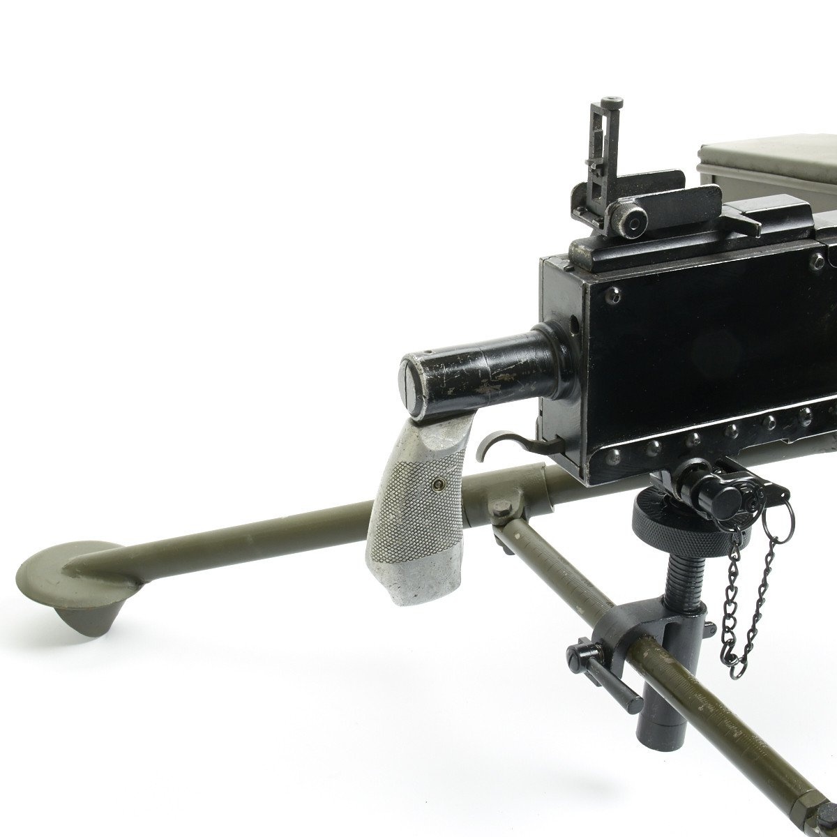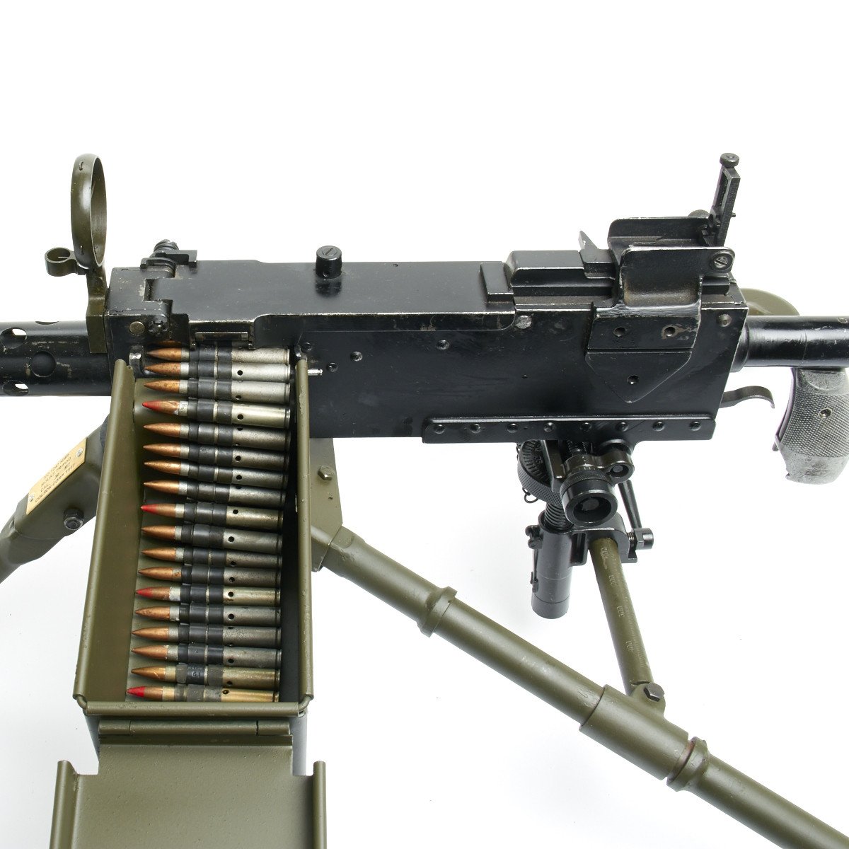 IMA is proud to offer a totally non-firing BATF approved display machine gun built from mostly WWII era parts and constructed with precision detail. The top cover opens, the bolt moves, most of the original markings remain, this is easily the best display 1919A4 on the market today, if not the only. We also include an all steel new made M2 Tripod with T&E, pintle, feed tray and 50 rounds of .30 ball cartridges in a cloth belt to complete your display.