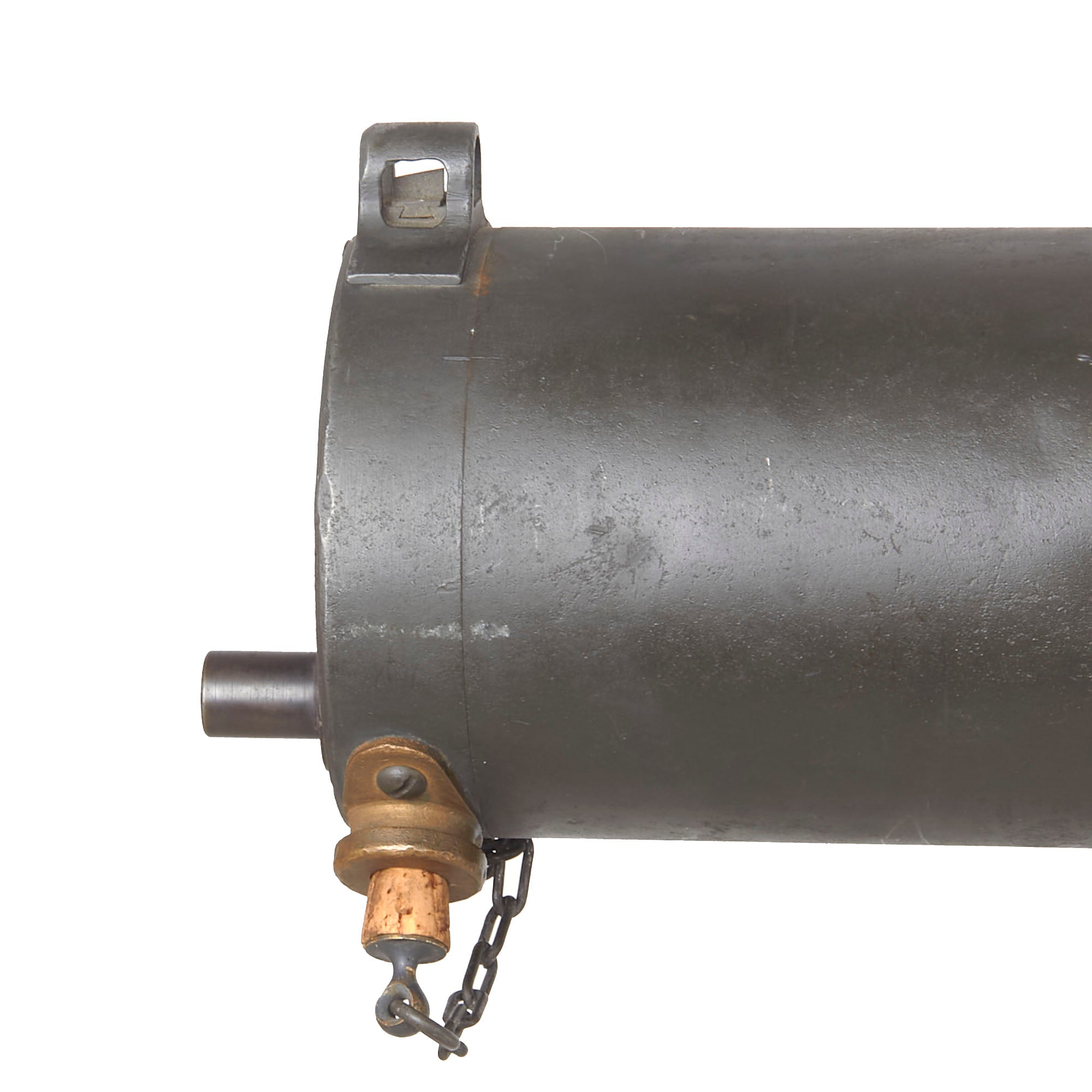 The M1917A1 tripod and cradle are offered in very good condition, and as far as we can tell, it is fully functional and complete. We checked all the adjustments, the pintle latch, and so forth, and all appear to work, with the only missing part being the cross pin for the rear mounting point. The original data plate on the rear leg is unfortunately missing, as are the leather tie straps that would be retained under it. There is however a marking on bottom of the central hub, added when it was updated for WWII: