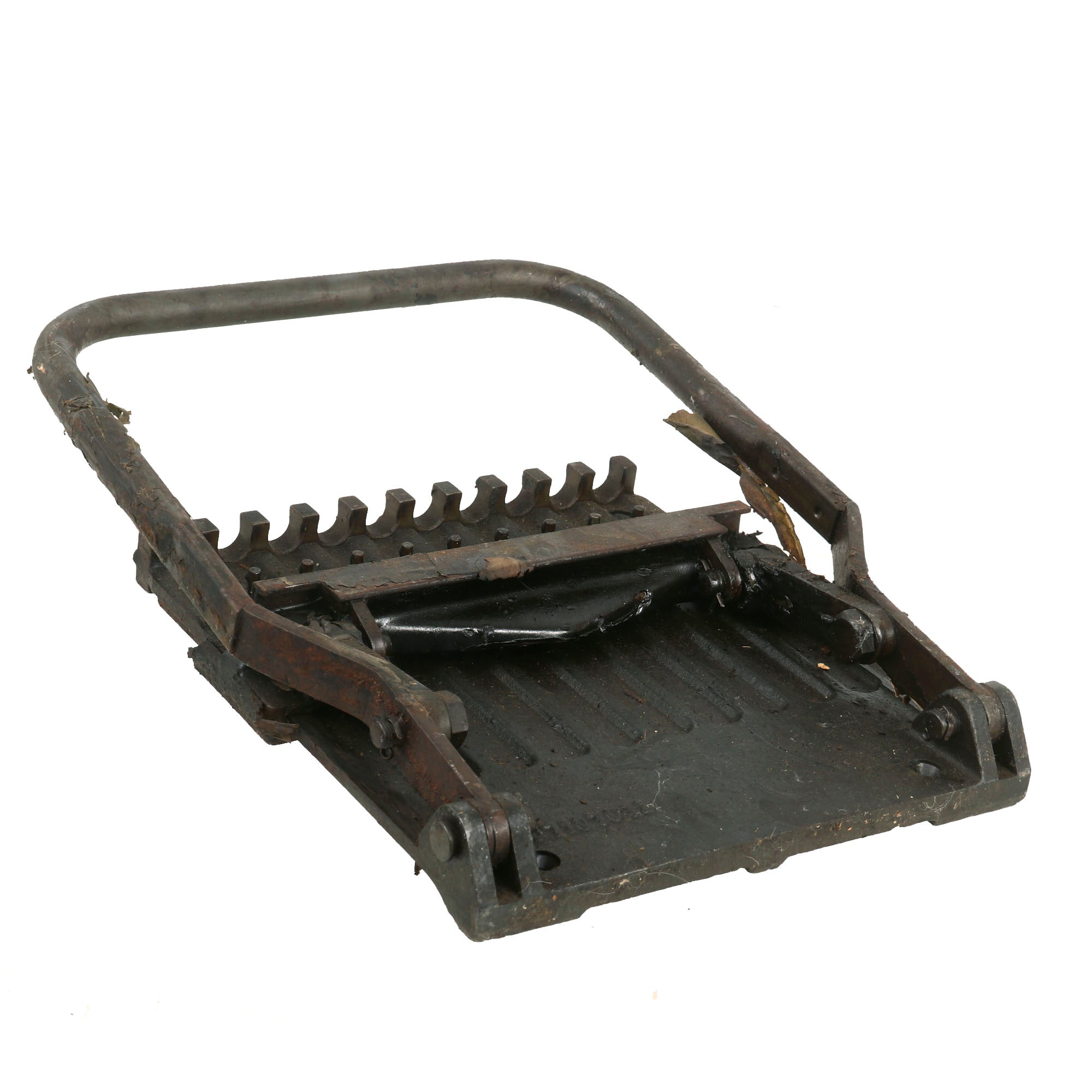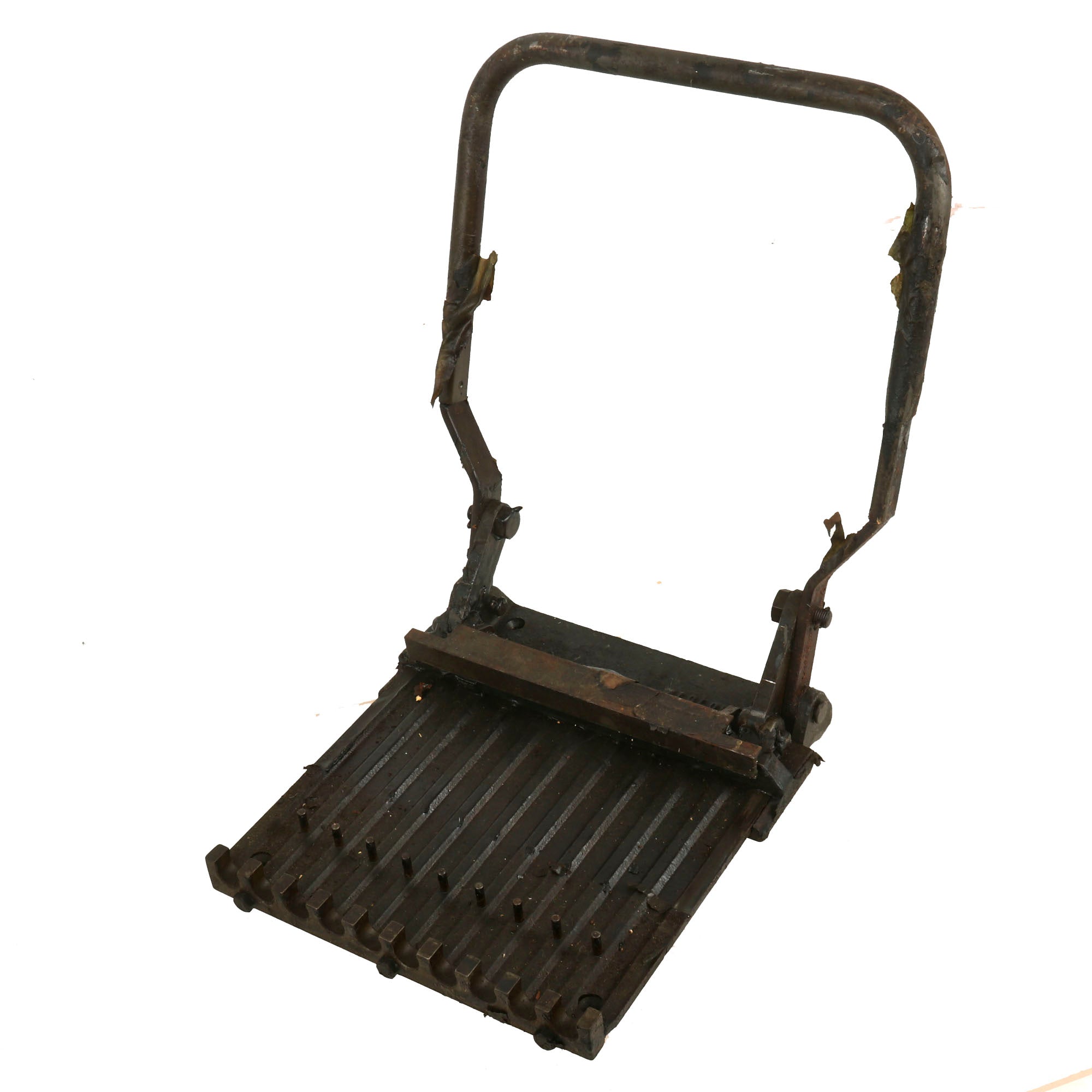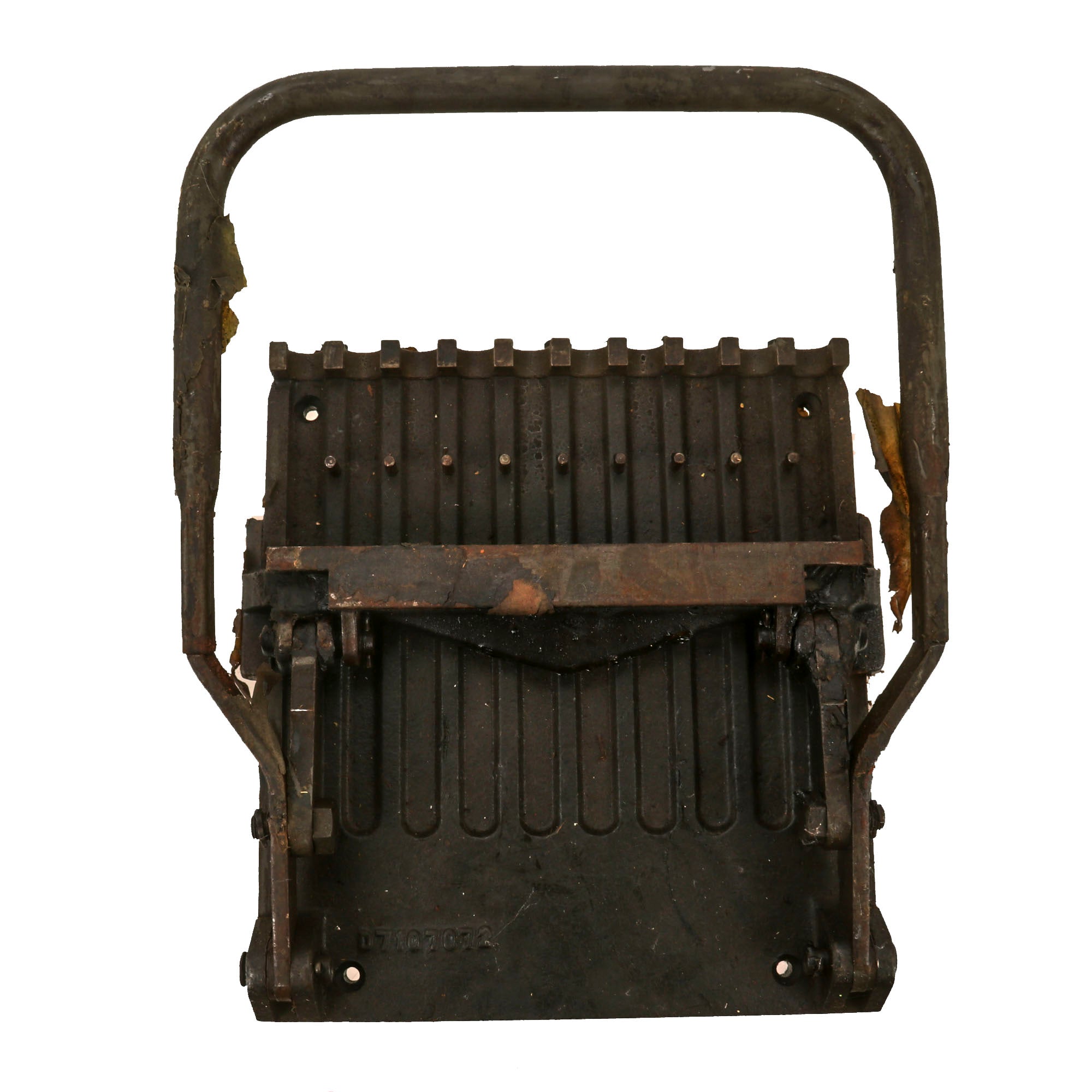 The belt loader is marked D7107072 on the top. On the bottom, it is marked 1900 CORP. 4. The base measures 11" x 10”, with the hand crank extending roughly 15” upward when stationary. Will likely still function as originally intended. The handle locks in the downward position for easy transport, and it also has holes in the base plate for attaching to a table (screws not included). A very scarce piece of equipment ready for further research and display.
