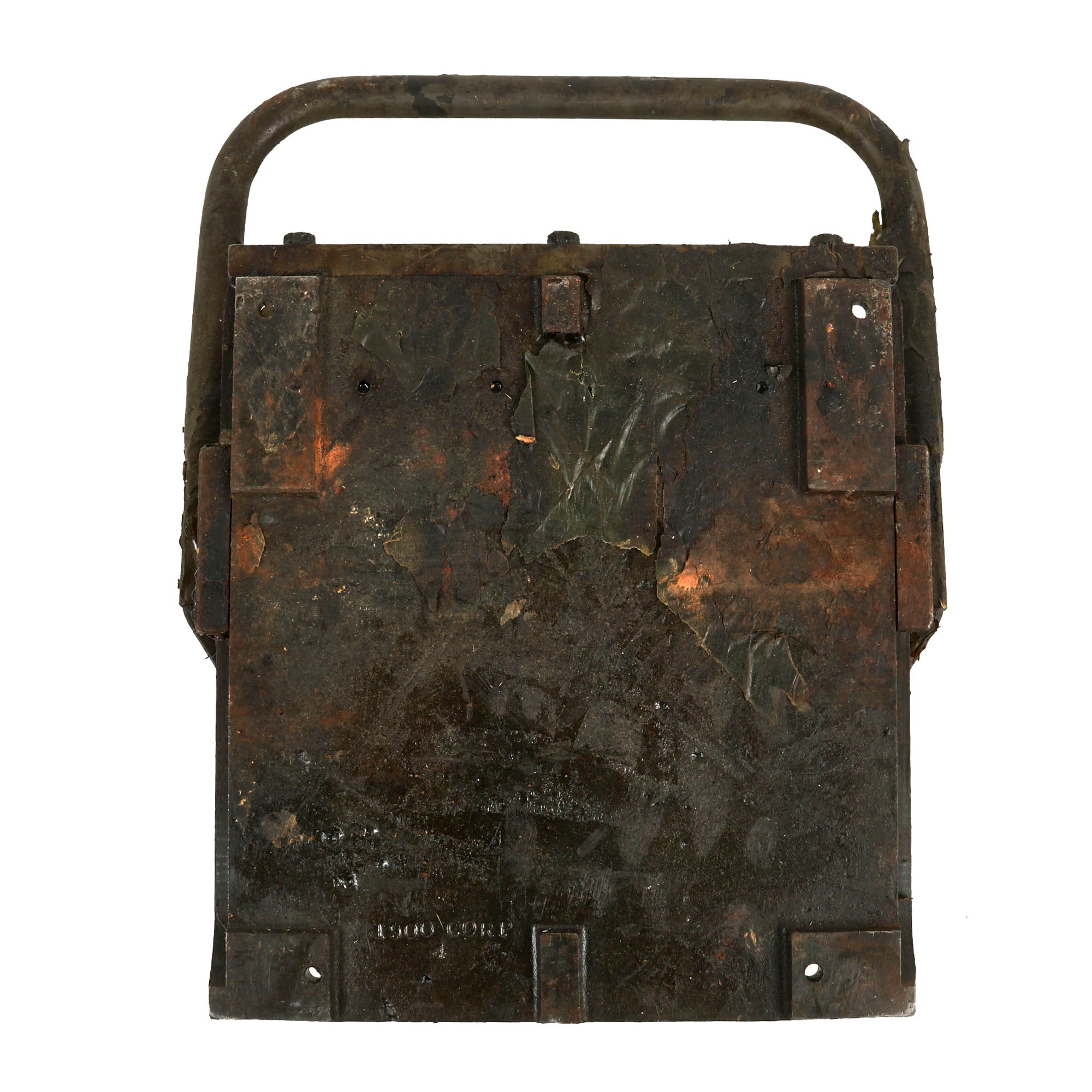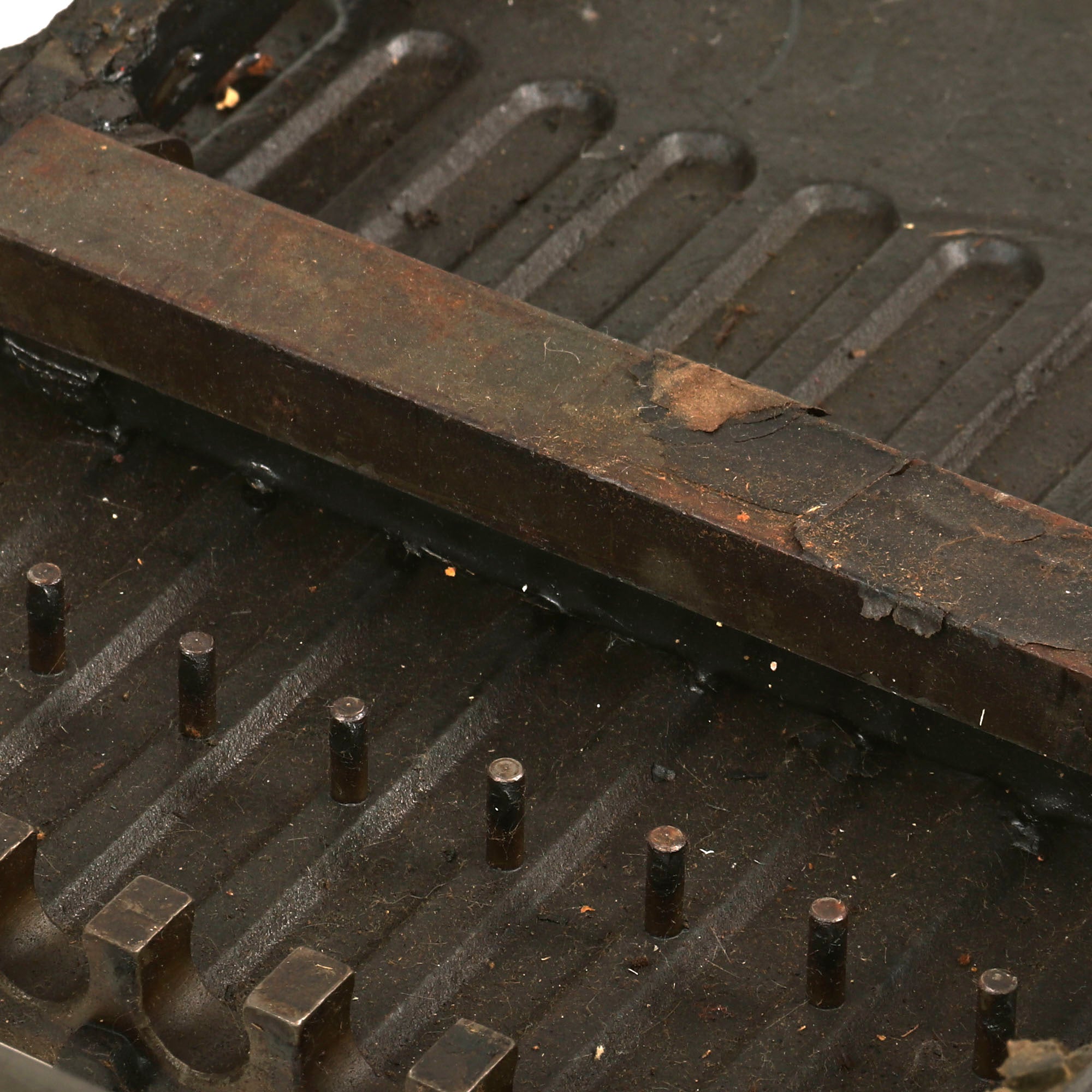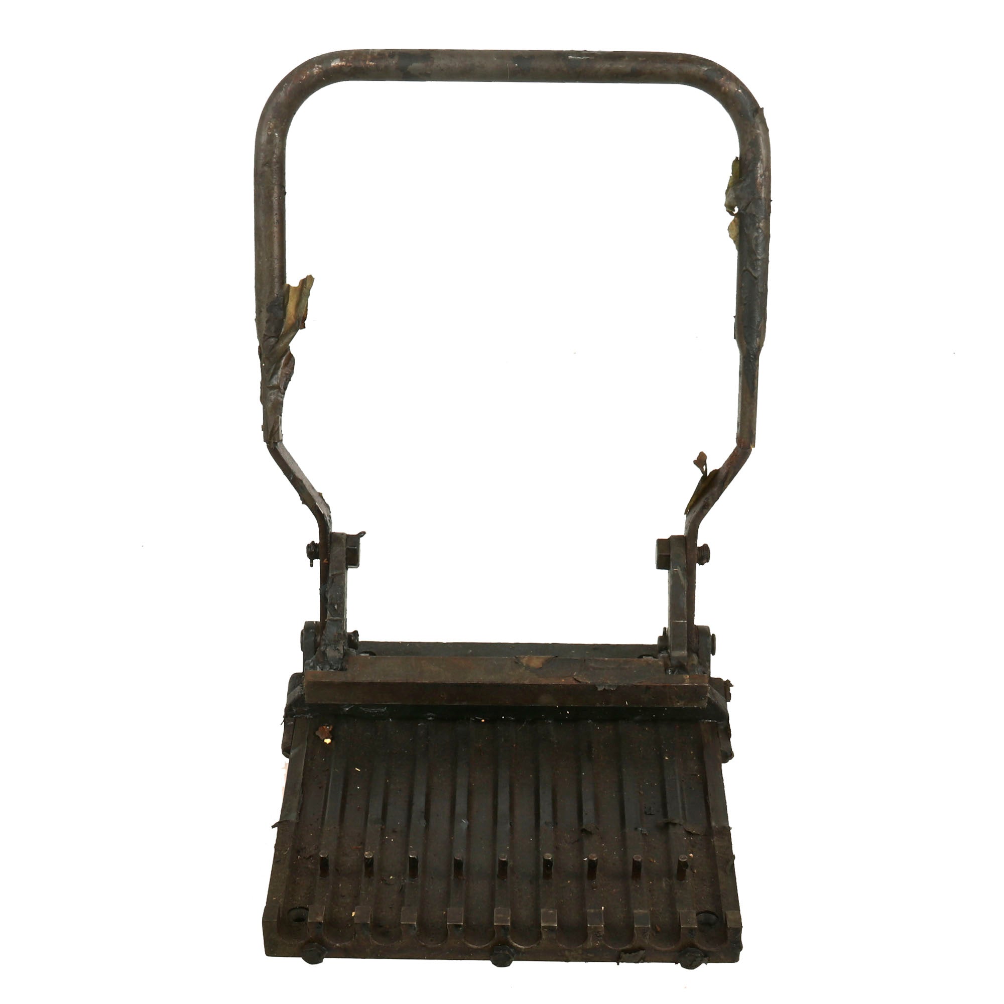 The belt loader is marked D7107072 on the top. On the bottom, it is marked 1900 CORP. 4. The base measures 11" x 10”, with the hand crank extending roughly 15” upward when stationary. Will likely still function as originally intended. The handle locks in the downward position for easy transport, and it also has holes in the base plate for attaching to a table (screws not included). A very scarce piece of equipment ready for further research and display.