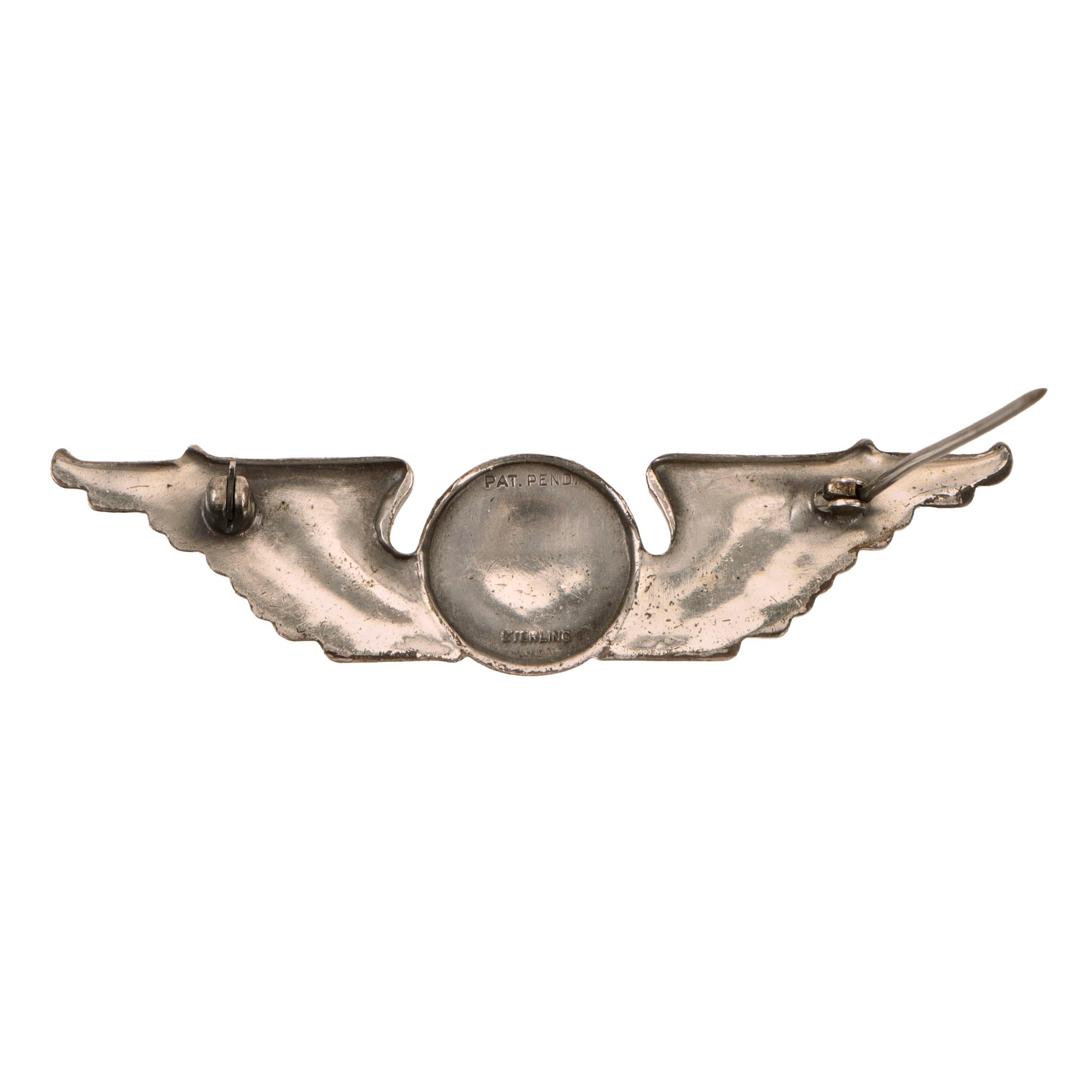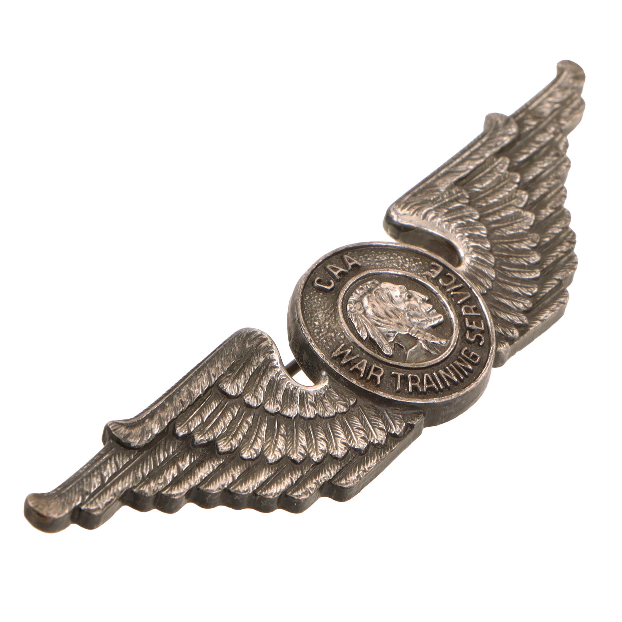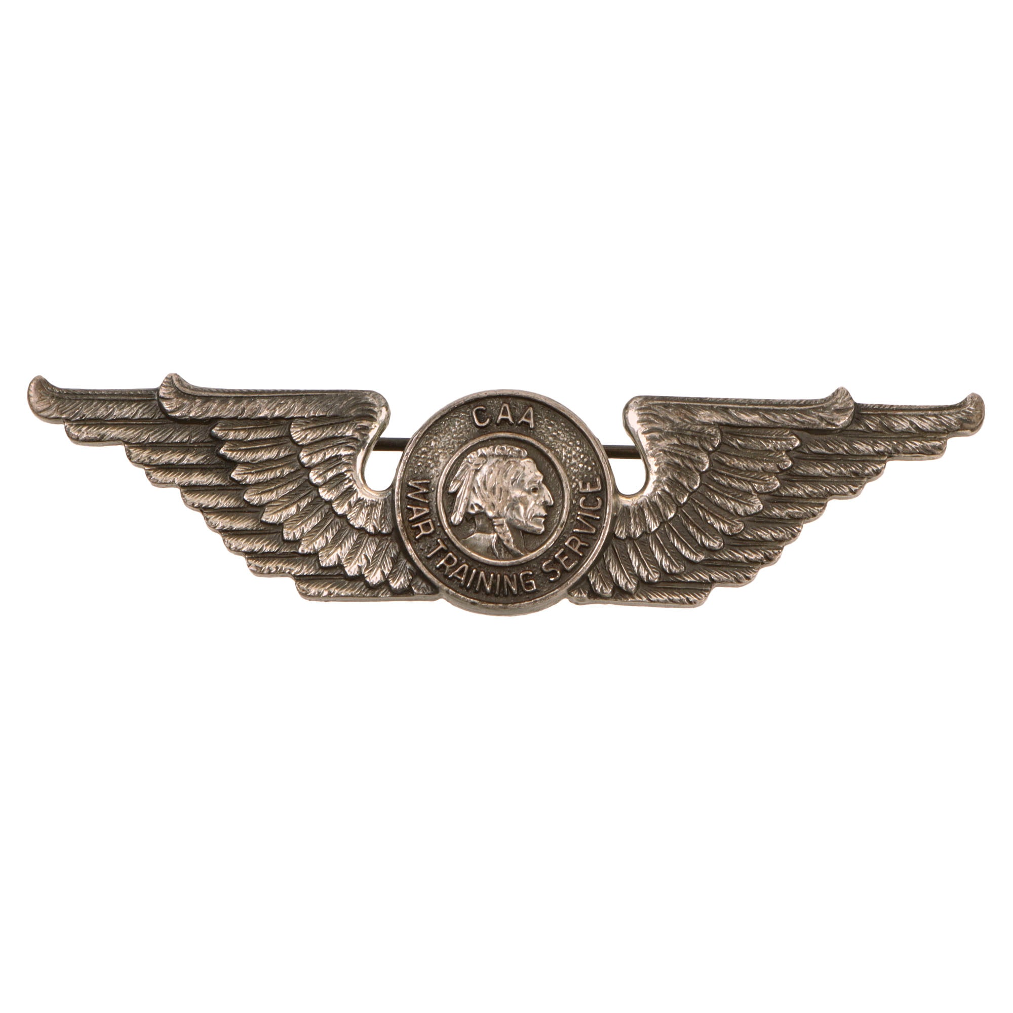 This is a great set of Sterling Pilot’s wings for an instructor in the War Training Service, a civilian pilot training program set forth by the Civil Aviation Authority. The wings depict the Indian Head from the popular Buffalo nickel within a circle reading CAA / WAR TRAINING SERVICE.