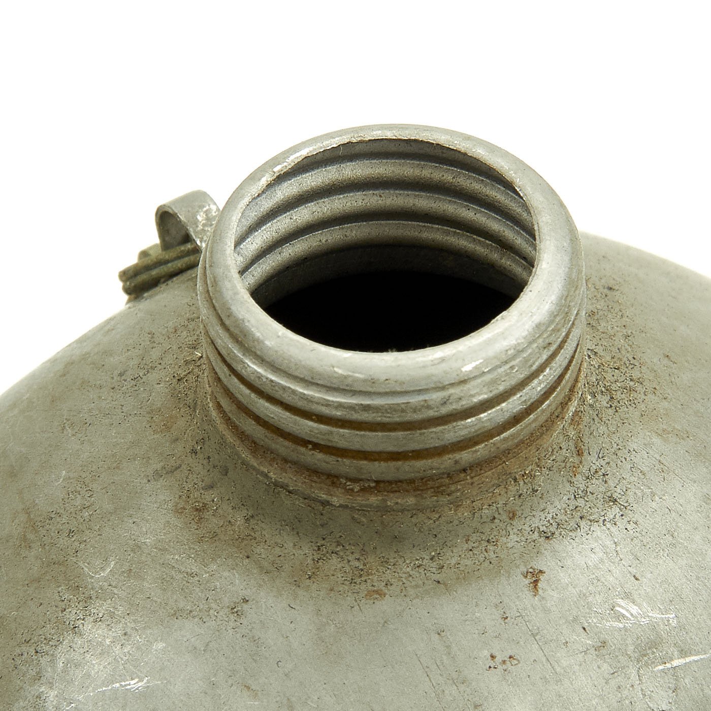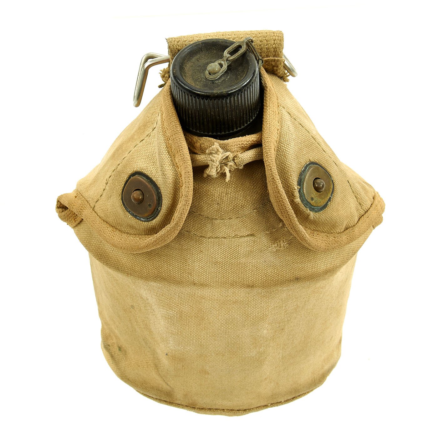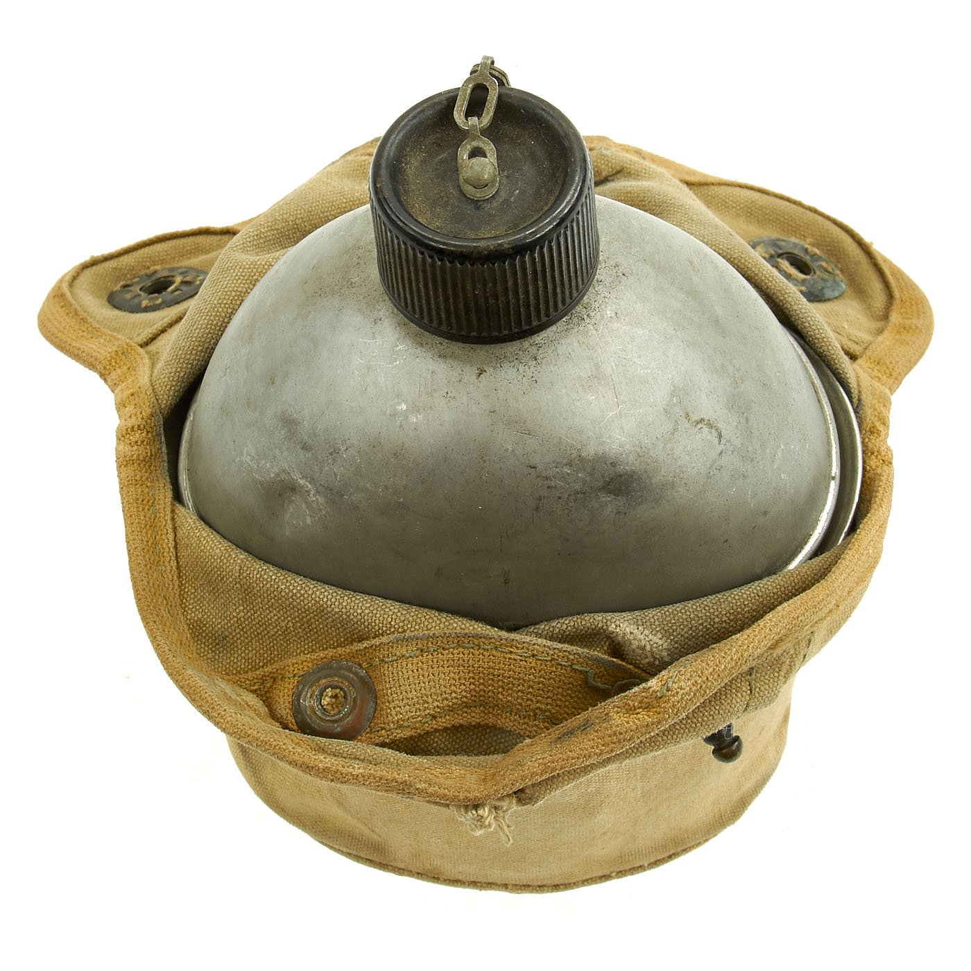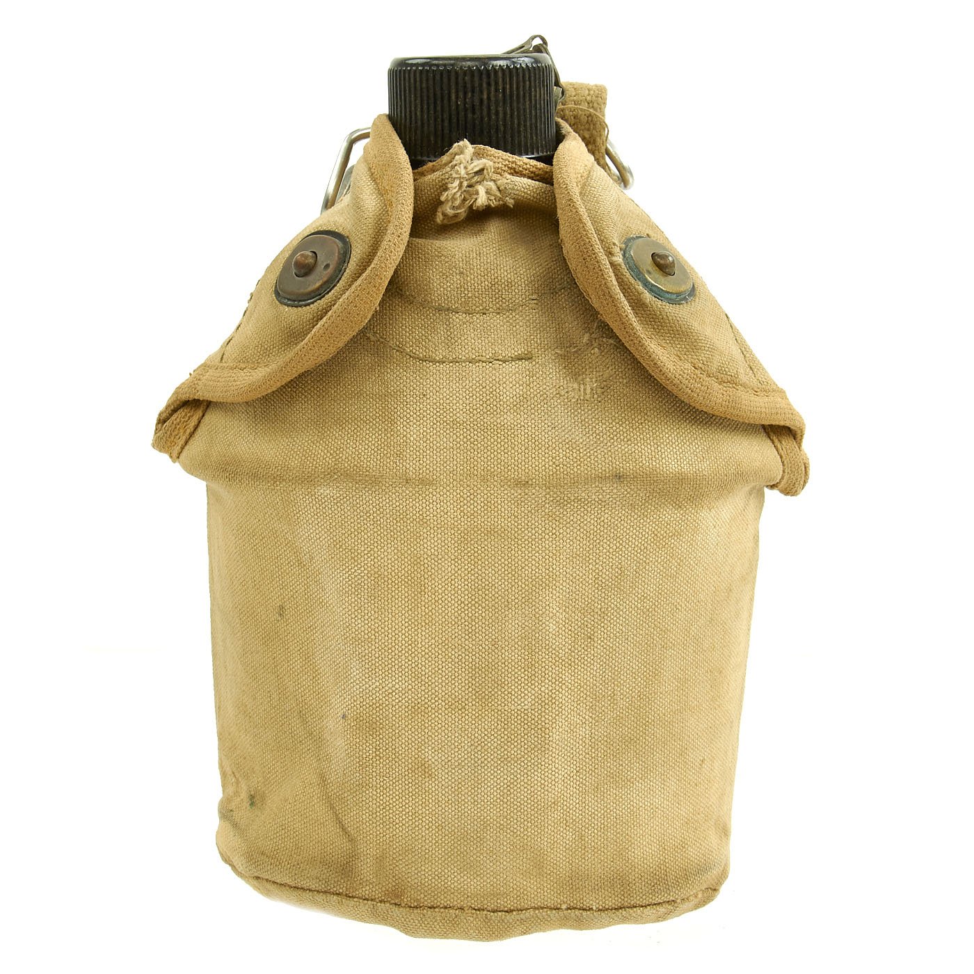 Original Item: Only One Available. This is a very nice U.S. WWII Canteen and Cup set, complete with an early war issue U.S. Marine Corps 2nd Pattern Canvas Carrier. This carrier was essentially the same as the 1st Pattern, except the regular press snaps were replaced by Lift-the-Dot fasteners. This change was made shortly before the introduction of the 3rd pattern cover with the "dog eared" flaps. These covers were unique to the Marines and lacked markings and felt lining of the Army type.