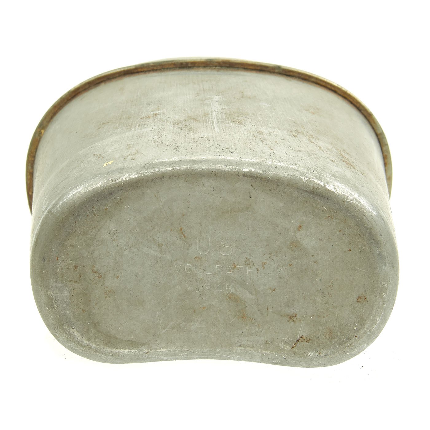 The included canteen is a 1945 dated seamed Stainless Steel example by VOLLRATH, and the aluminum canteen cup is also dated 1945 on the galvanized steel handle, with a K.M. CO. maker mark. Both are in very good condition, and the canteen has the correct black plastic cap with an intact cork washer and chain.