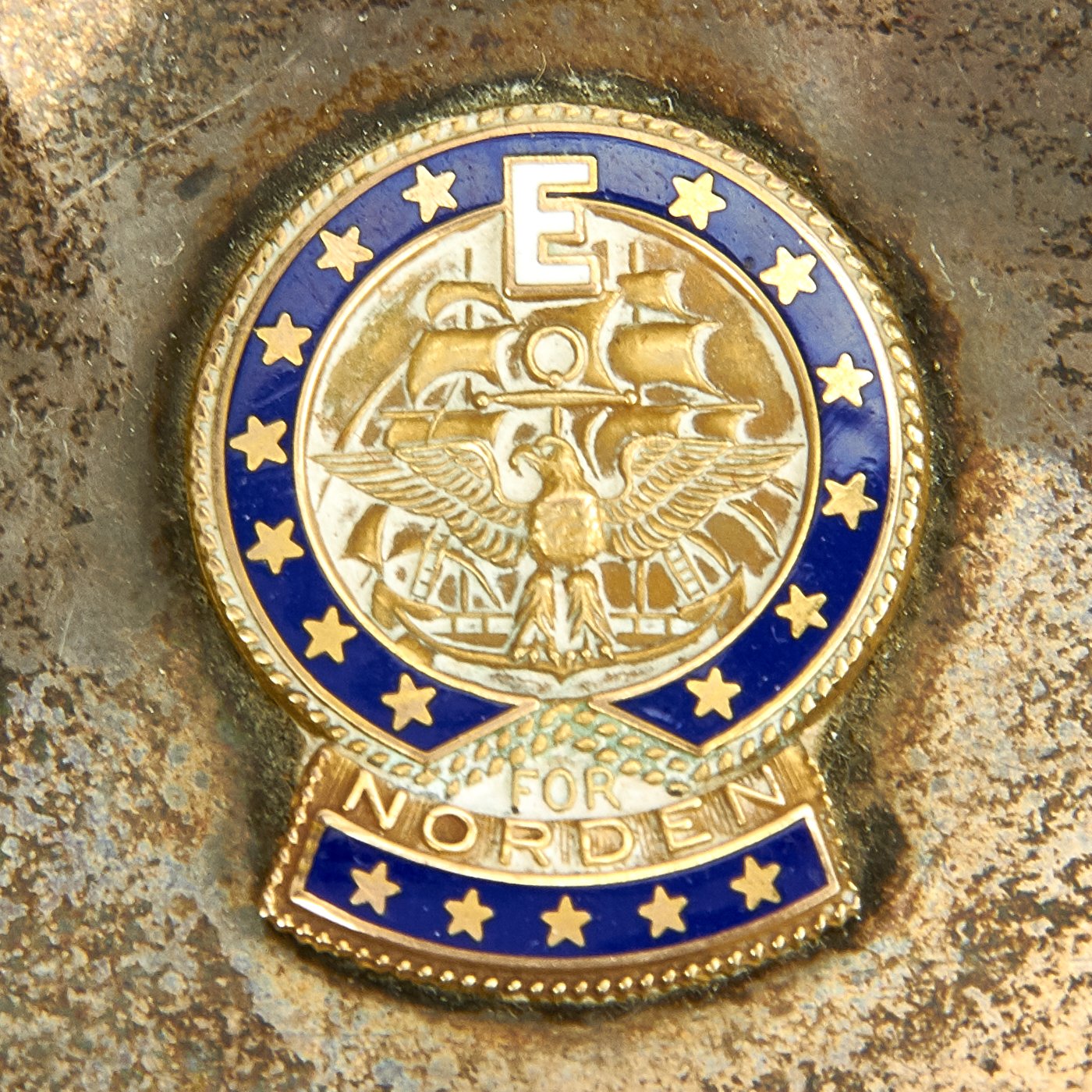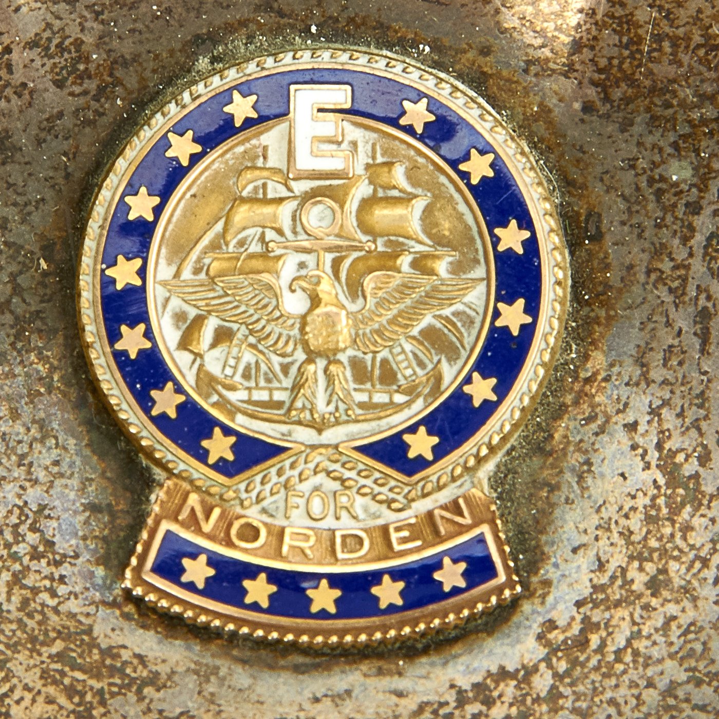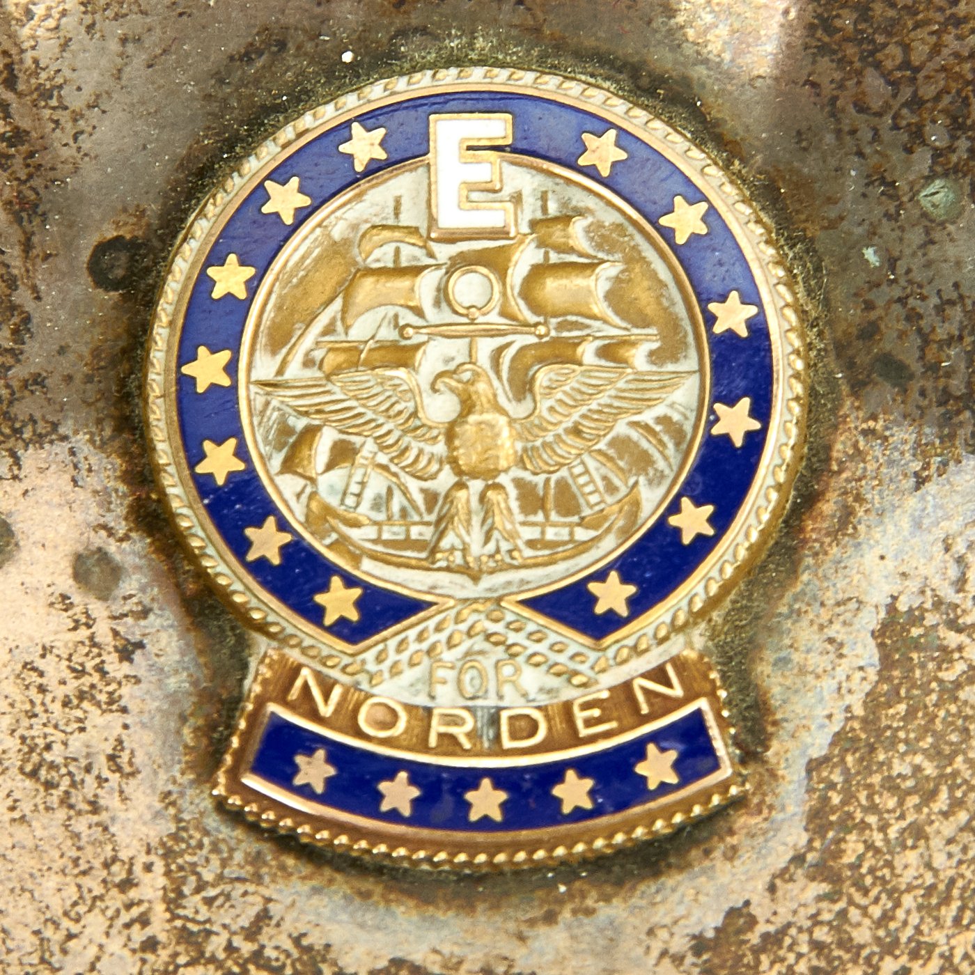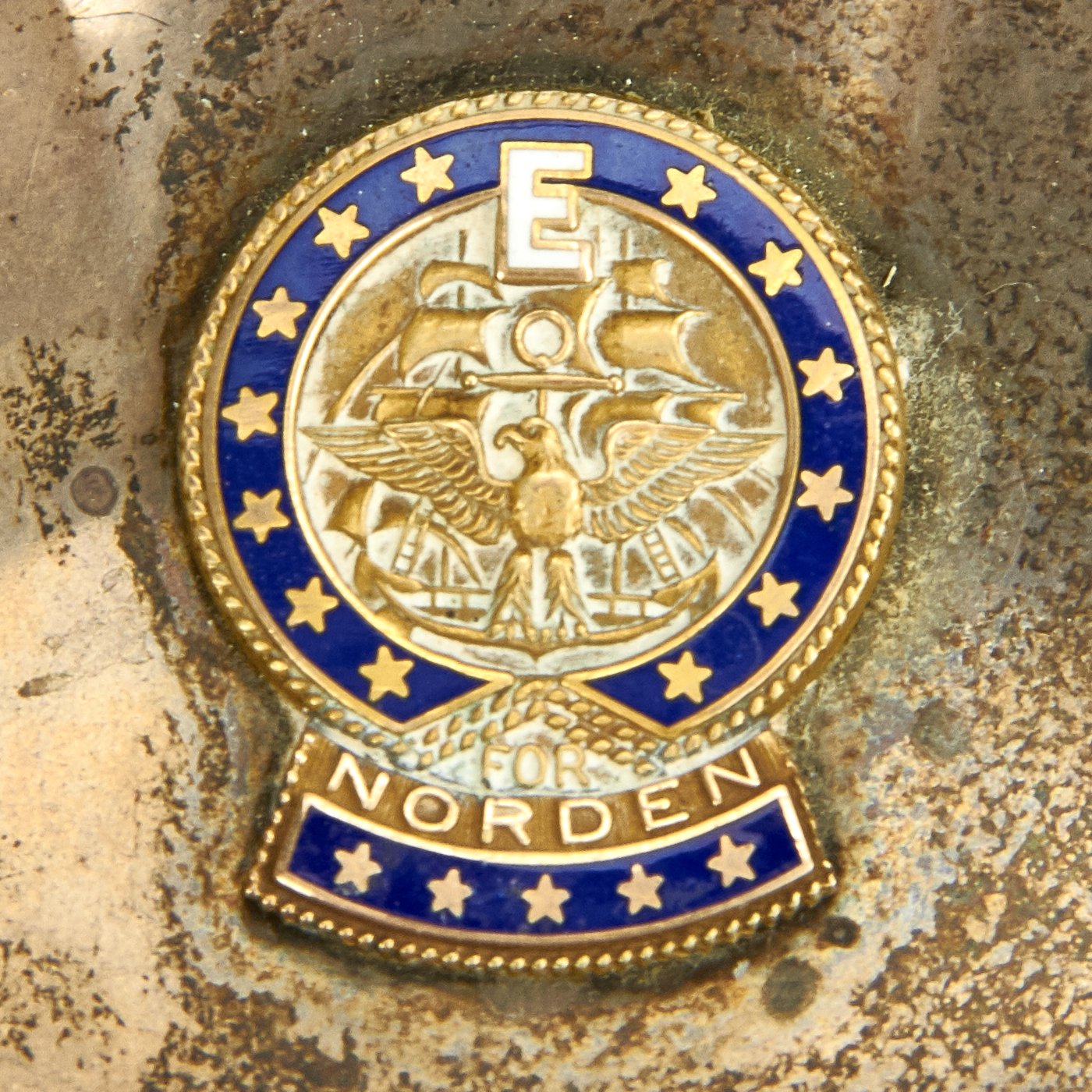 Original Item: Only One Available. Rare sterling silver ash tray that measures 1 1/4" x 5 1/4", with a scalloped edge, marked on the base as being manufactured by jewelers Tiffany and Company. Applied within the bowl are four enameled brass pins, each depicting an eagle and anchor over a sailing ship surrounded by fourteen stars, bearing the legend "E (Excellence) FOR NORDEN. This celebrates the receipt of the Army-Navy "E" Award for excellence in war production by Carl L. Norden, Inc. manufacturer of the famous Norden bomb sight. Less than 5% of companies engaged in the war effort would receive this honor by war's end. These pins were distributed to employees of the company, although most commonly found examples read "'E" and "Production"; the specialized version with NORDEN seen here were custom made by Tiffany. Ashtray shows some tarnish overall, but can be cleaned and polished if desired. A fantastic WWII award for a significant civilian contractor to the war effort.