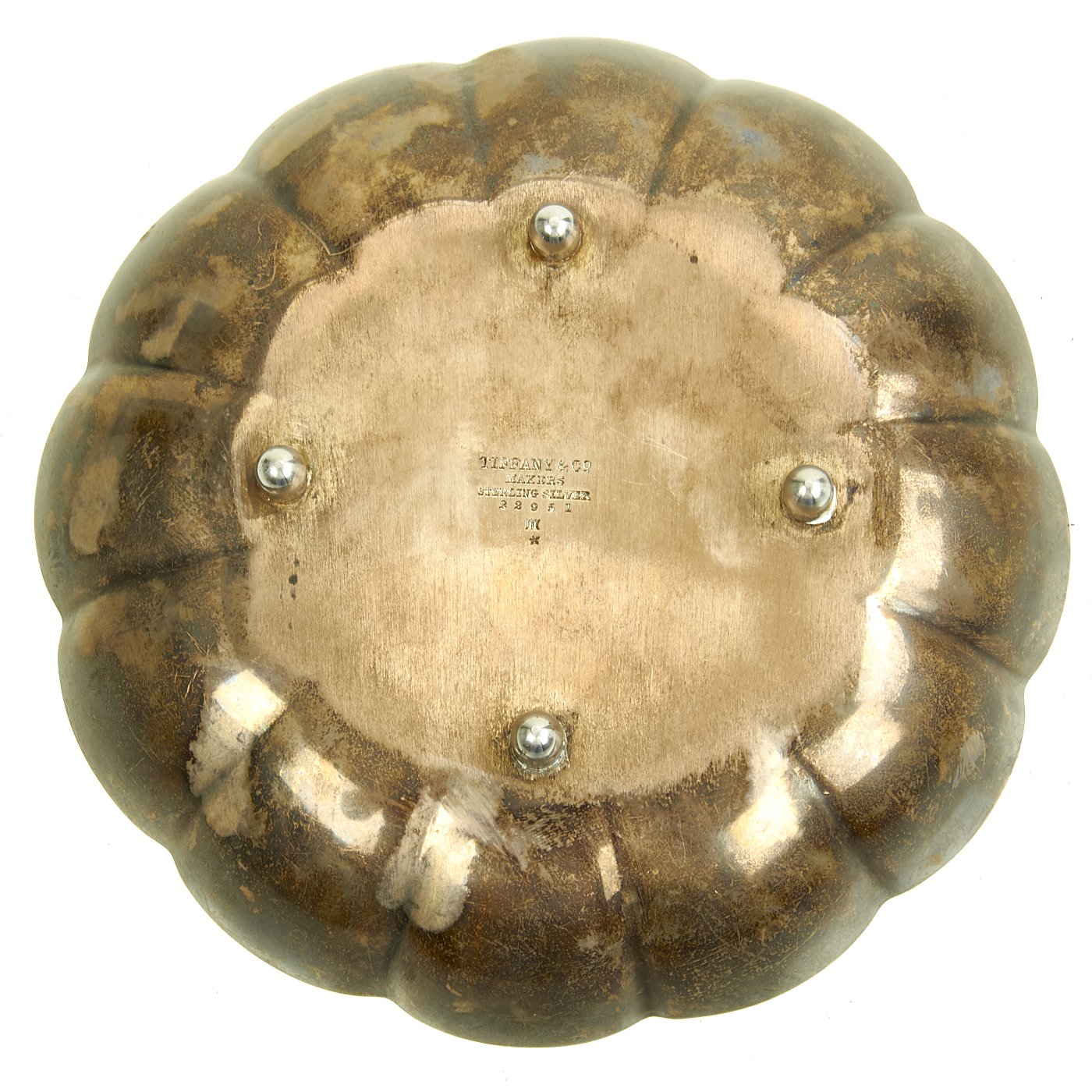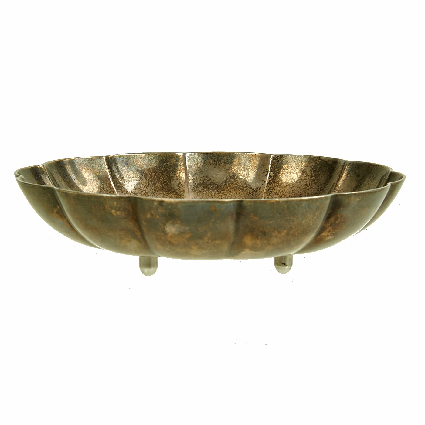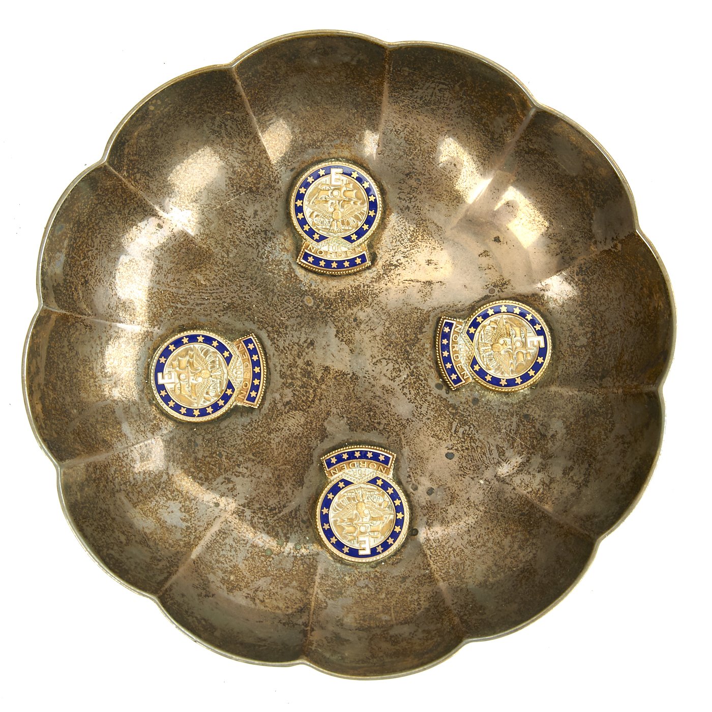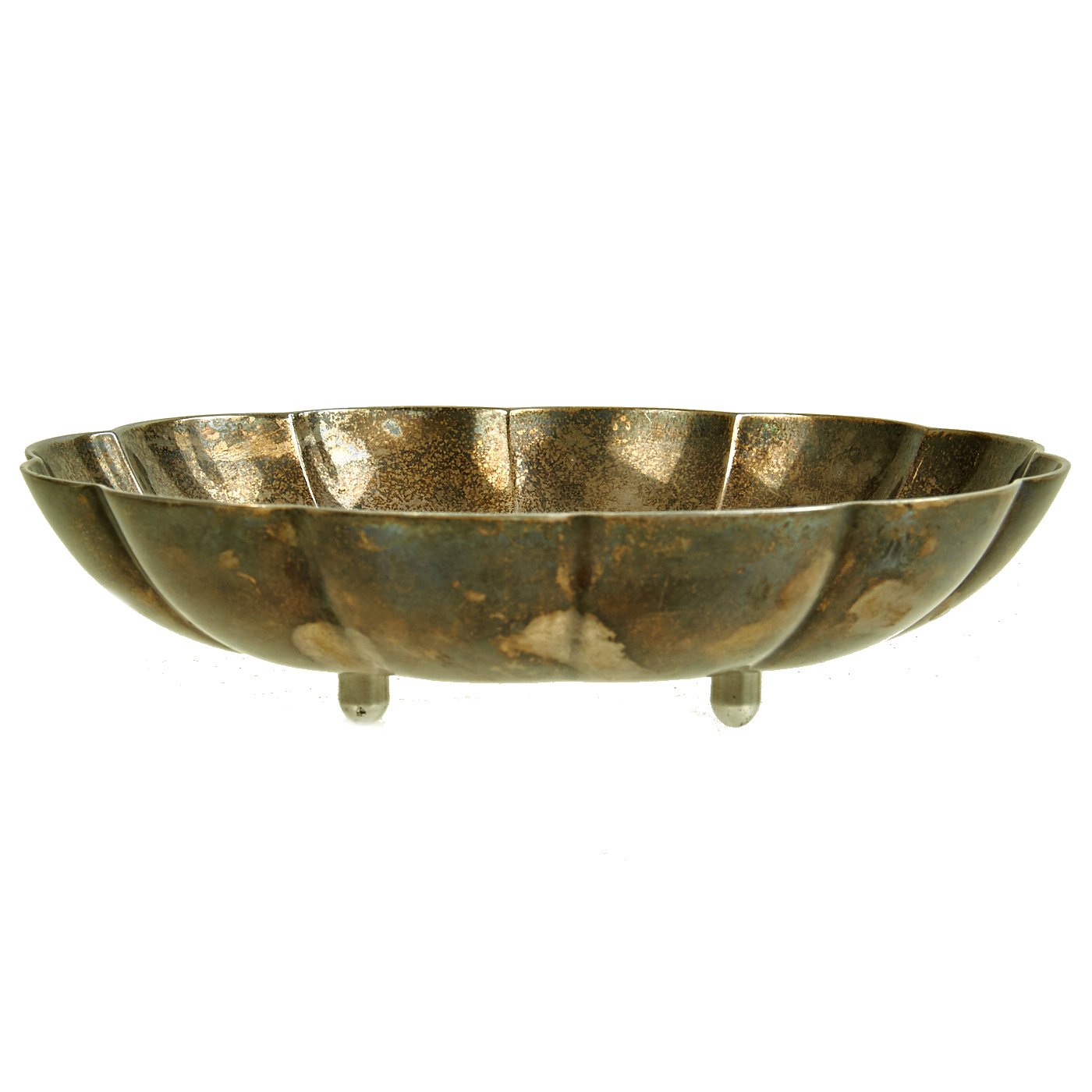 Original Item: Only One Available. Rare sterling silver ash tray that measures 1 1/4" x 5 1/4", with a scalloped edge, marked on the base as being manufactured by jewelers Tiffany and Company. Applied within the bowl are four enameled brass pins, each depicting an eagle and anchor over a sailing ship surrounded by fourteen stars, bearing the legend "E (Excellence) FOR NORDEN. This celebrates the receipt of the Army-Navy "E" Award for excellence in war production by Carl L. Norden, Inc. manufacturer of the famous Norden bomb sight. Less than 5% of companies engaged in the war effort would receive this honor by war's end. These pins were distributed to employees of the company, although most commonly found examples read "'E" and "Production"; the specialized version with NORDEN seen here were custom made by Tiffany. Ashtray shows some tarnish overall, but can be cleaned and polished if desired. A fantastic WWII award for a significant civilian contractor to the war effort.