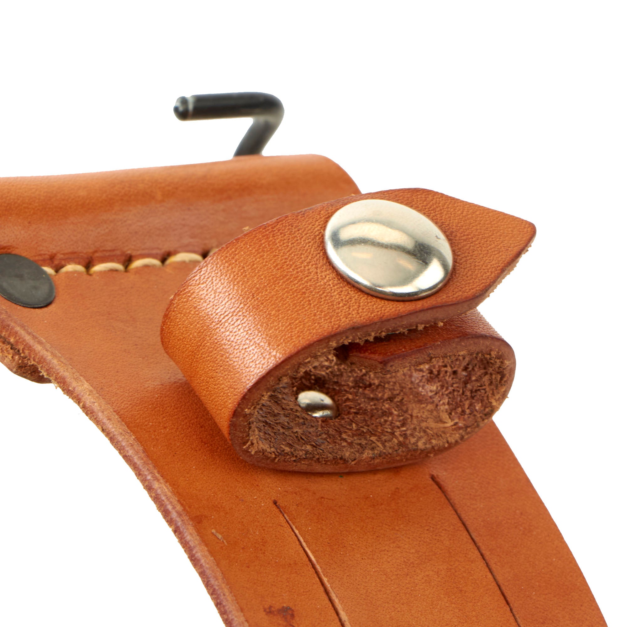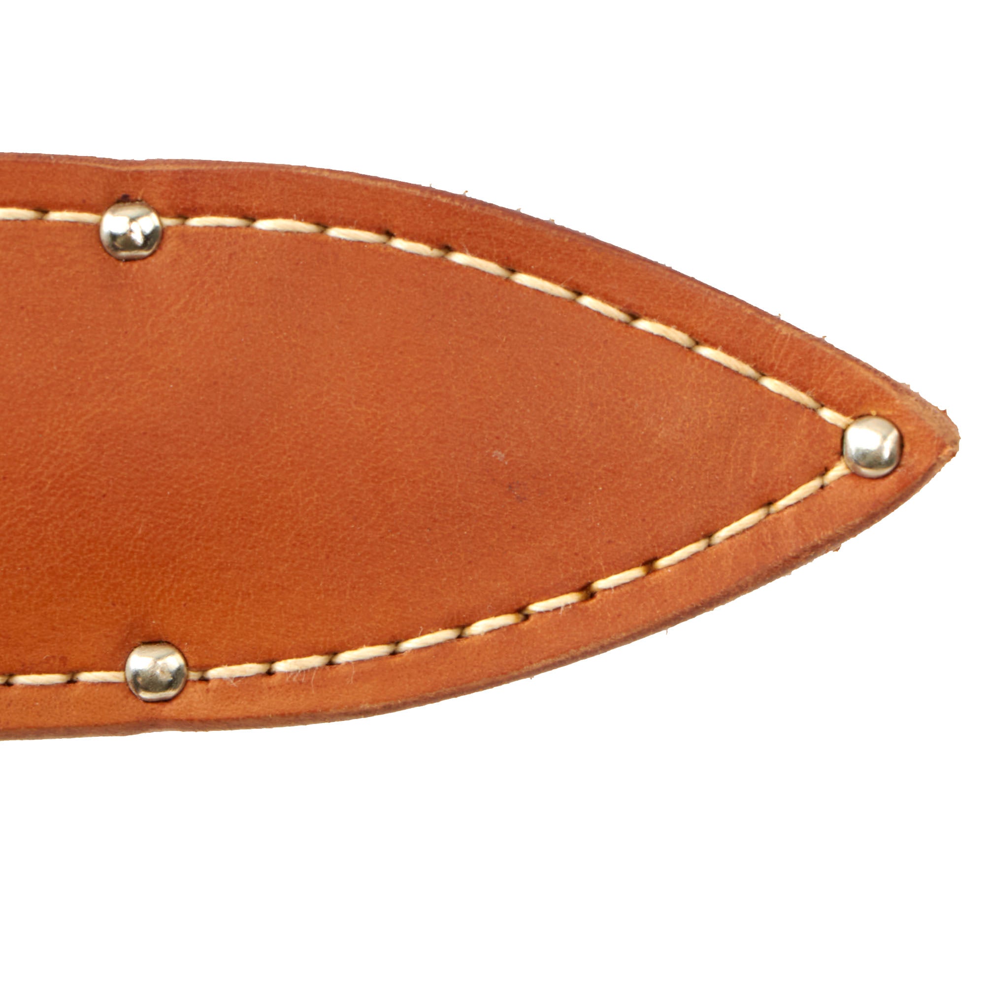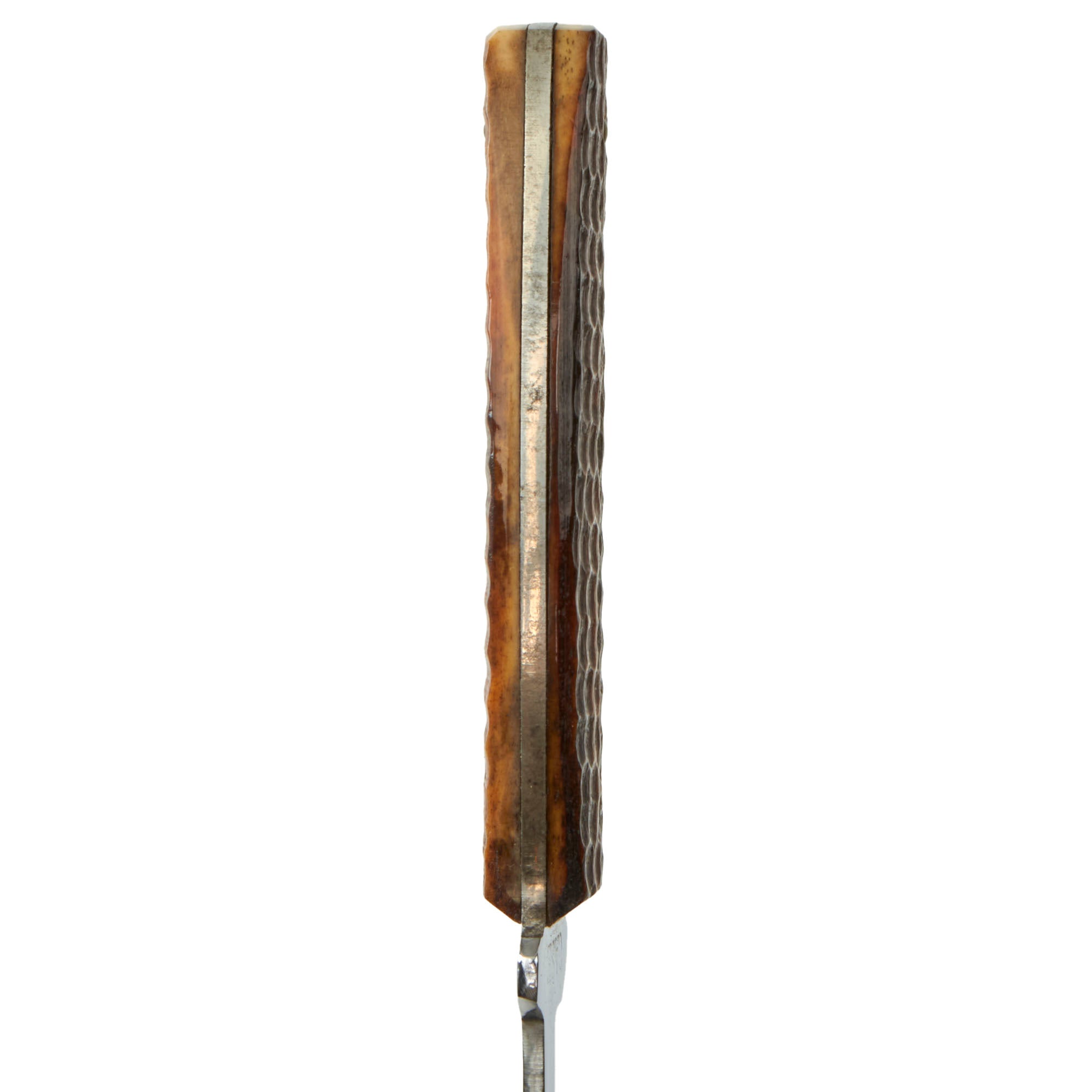 This example is however a bit different than most we have seen from Case, as it features a chrome plated single edged "Clip Point" Bowie style blade, whereas most of these that we see had double edged spear point blades. Most also had wooden handles, while this has a lovely "jigged bone" handle. We have seen some examples with single edged spear point blades, as well as some with jibbed bone handles, but only one with the bowie blade, which was not chrome plated. There look to have been several "unknown" patterns of these knives, and like this one, they were only marked CASE on the blade ricasso, which is widened to also be the crossguard. Condition is really great, with little to no signs of use, and the belt scabbard is also in great shape, and even has military style clips on the top for attachment to a pistol belt.