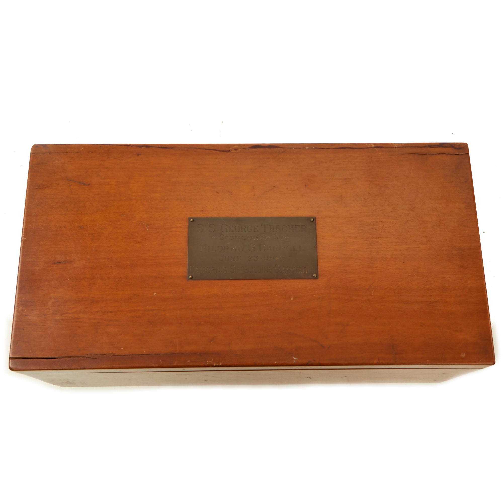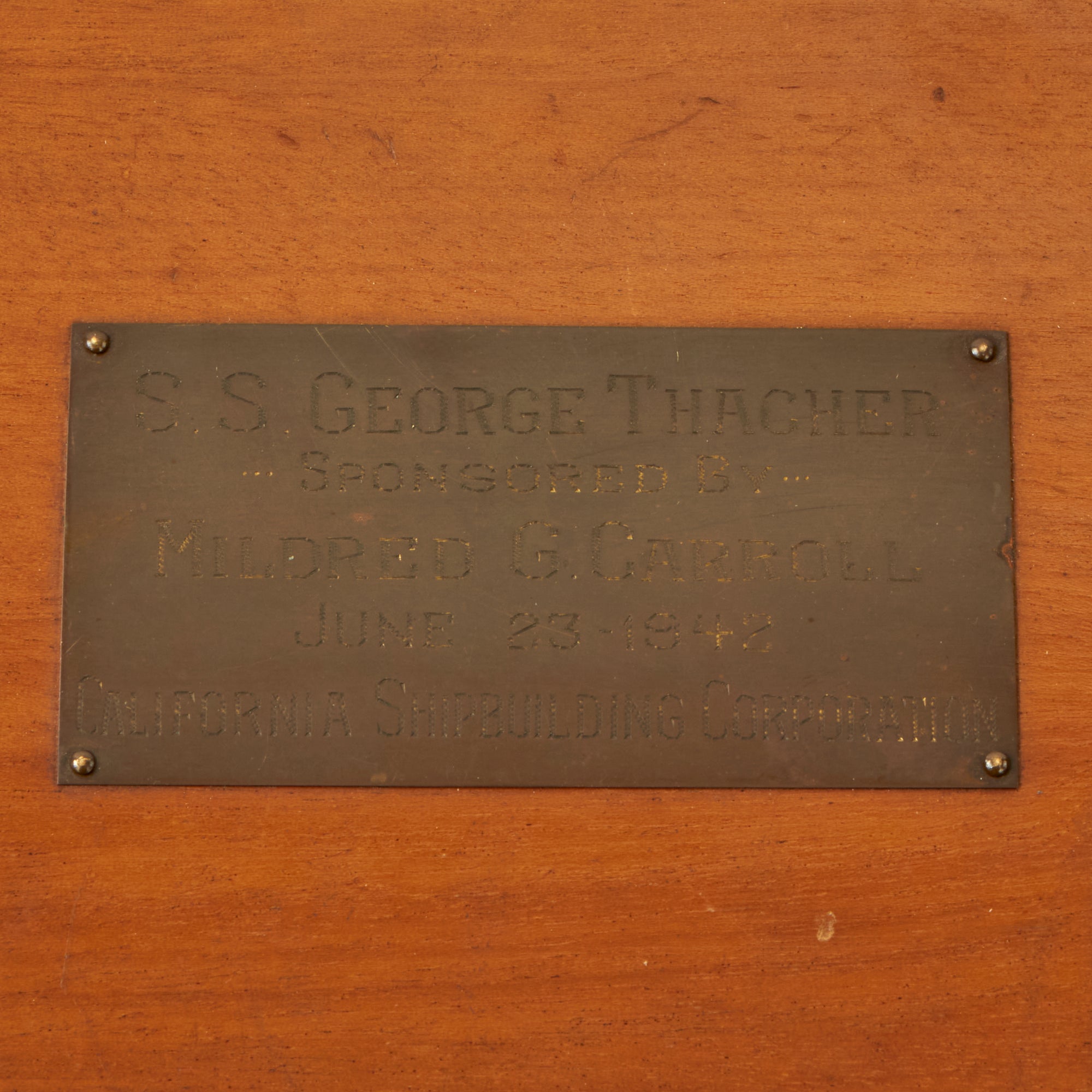 Original Item. One-of-a-Kind. At 20.04 hours on 1 Nov 1942 the George Thatcher (Master Henry Olin Billings) on her maiden voyage was torpedoed by Uboat U-126 about 100 miles off the west coast of Africa, while proceeding under escort by two Free French corvettes at 8.2 knots. Already on 29 October, U-126 had attacked the small convoy and several torpedo tracks were seen by the escorts, but no action was taken by them. The torpedo struck on the starboard side between #2 and #3 hatches. One minute later, a second torpedo hit at the #4 hatch, setting fire to the cargo of gasoline, destroying one lifeboat and blowing the rafts overboard. The freighter, still under way, took a sharp list to starboard and began to settle by the head as she traveled in circles. She later righted herself, facilitating the launching of the remaining three lifeboats by the eight officers, 31 crewmen, 15 armed guards (the ship was armed with one 4in, one 3in and and four 20mm guns) and 12 US Army passengers on board about 30 minutes after the attack. The master, the chief mate, three crewmen, five armed guards (including the officer) and eight passengers were lost. The survivors were picked up by the corvettes and landed in Point Noire on 3 November. The Liberty ship continued burning but did not sink until 3 November at 09.00 hours.