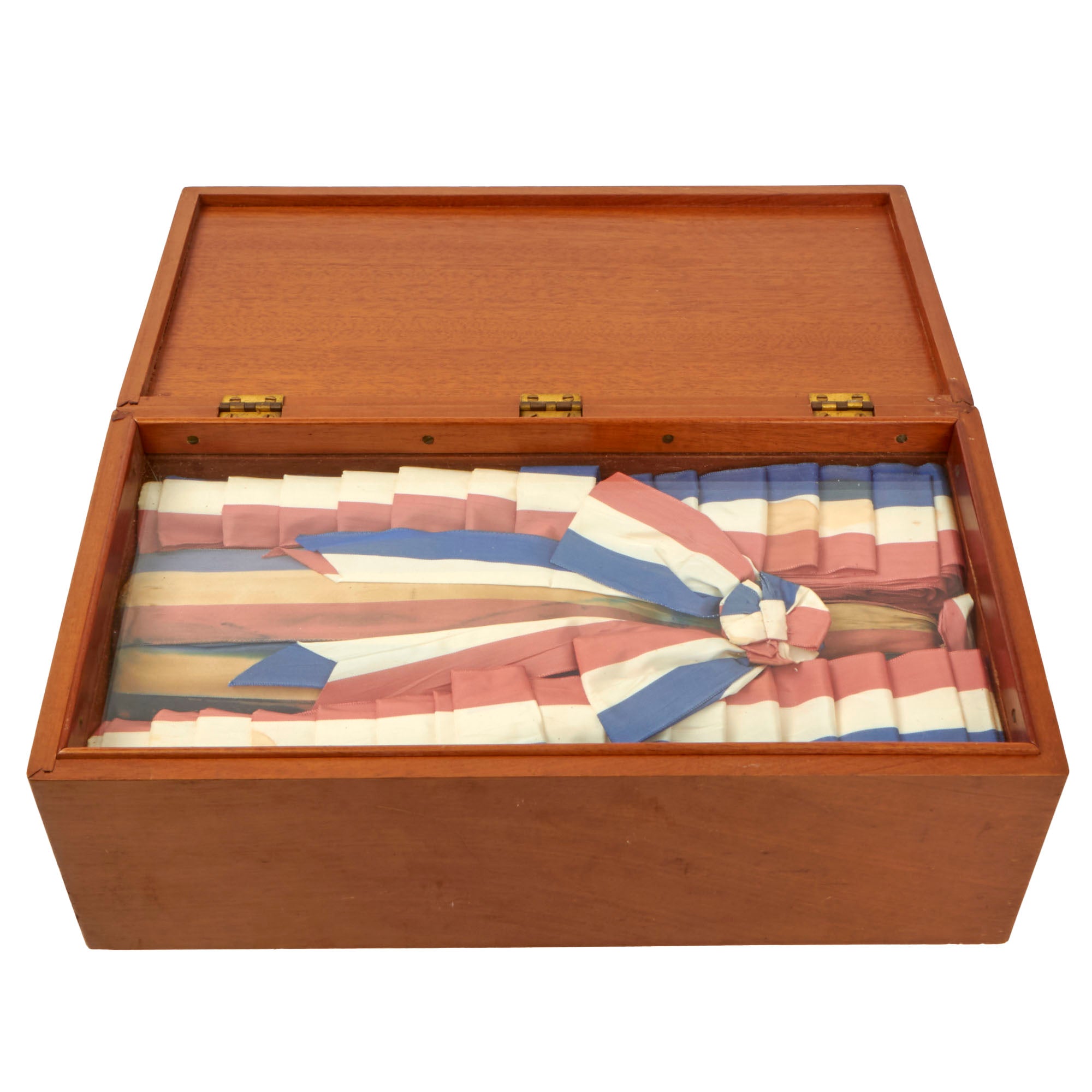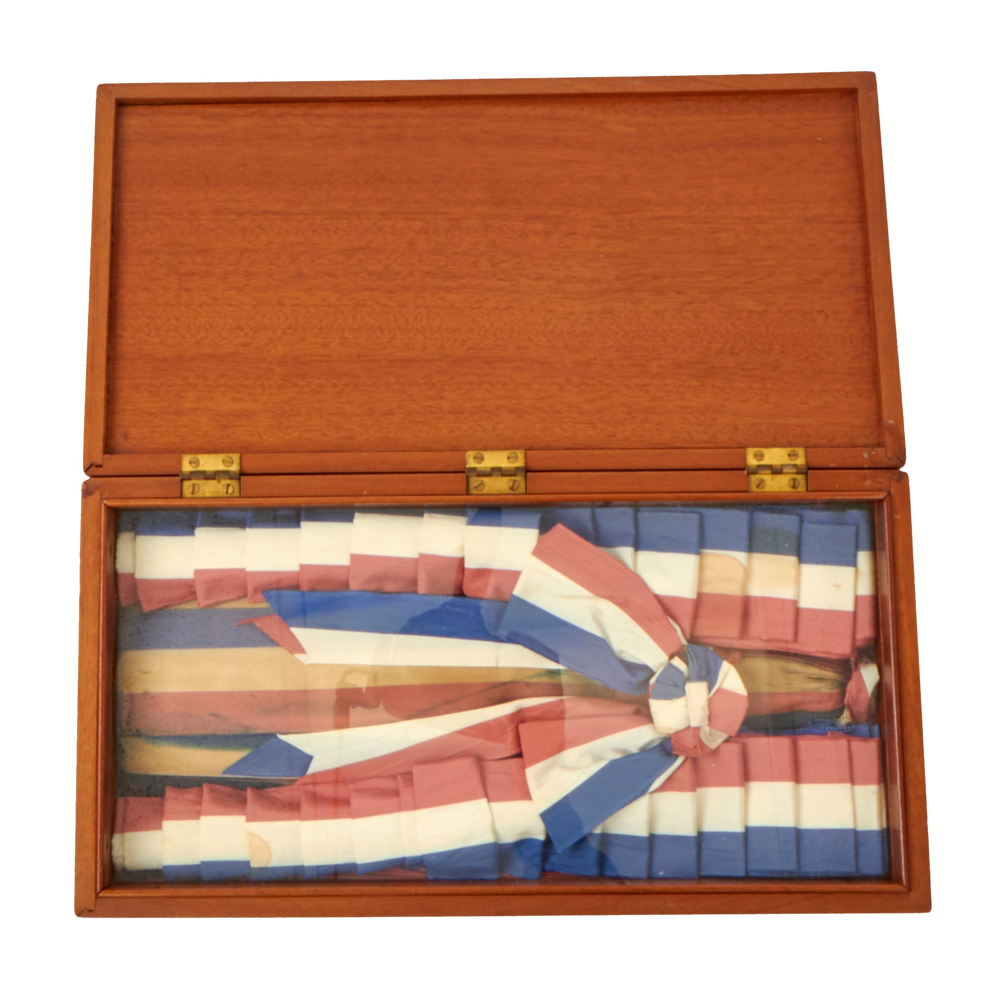 The bottle is still wrapped in its ceremonial ribbons, and is protected by an acrylic window. We do not know if the bottle still contains liquid, but from what we can see, it appears unbroken. This is an extremely scarce bit of WWII Naval militaria, the first christening bottle we have offered with such a macabre backstory. The bottle comes with some printed research. This is sure to become the centerpiece of any WWII Navy collection. Comes ready for further research and display.