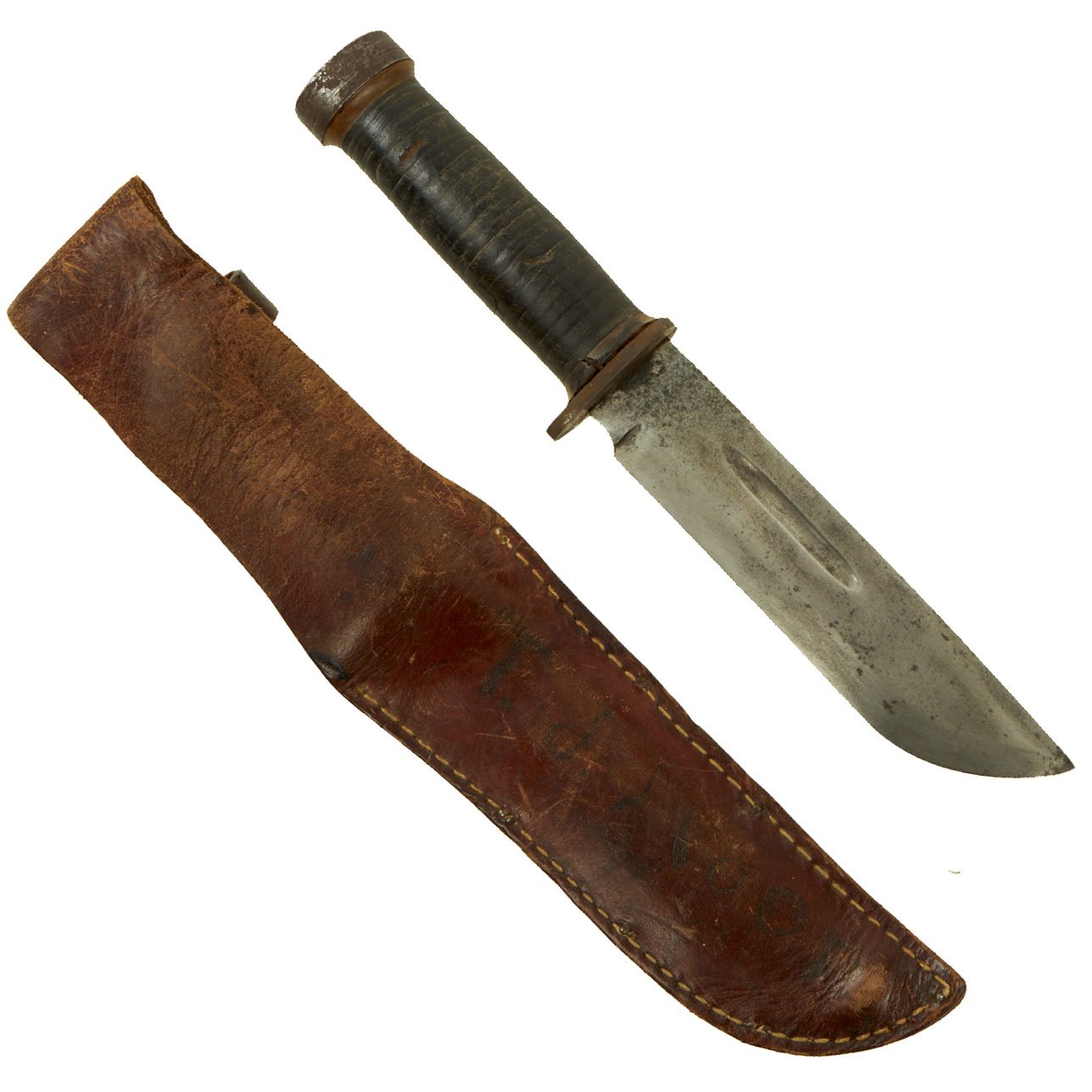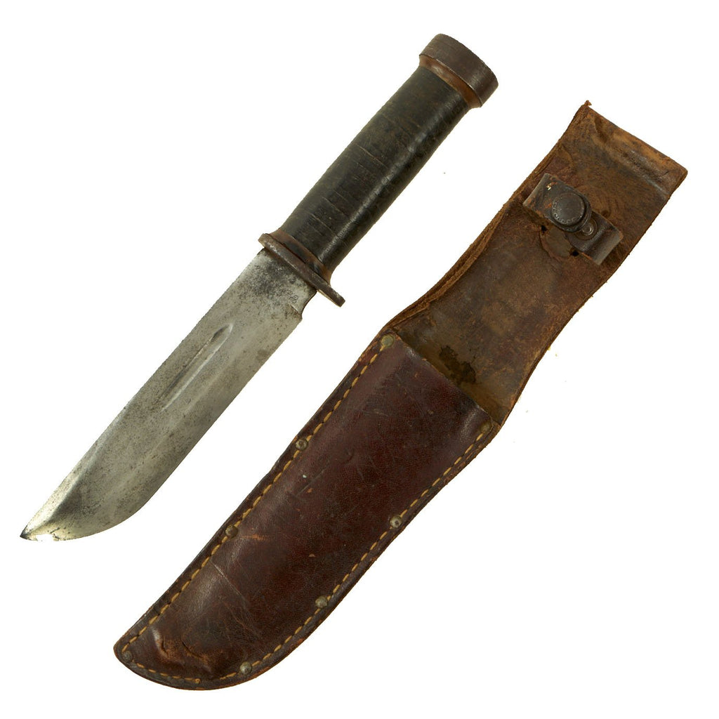 At the start of World War Two, it is a known fact that the U.S. forces were woefully under-prepared to wage a war on this large of a scale. In fact, a war this large had never been fought before, or for that fact ever since. Many new ventures would be engaged in to meet the production demands of such a large force. Knives were but one aspect of the new style war to be fought. It became immediately known that the U.S. forces were short of cutlery of all types. To meet this demand, it was decided to use whatever style could be put into immediate production. The early Marine Corps Raider knives were nothing more than Camillus hunting knives quickly popped out and sent to the newly formed group. Along these same lines the portion of the military tasked with purchasing all types of supplies was the Quartermaster Corps. The Army had their own Quartermaster Corps, as did the Navy, both of which cooperated, but were usually tasked with much different problems. In this specific task, they were both looking for the same type of vendor to produce an item in great need by all branches of the services. Fast production was needed. So a style of construction was chosen which would lead to little changes needed by the producing factories. This was a simple matter in choosing a stacked leather handle that had been in continuous production since at least the turn of the century. Other then that simple order, any six inch bladed hunting knife would do.