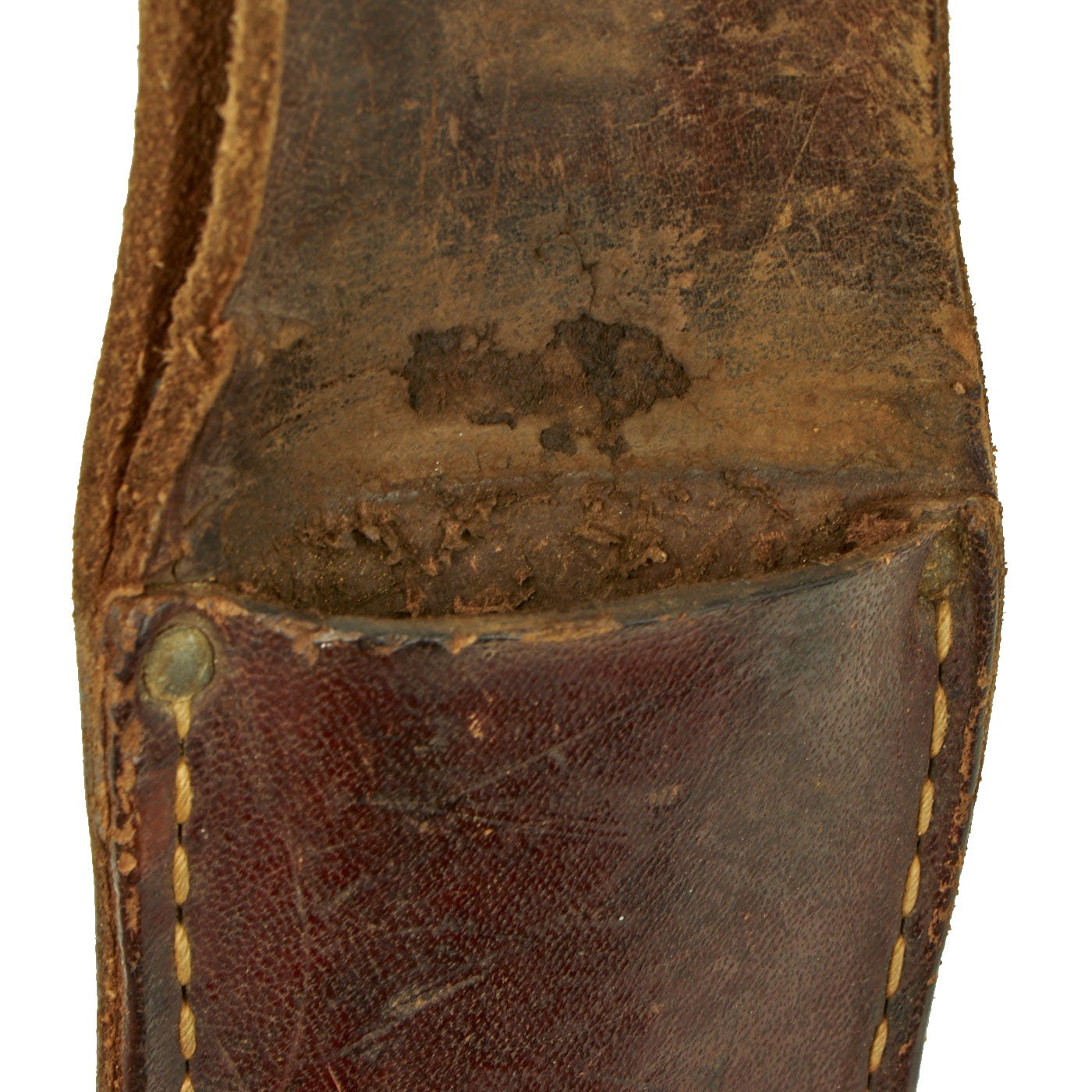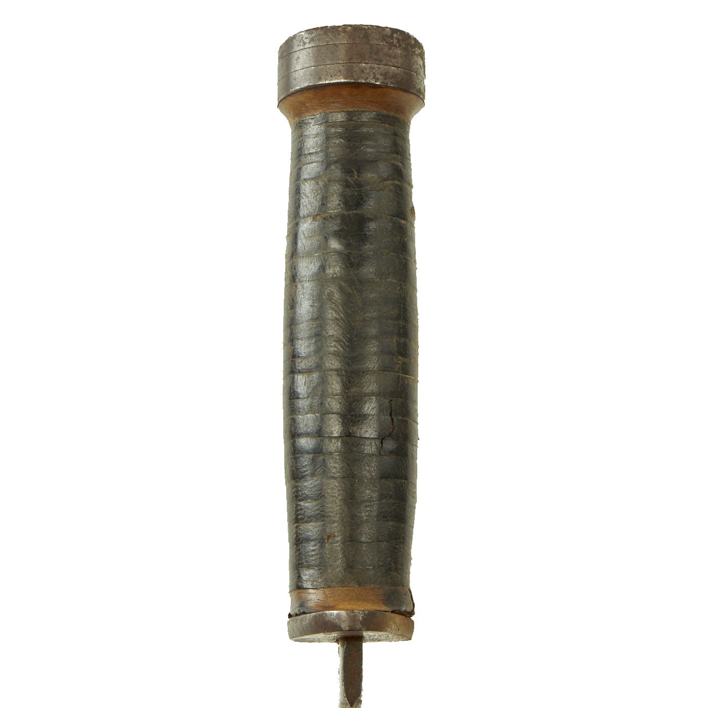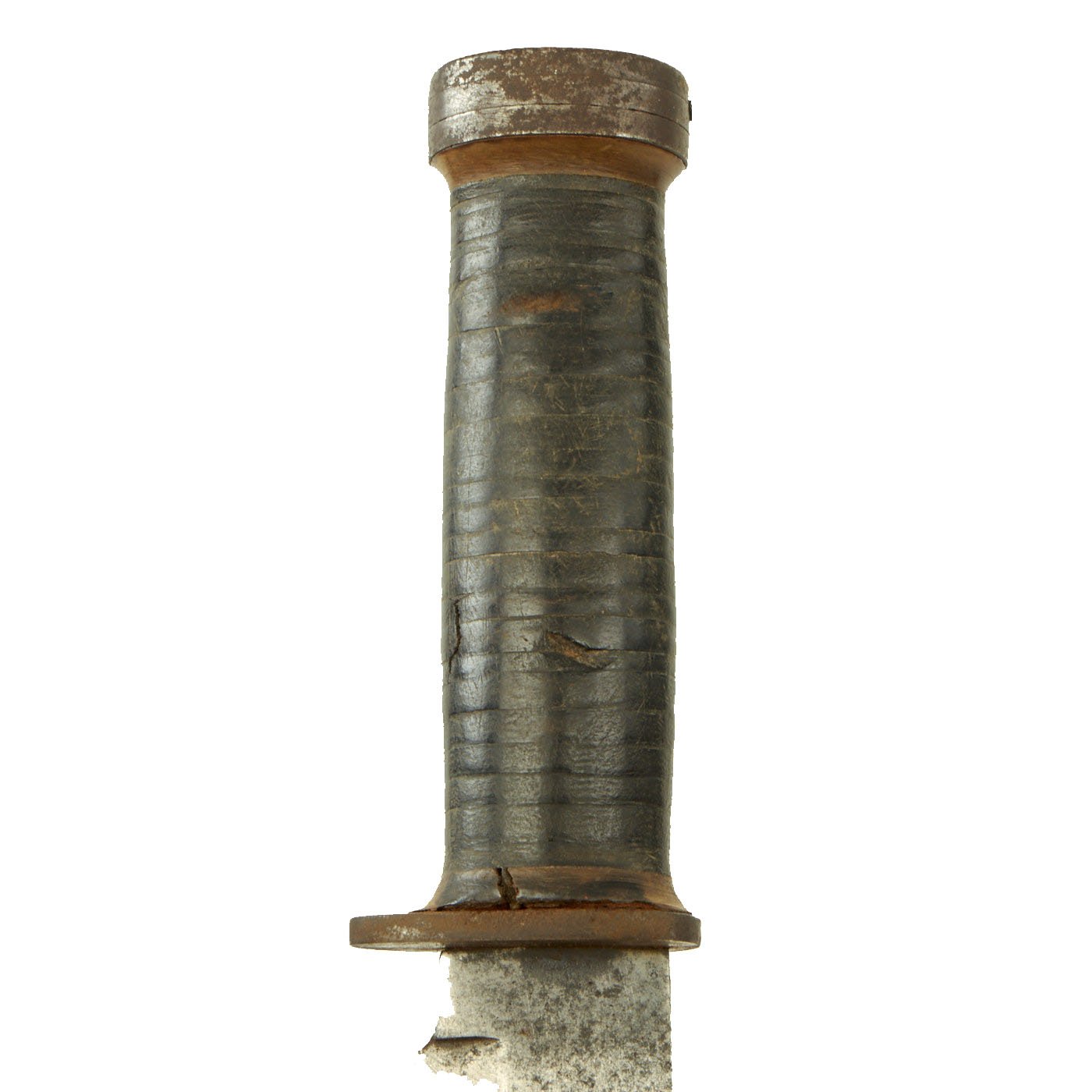 Original Item: Only One Available. This example is offered in good service used condition and comes complete with the original issue leather sheath. The finish on the blade is good, but repeated cleaning has made the original markings on the blade ricasso faint. It is however still quite sharp. The leather grip is now stained dark, but does not have any major damage. The plastic washer closest to the crossguard has cracked, probably from rust on the crossguard. The pommel is now slightly loose.