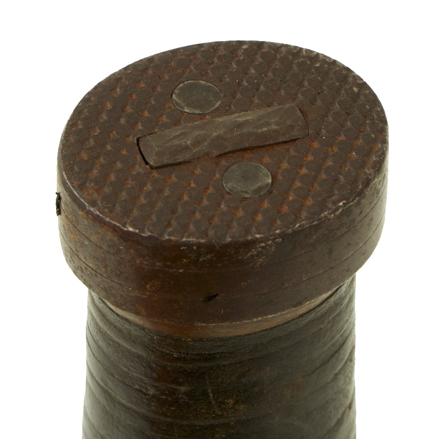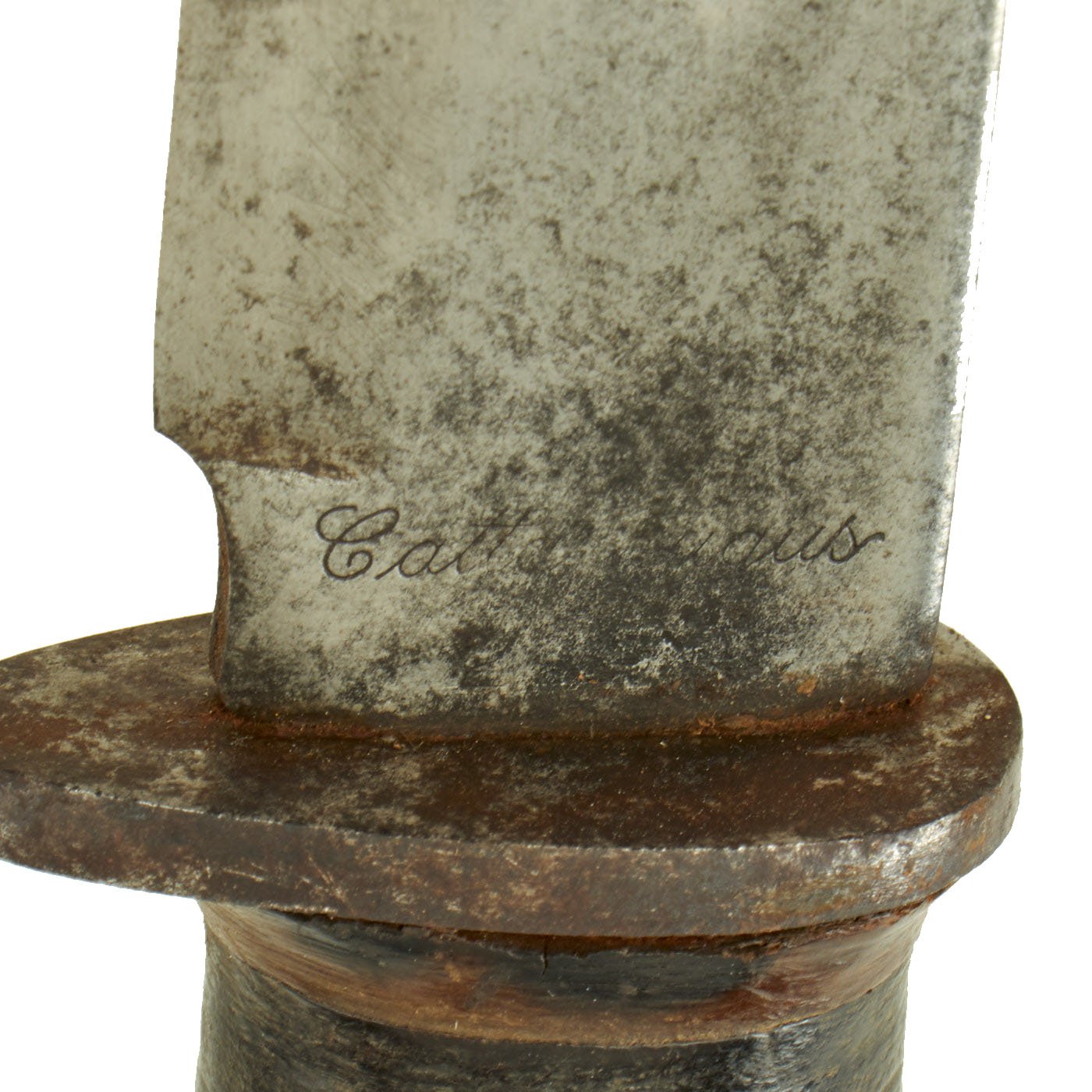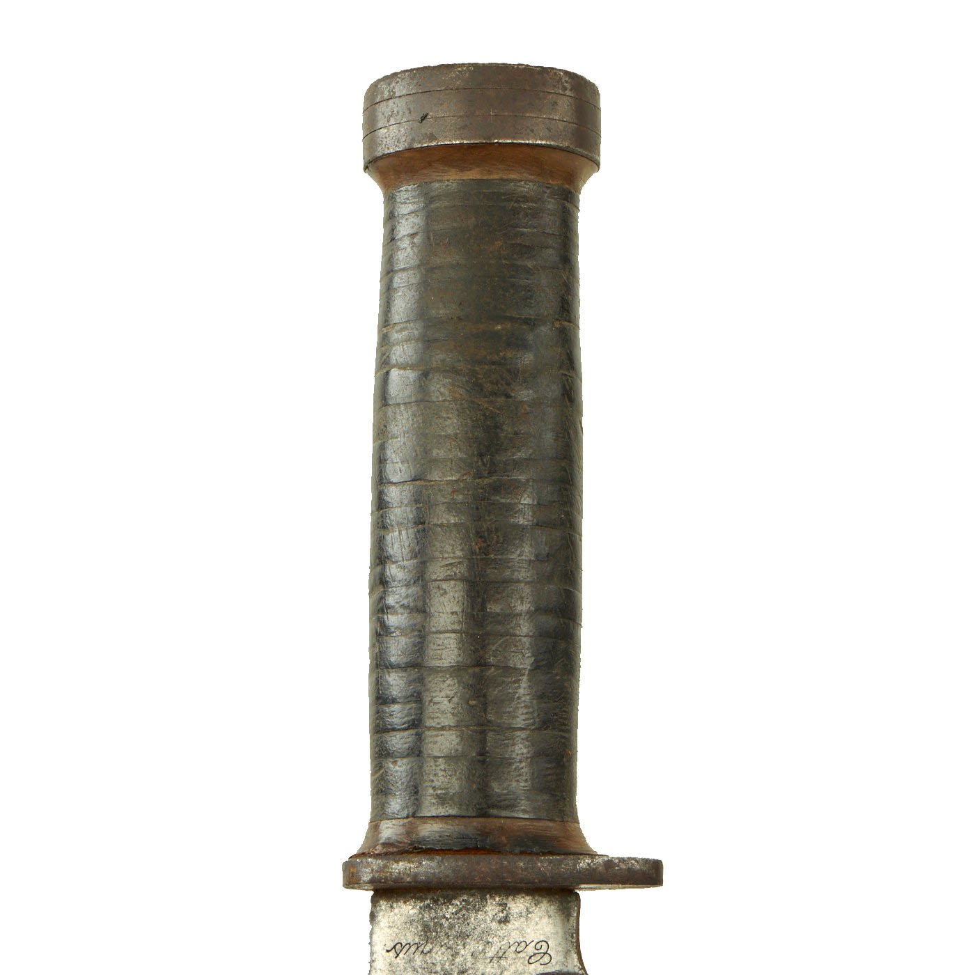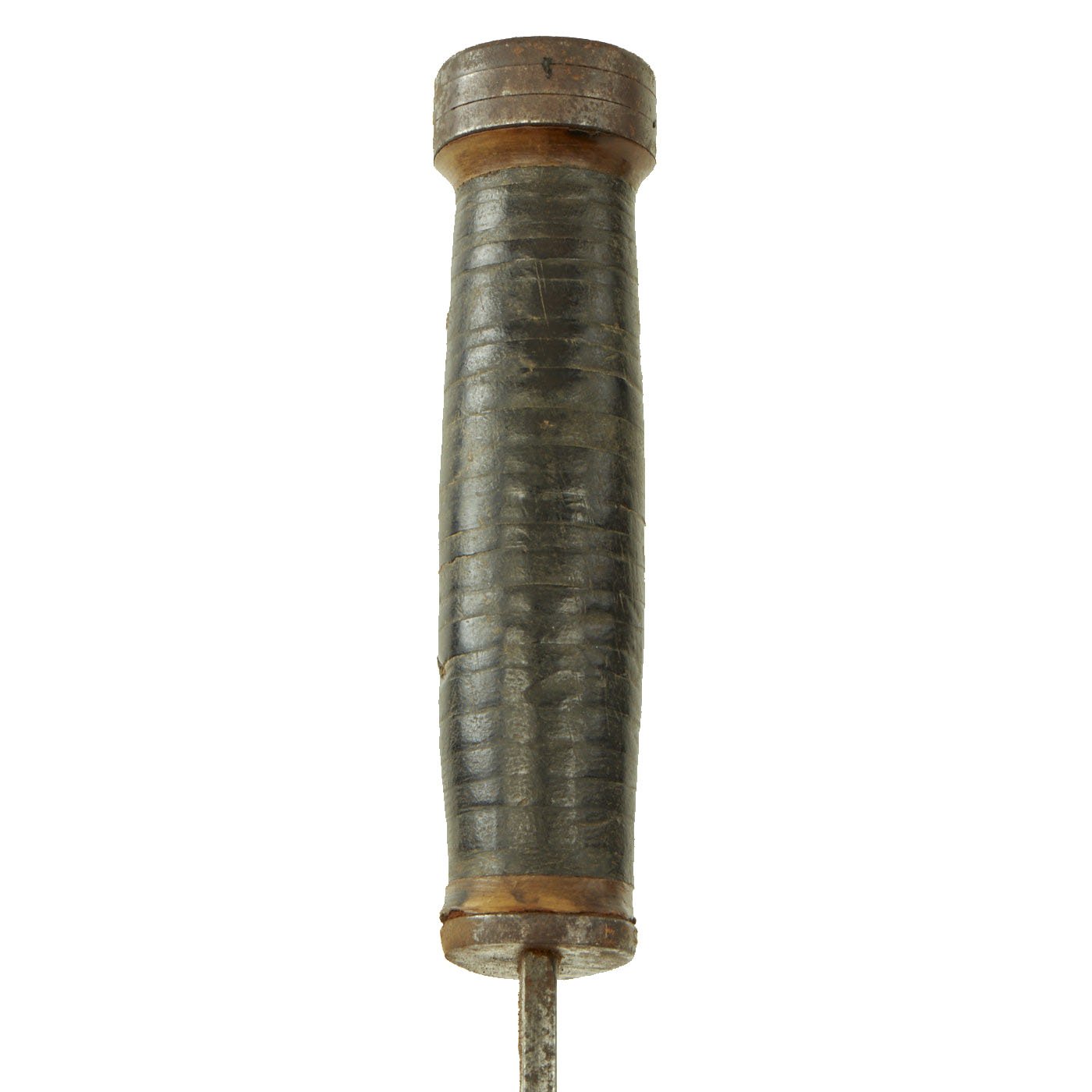 Original Item: Only One Available. This example is offered in good service used condition and comes complete with the original issue leather sheath. The finish on the blade is good, but repeated cleaning has made the original markings on the blade ricasso faint. It is however still quite sharp. The leather grip is now stained dark, but does not have any major damage. The plastic washer closest to the crossguard has cracked, probably from rust on the crossguard. The pommel is now slightly loose.