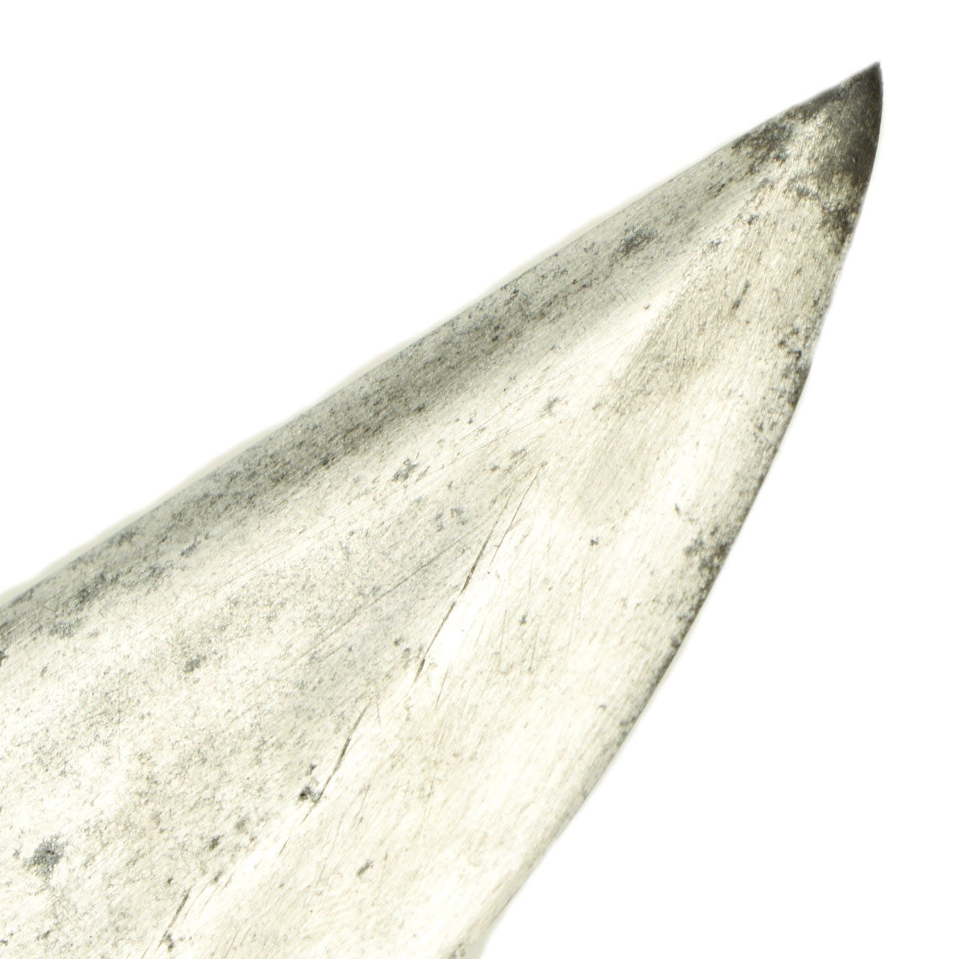 The scabbard is in good shape, with a lovely dark brown color. All stitching and rivets are intact, though the leather has cracked around some rivets and on the securing strap. This was definitely a knife and scabbard that saw significant use.
