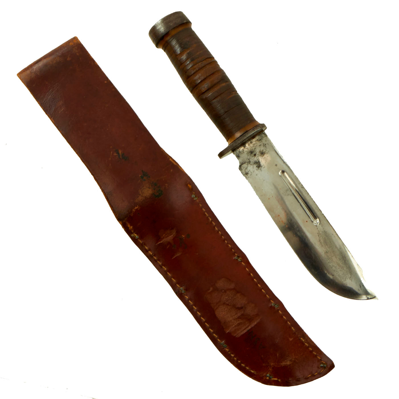 At the start of World War Two, it is a known fact that the U.S. forces were woefully under-prepared to wage a war on this large of a scale. In fact, a war this large had never been fought before, or for that fact ever since. Many new ventures would be engaged in to meet the production demands of such a large force. Knives were but one aspect of the new style war to be fought. It became immediately known that the U.S. forces were short of cutlery of all types. To meet this demand, it was decided to use whatever style could be put into immediate production. The early Marine Corps Raider knives were nothing more than Camillus hunting knives quickly popped out and sent to the newly formed group. Along these same lines the portion of the military tasked with purchasing all types of supplies was the Quartermaster Corps. The Army had their own Quartermaster Corps, as did the Navy, both of which cooperated, but were usually tasked with much different problems. In this specific task, they were both looking for the same type of vendor to produce an item in great need by all branches of the services. Fast production was needed. So a style of construction was chosen which would lead to little changes needed by the producing factories. This was a simple matter in choosing a stacked leather handle that had been in continuous production since at least the turn of the century. Other then that simple order, any six inch bladed hunting knife would do.