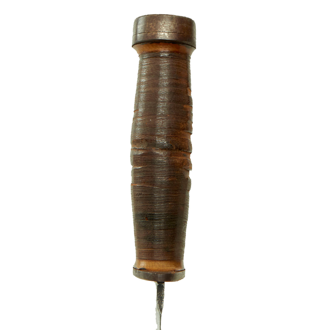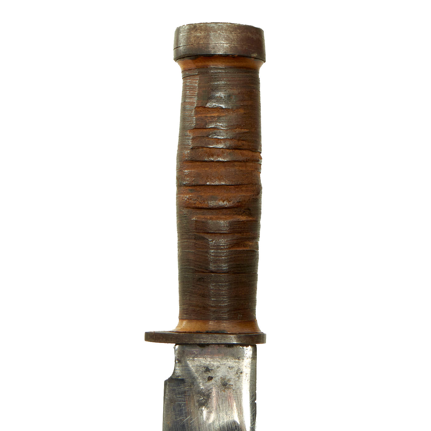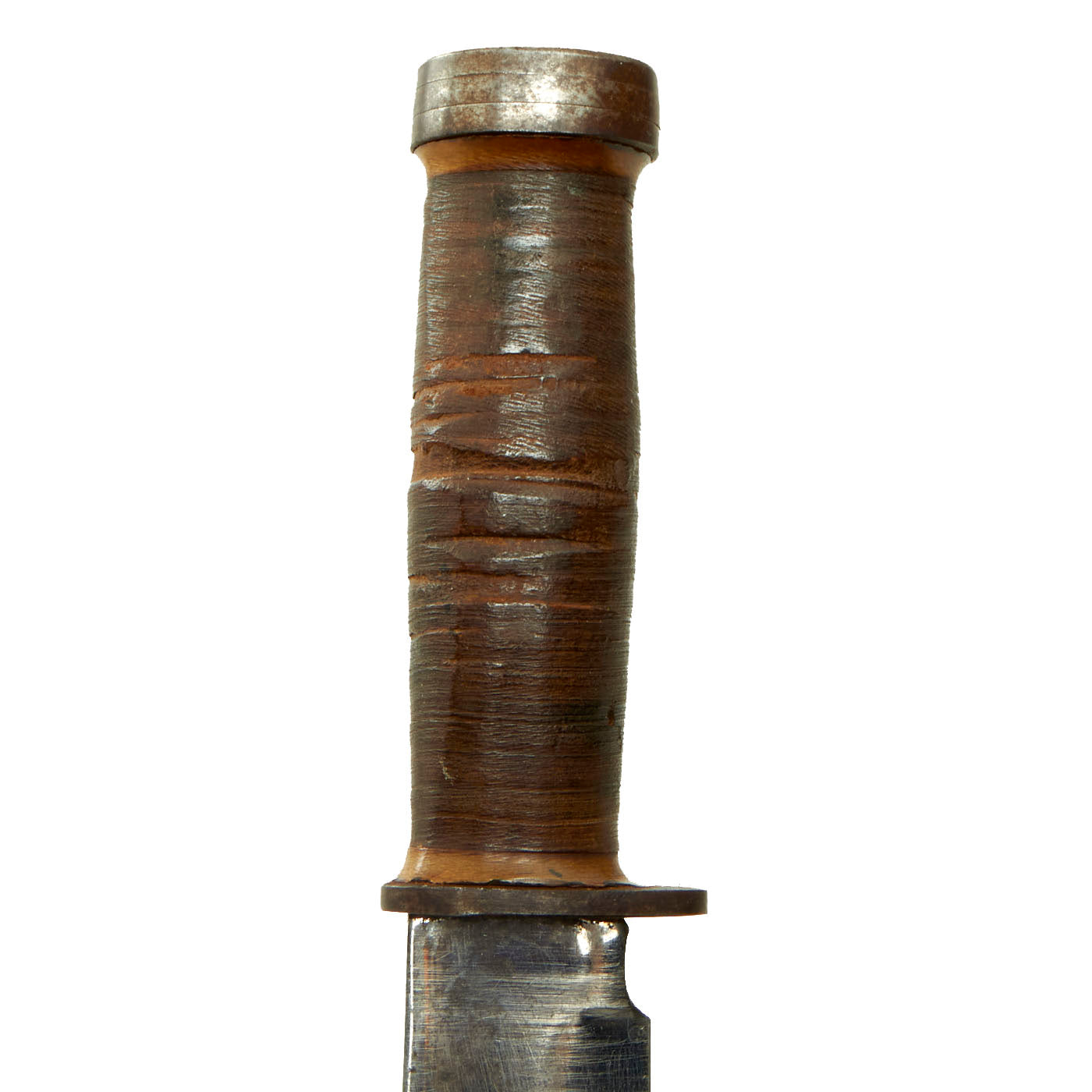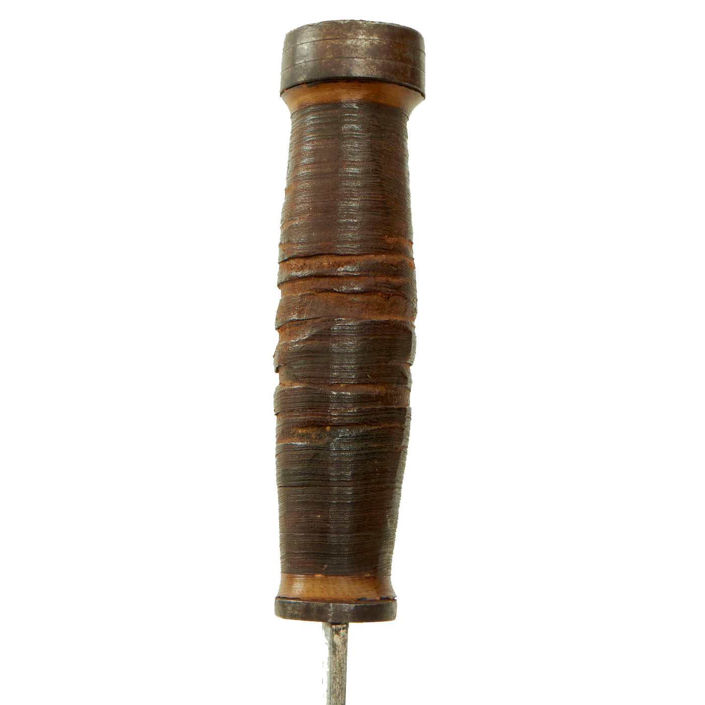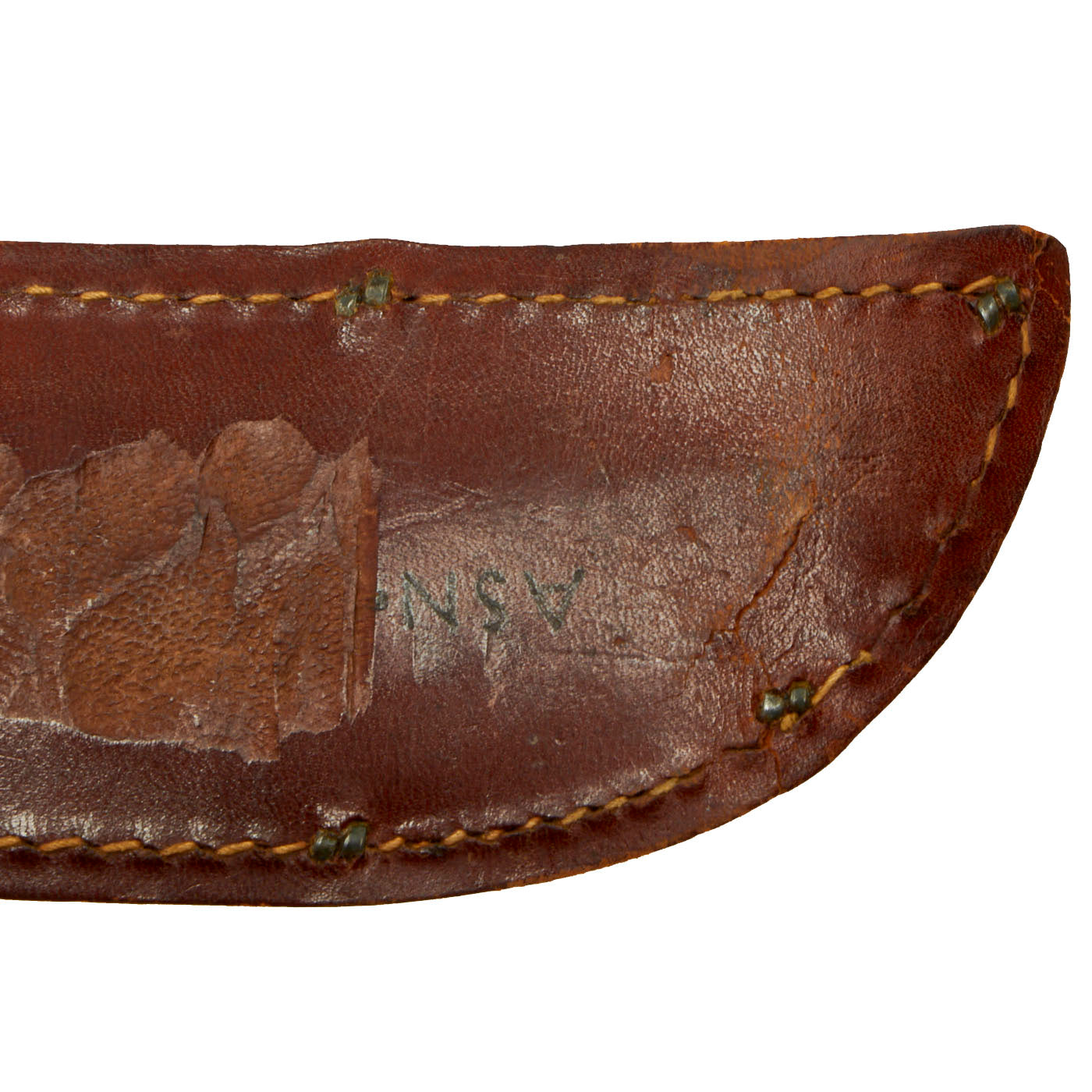 Original Item: Only One Available. This example is offered in good, service used condition and comes complete with the original issue leather sheath. The finish on the blade is good, but repeated cleaning has made the original markings on the blade ricasso faint. It is however still quite sharp. The leather grip is now stained dark, but does not have any major damage, but there is some chipping in the leather. The pommel is now slightly loose.