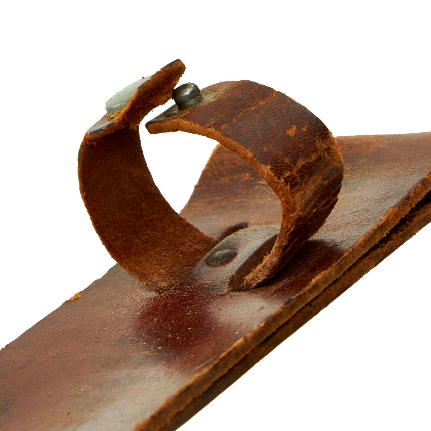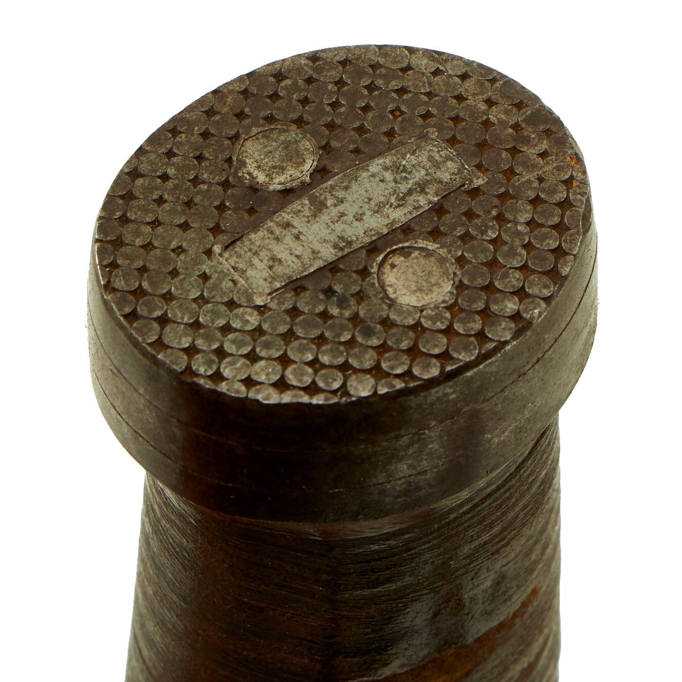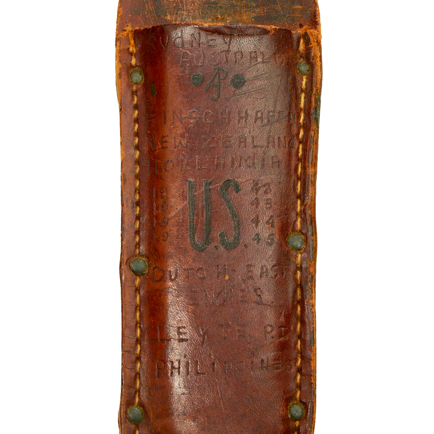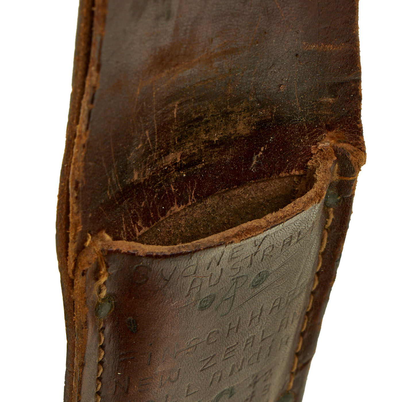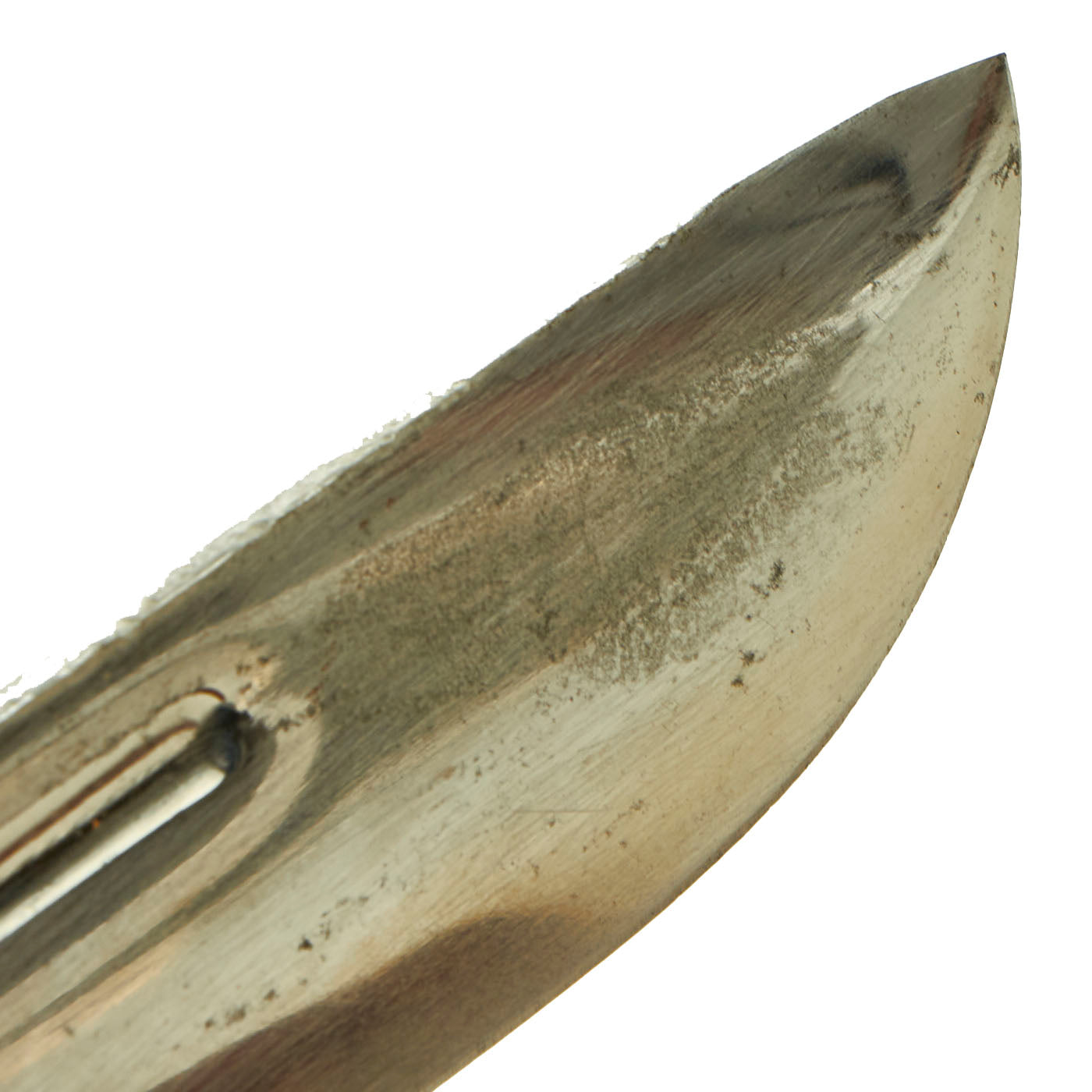 Original Item: Only One Available. This example is offered in good, service used condition and comes complete with the original issue leather sheath. The finish on the blade is good, but repeated cleaning has made the original markings on the blade ricasso faint. It is however still quite sharp. The leather grip is now stained dark, but does not have any major damage, but there is some chipping in the leather. The pommel is now slightly loose.