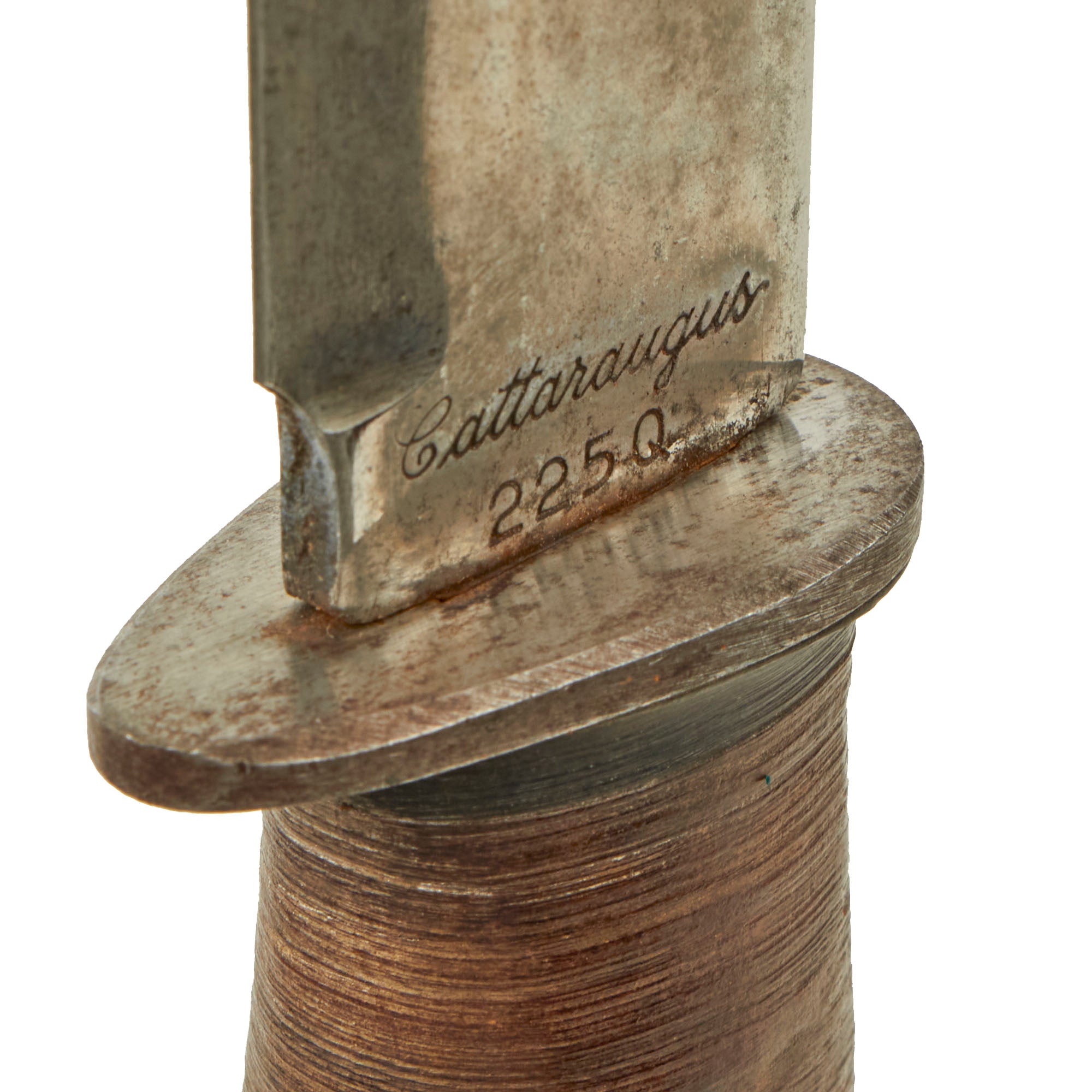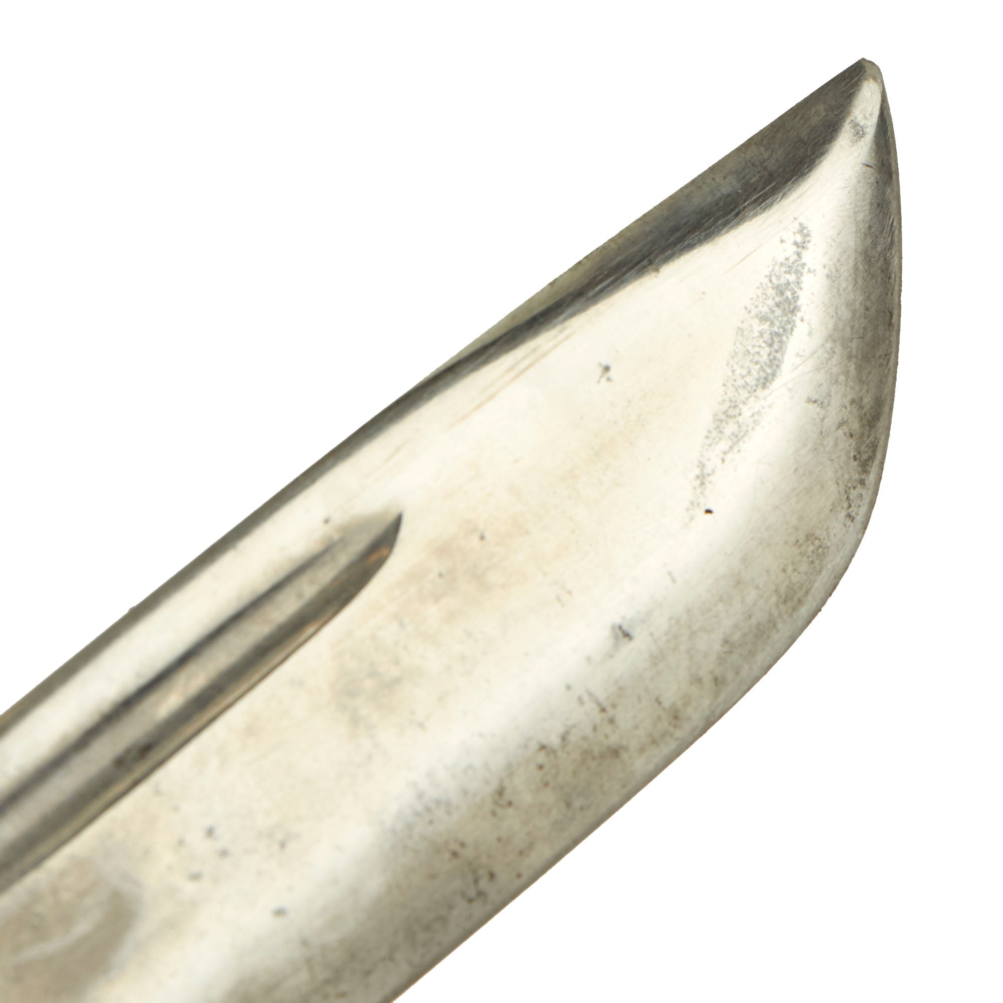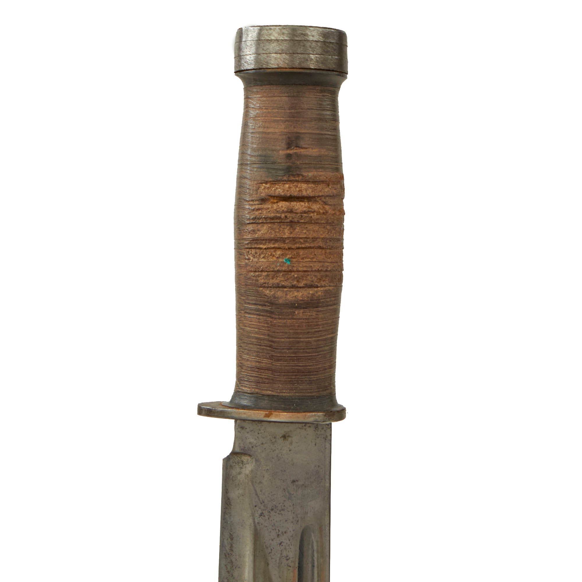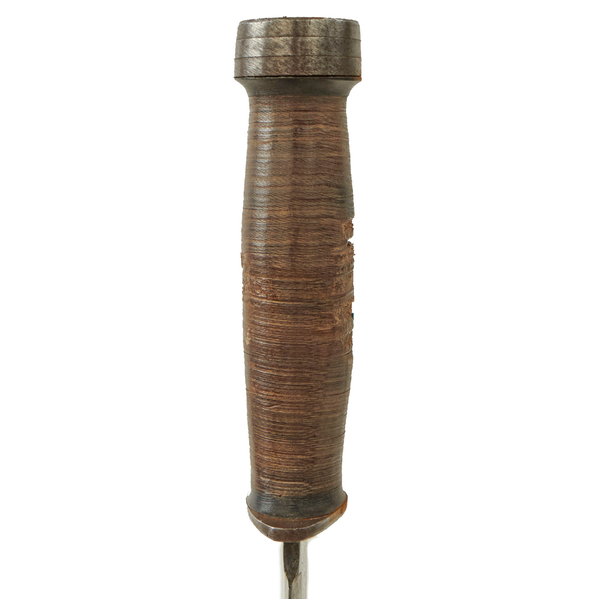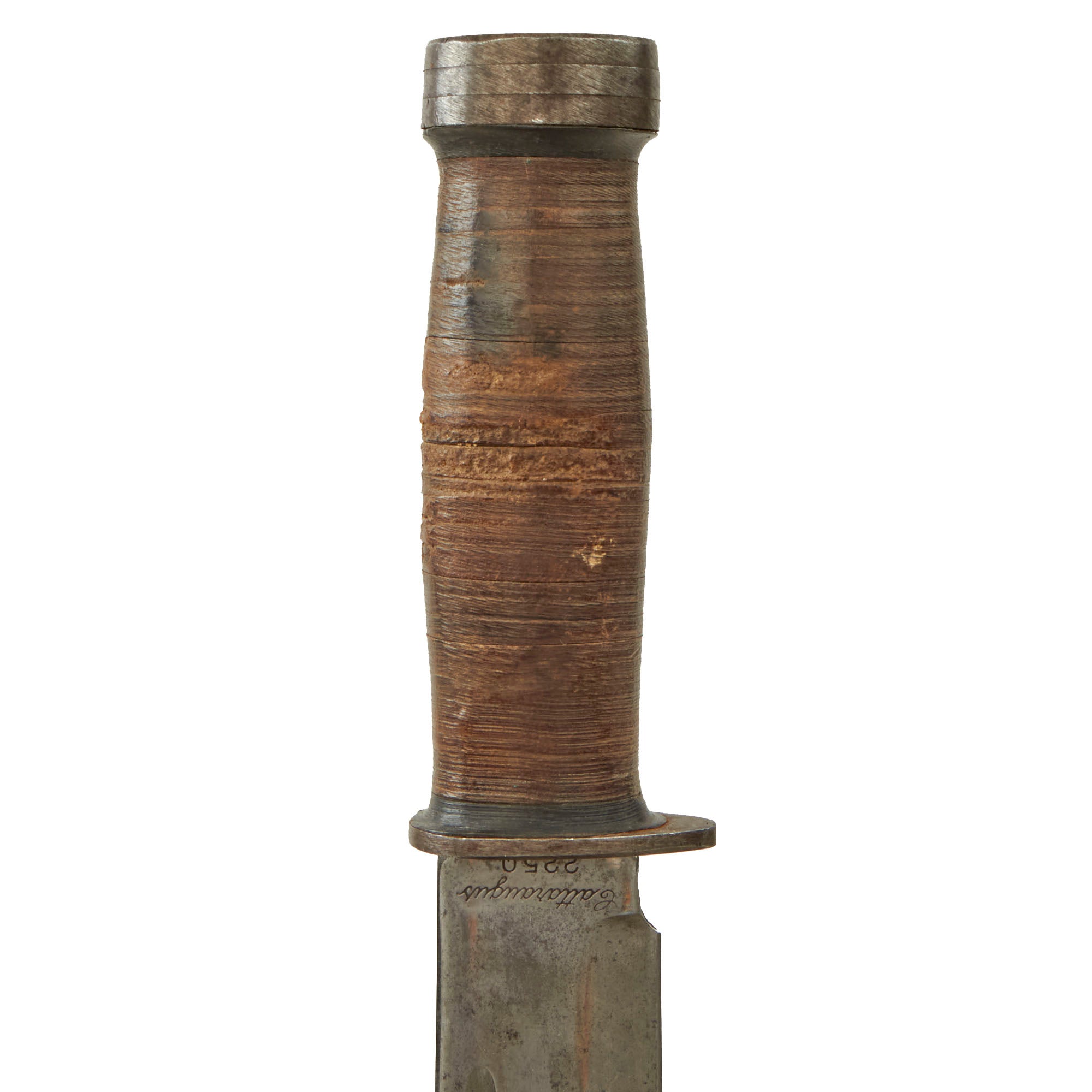 Original Item: Only One Available. This example is offered in great, service used condition and comes complete with the original issue leather sheath which shows service use without much damage. The finish on the blade is good with good markings, but there is some heavy wear and cleaned oxidation. It is however still quite sharp. The leather grip is now stained dark with white spotting, with some heavy chipping in the leather finish. The pommel is still tight to the hilt.