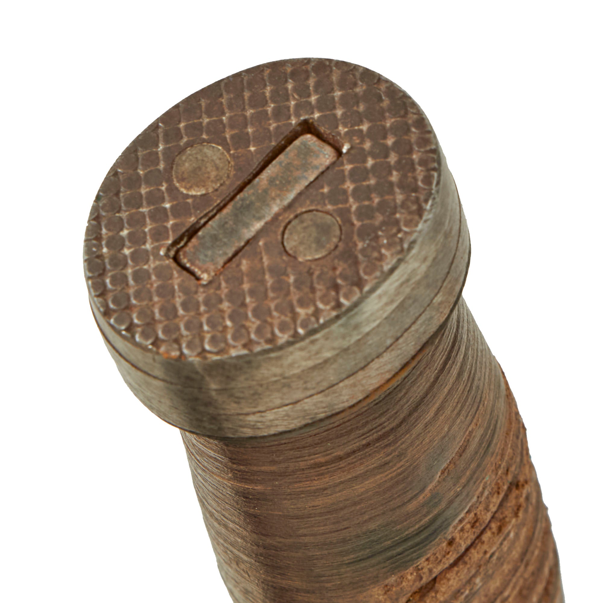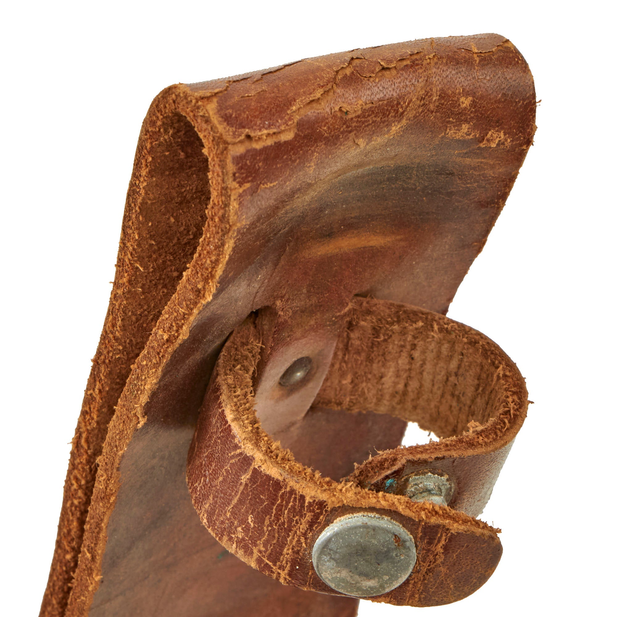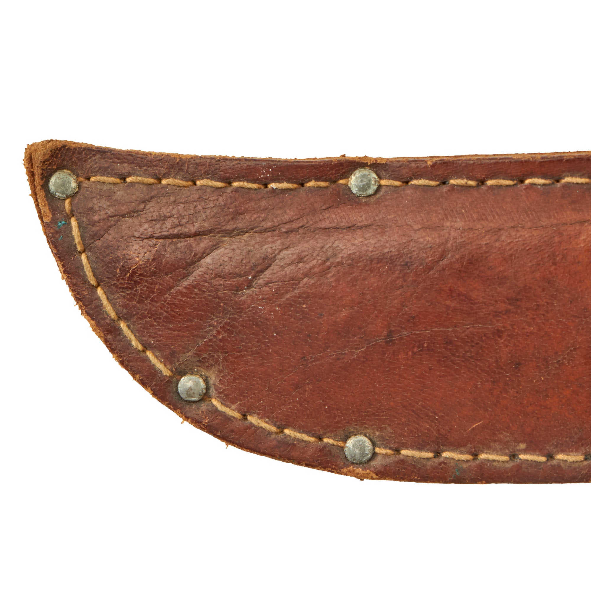 The sheath is in good shape, with a lovely light brown color. All stitching and rivets are intact, though the leather has crazing around some rivets and on the securing strap. This was definitely a knife and scabbard that saw use. The leather is a it crazed and stiff but still presents well.