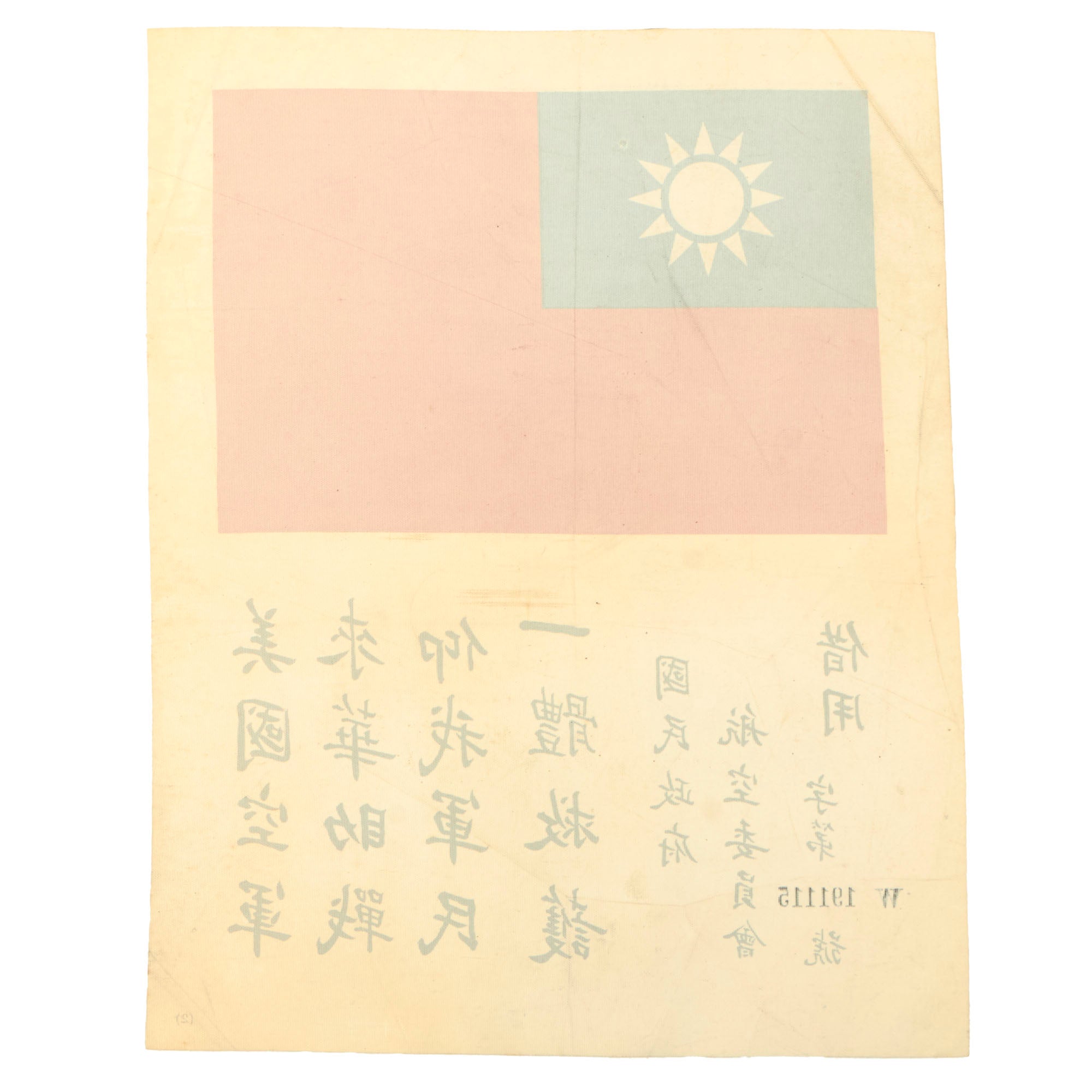 - Very nice silk/rayon Blood chit with Chinese National flag. This example is serial numbered W191115 and measures 7½ x 10”. This example has virtually no flaws.