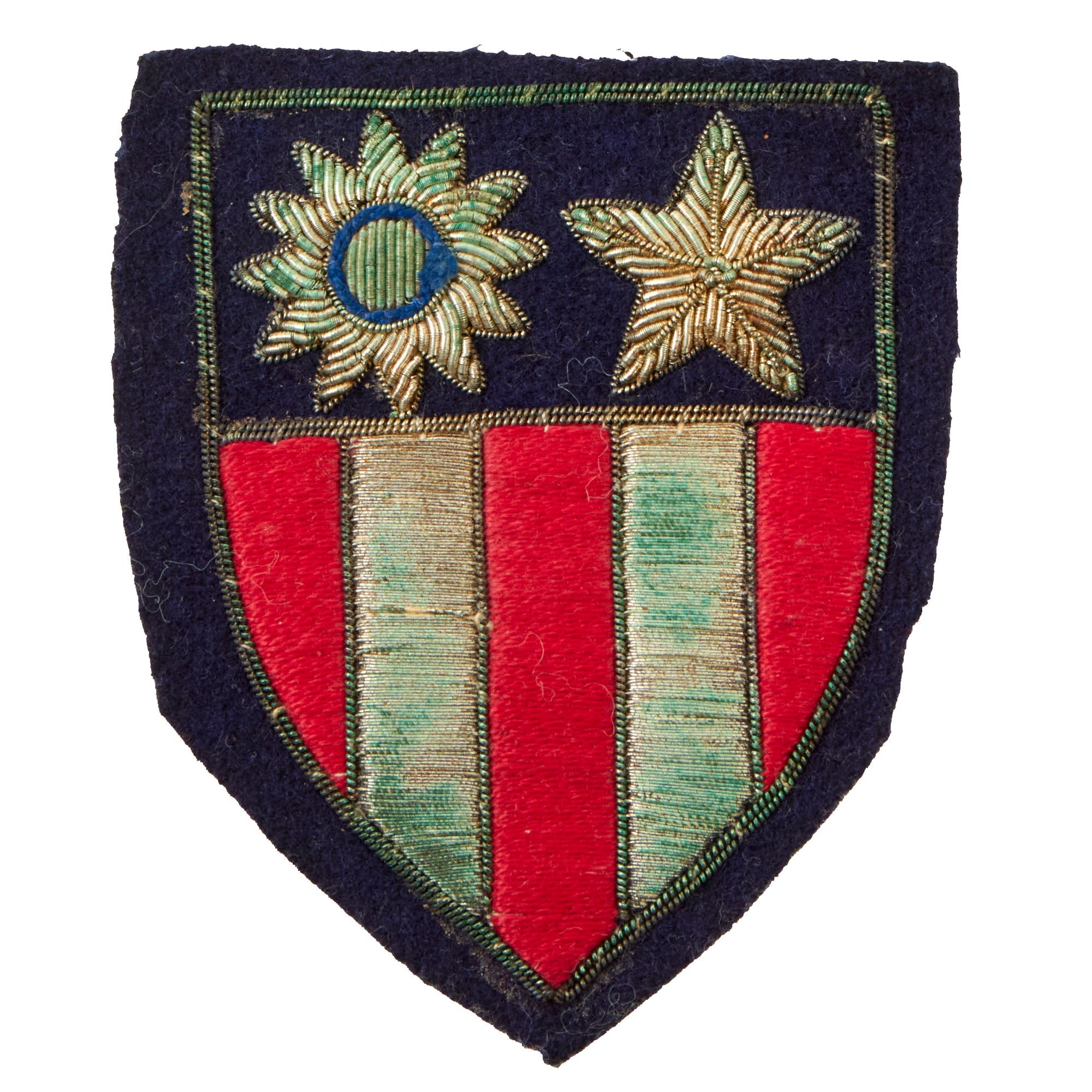 - Gorgeous theater-made China-Burma-India (CBI) patch made from bullion which has oxidized to a nice green color.